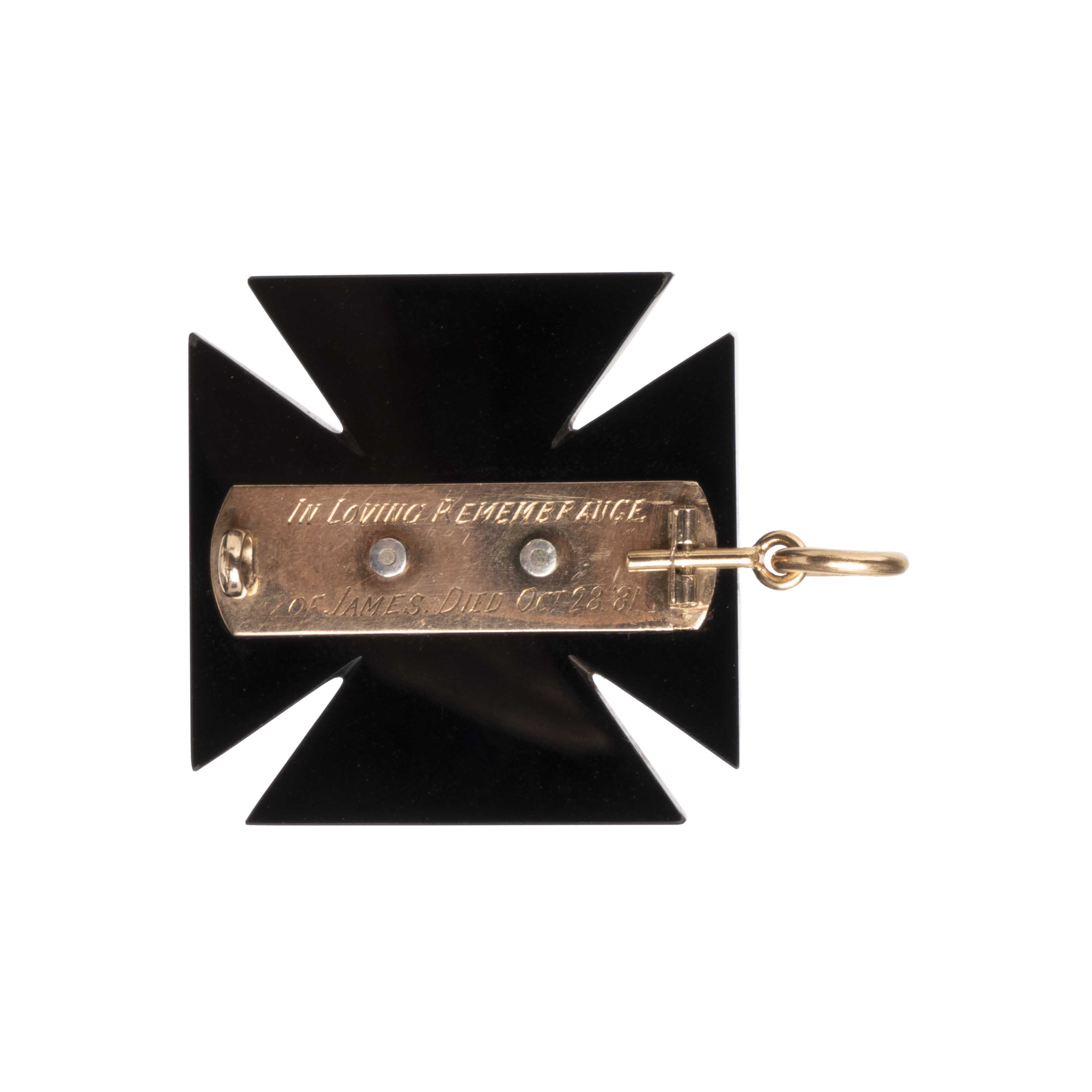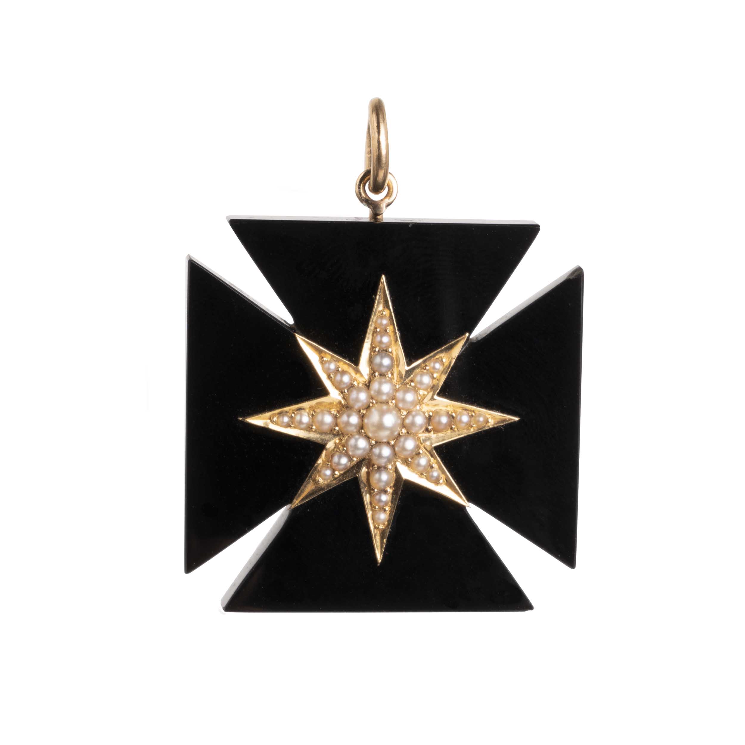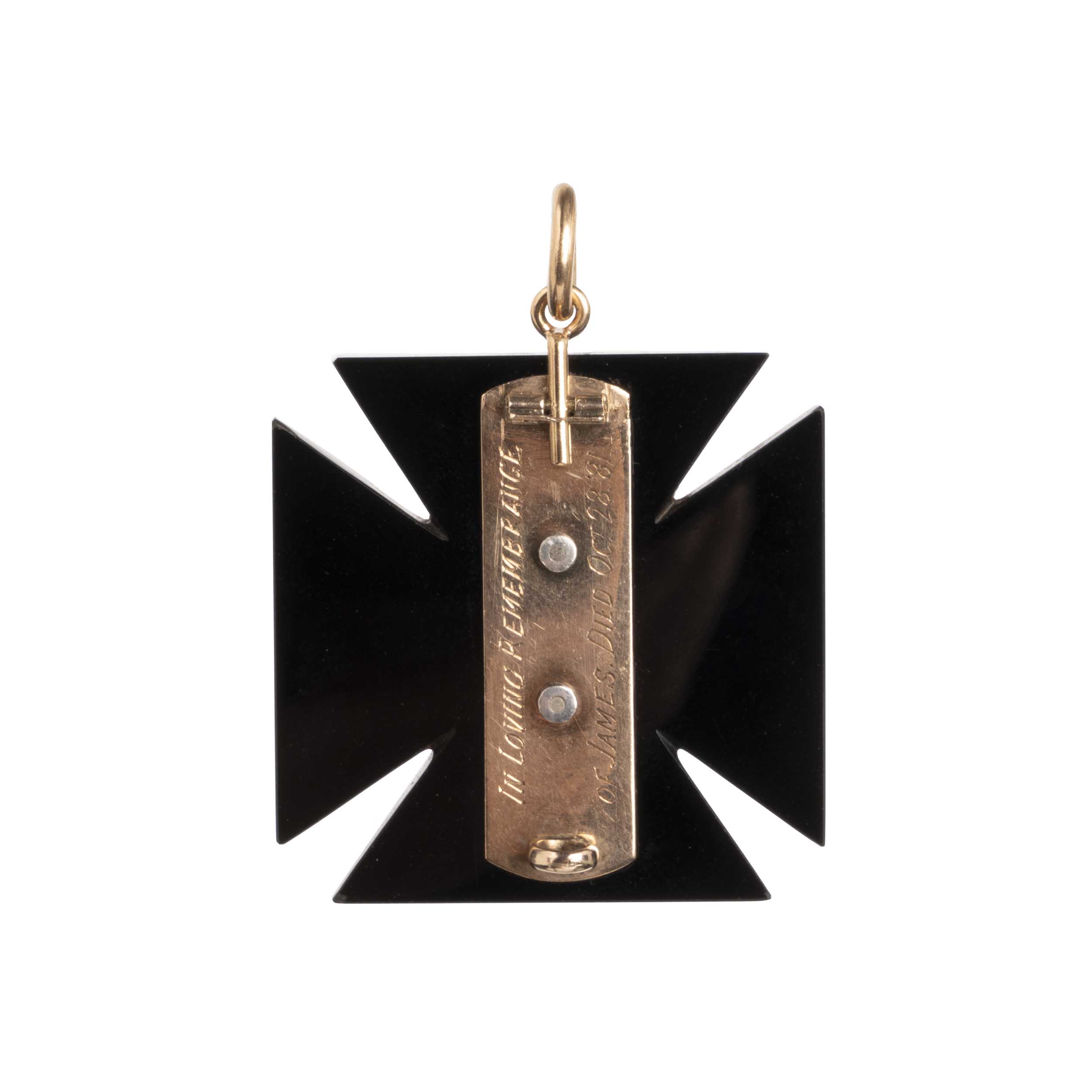 Victorian era onyx Maltese cross pendant, in 18k gold. It is a mourning piece with a pearl star engraved on the verso, which reads, "In loving Remembrance of James. Died Oct. 28, 1881". English in Origin.