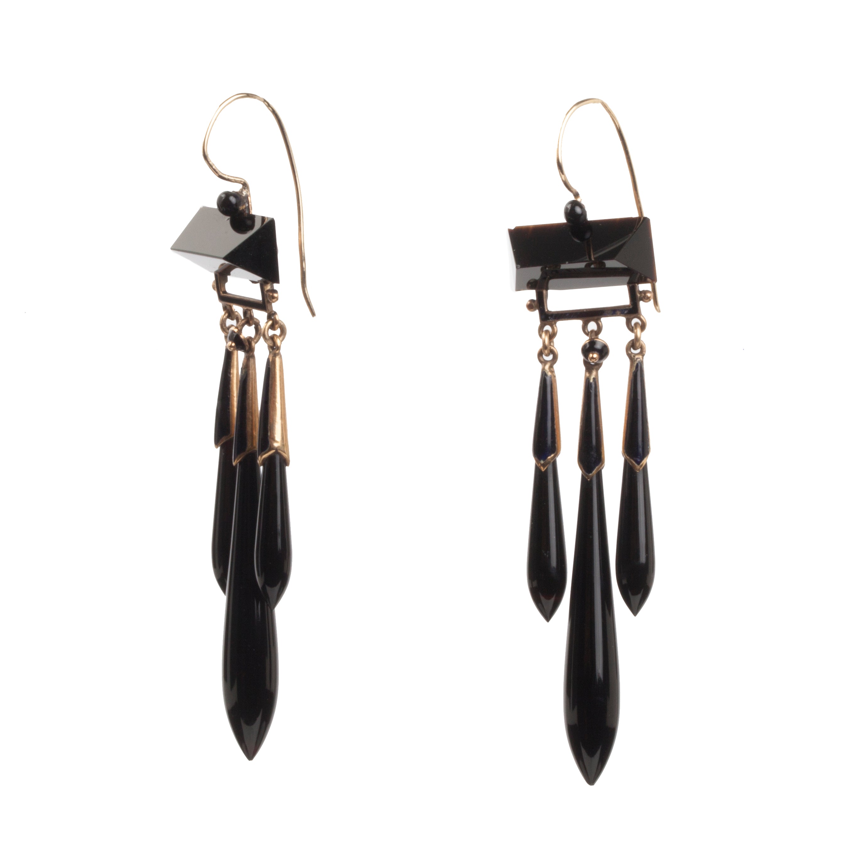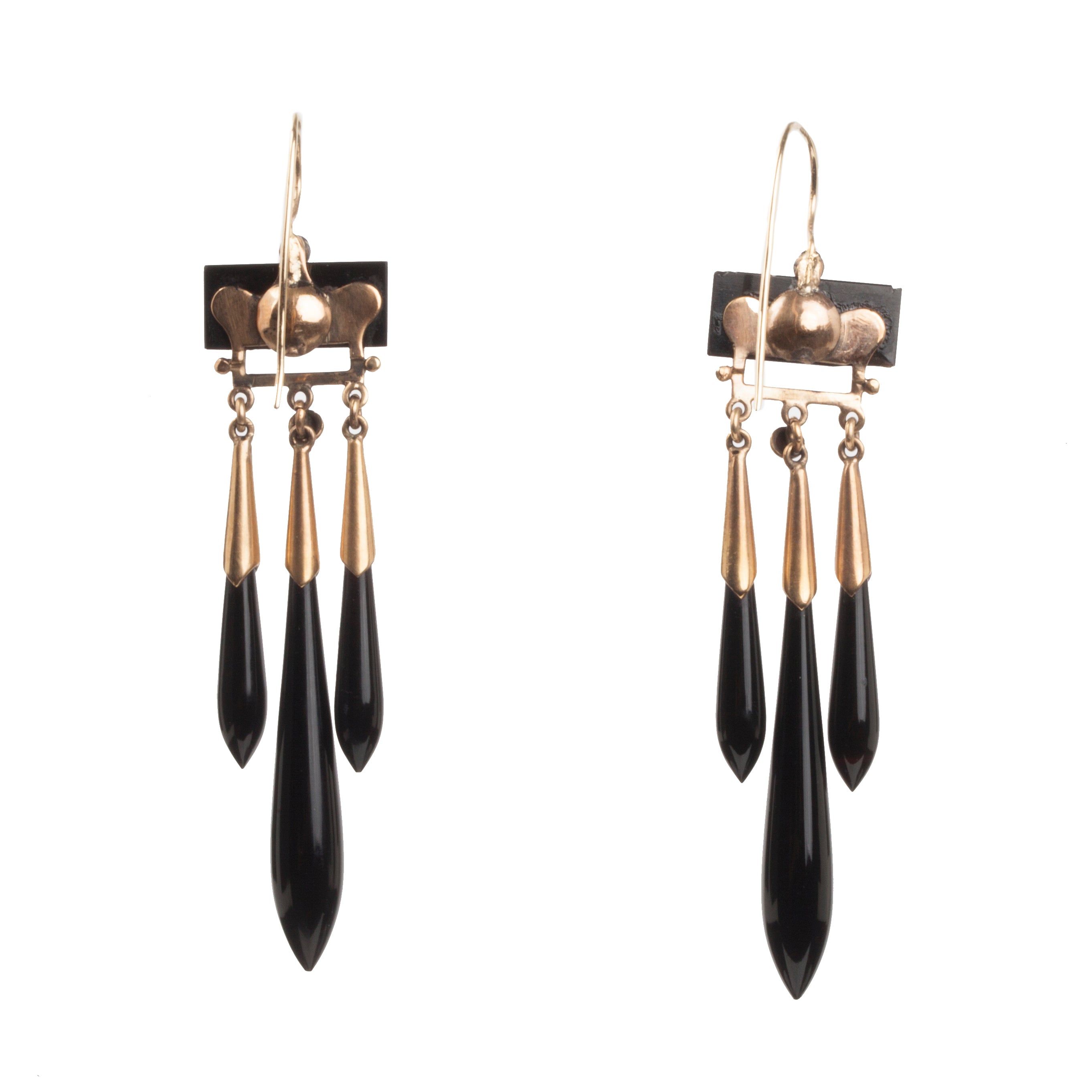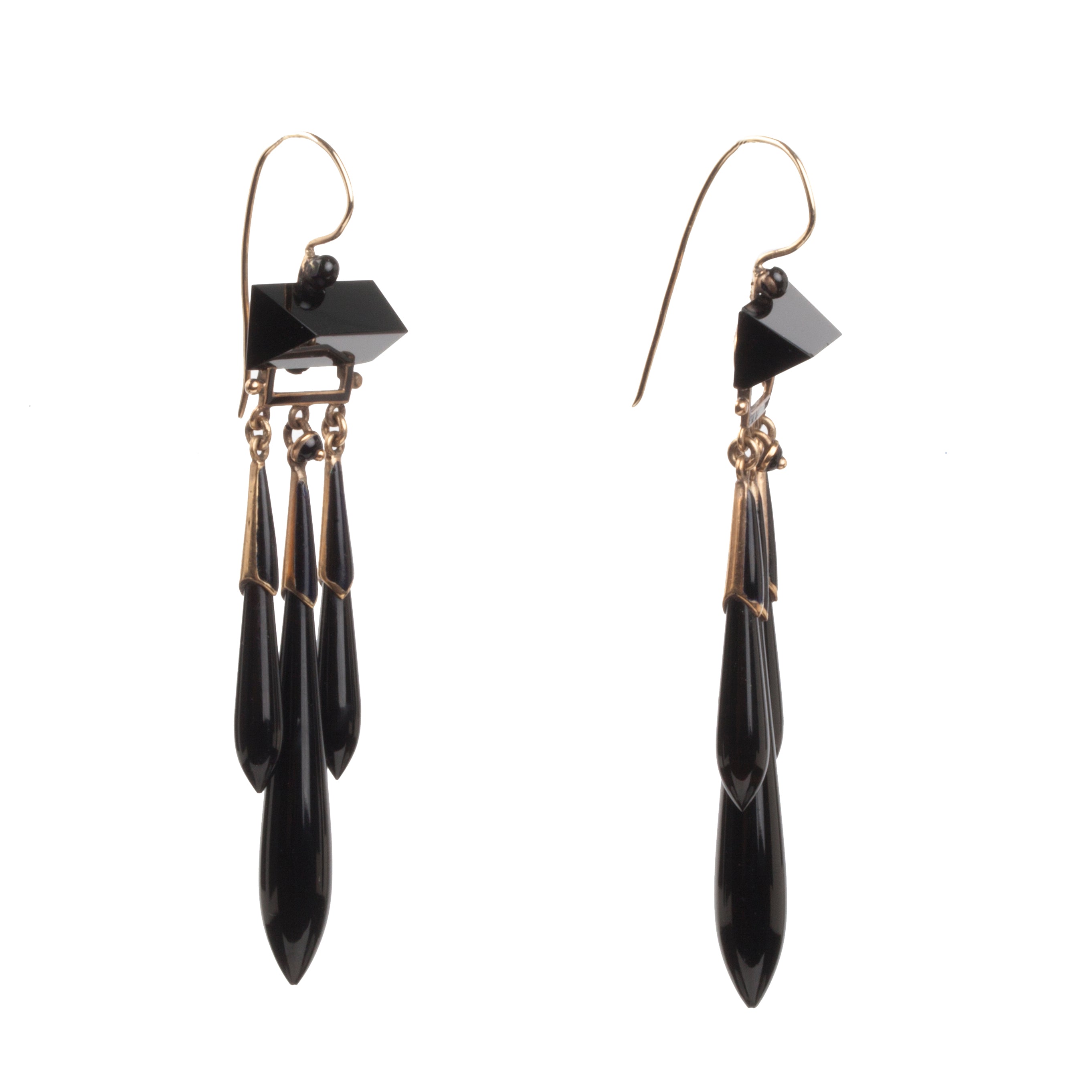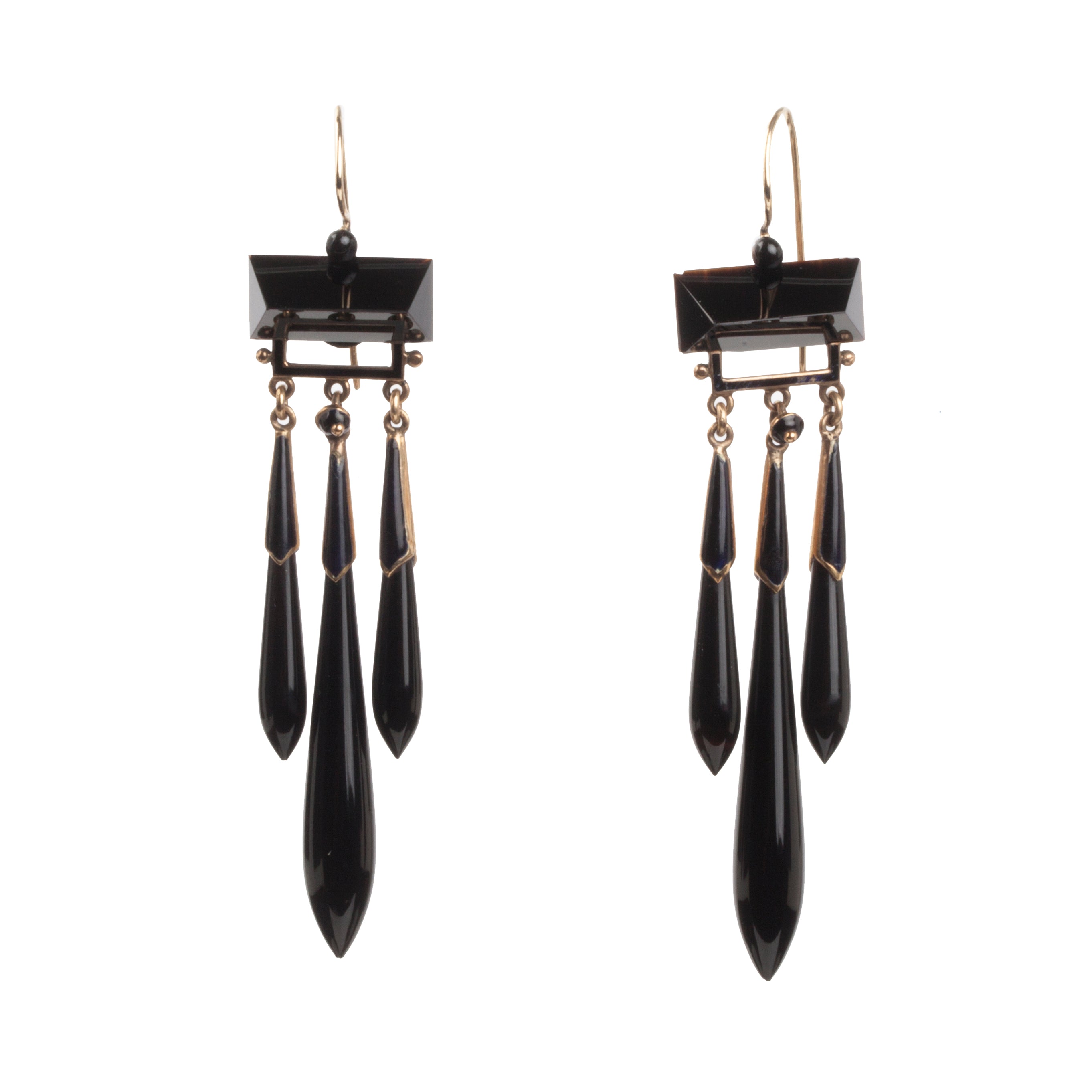 Victorian era onyx and gold earrings. Three drop motif with geometric onyx top and tear drop tassels. On gold french hook earrings. English in Origin, Circa 1870
