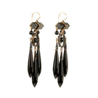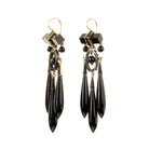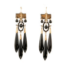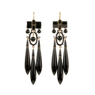 Intricate details with onyx stones, black enamel and 18k gold. These earrings have amazing movement when worn. English in origin. Circa 1870.