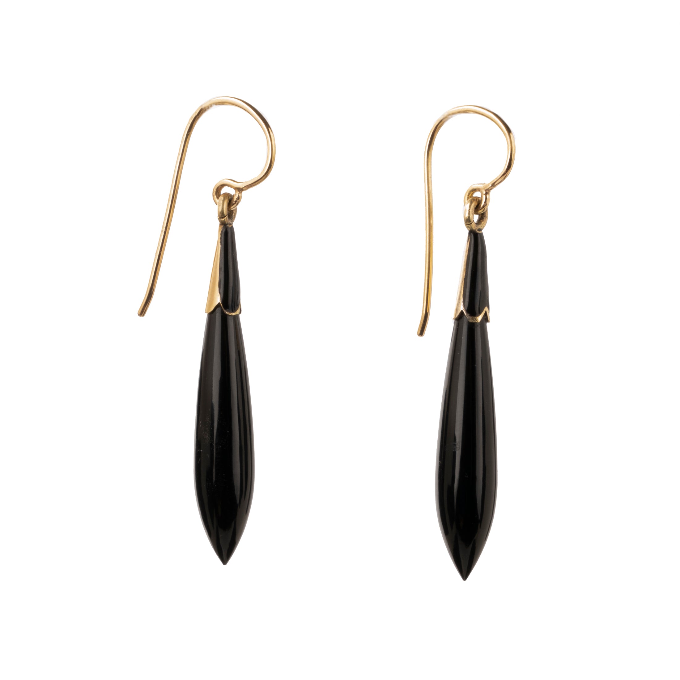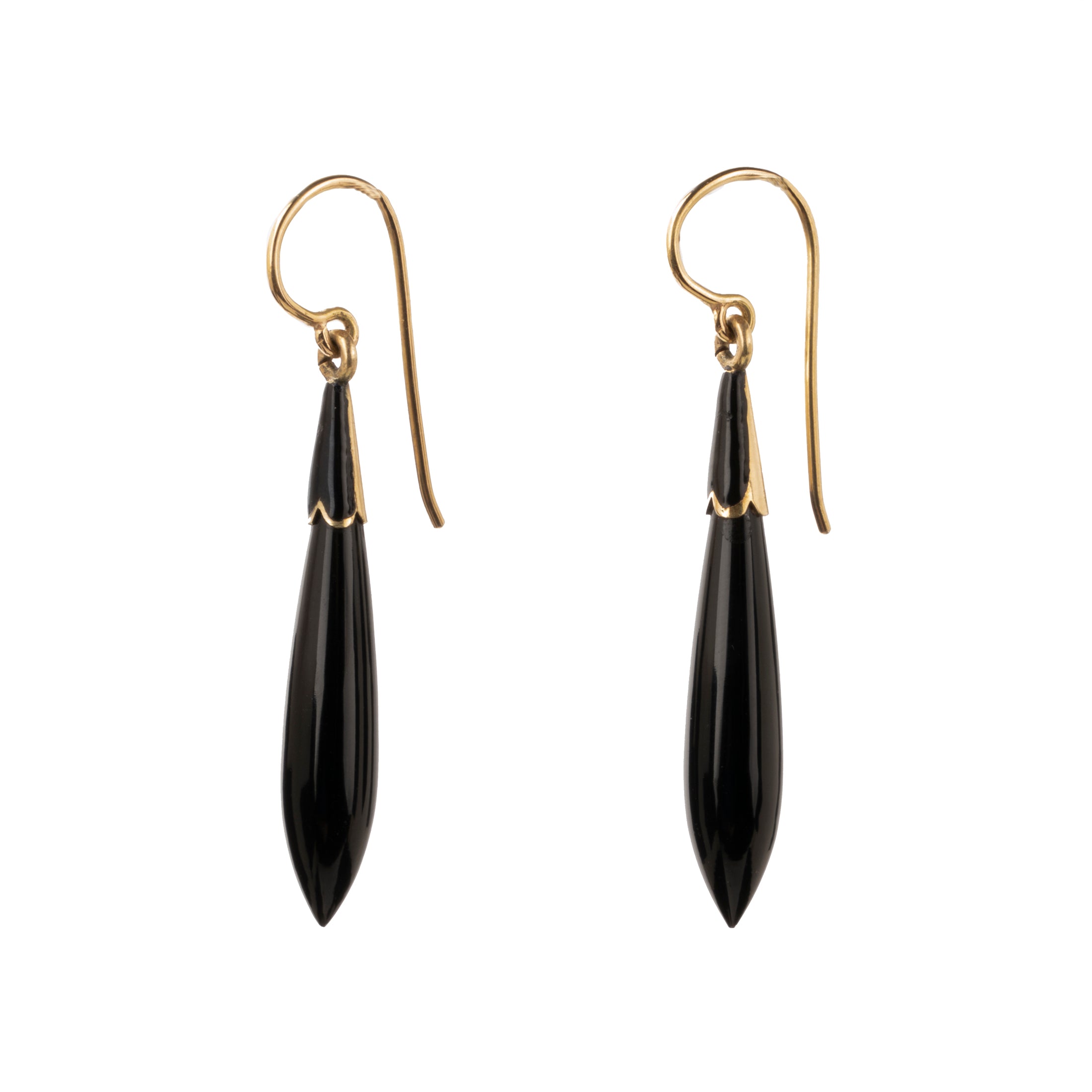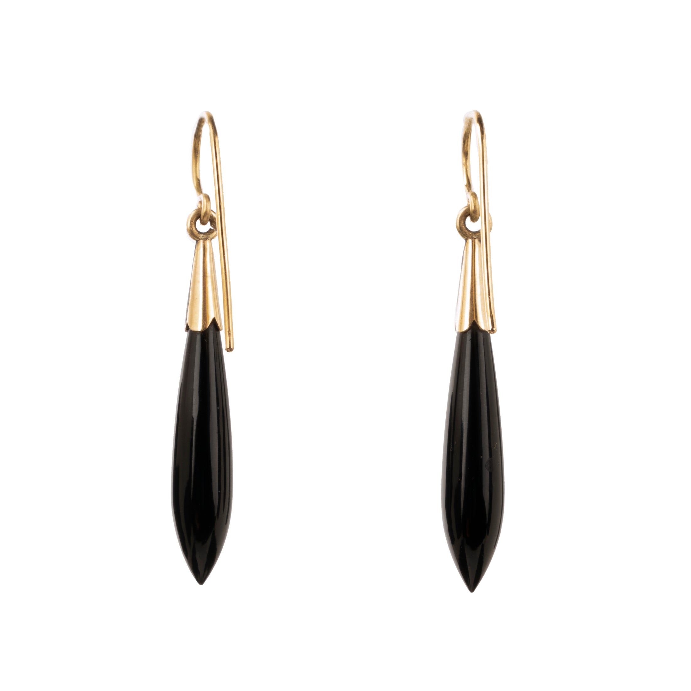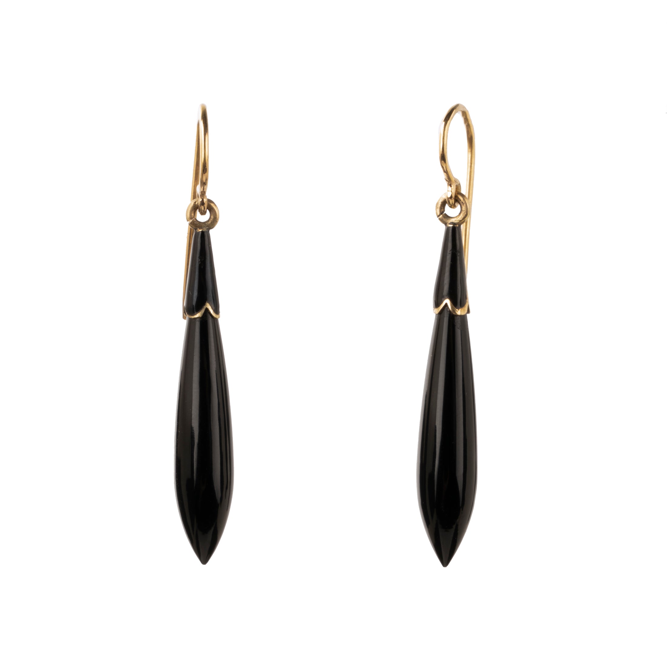 Victorian era onyx drop earrings, with black enamel details, in 18k gold. English in origin. Circa 1870.