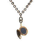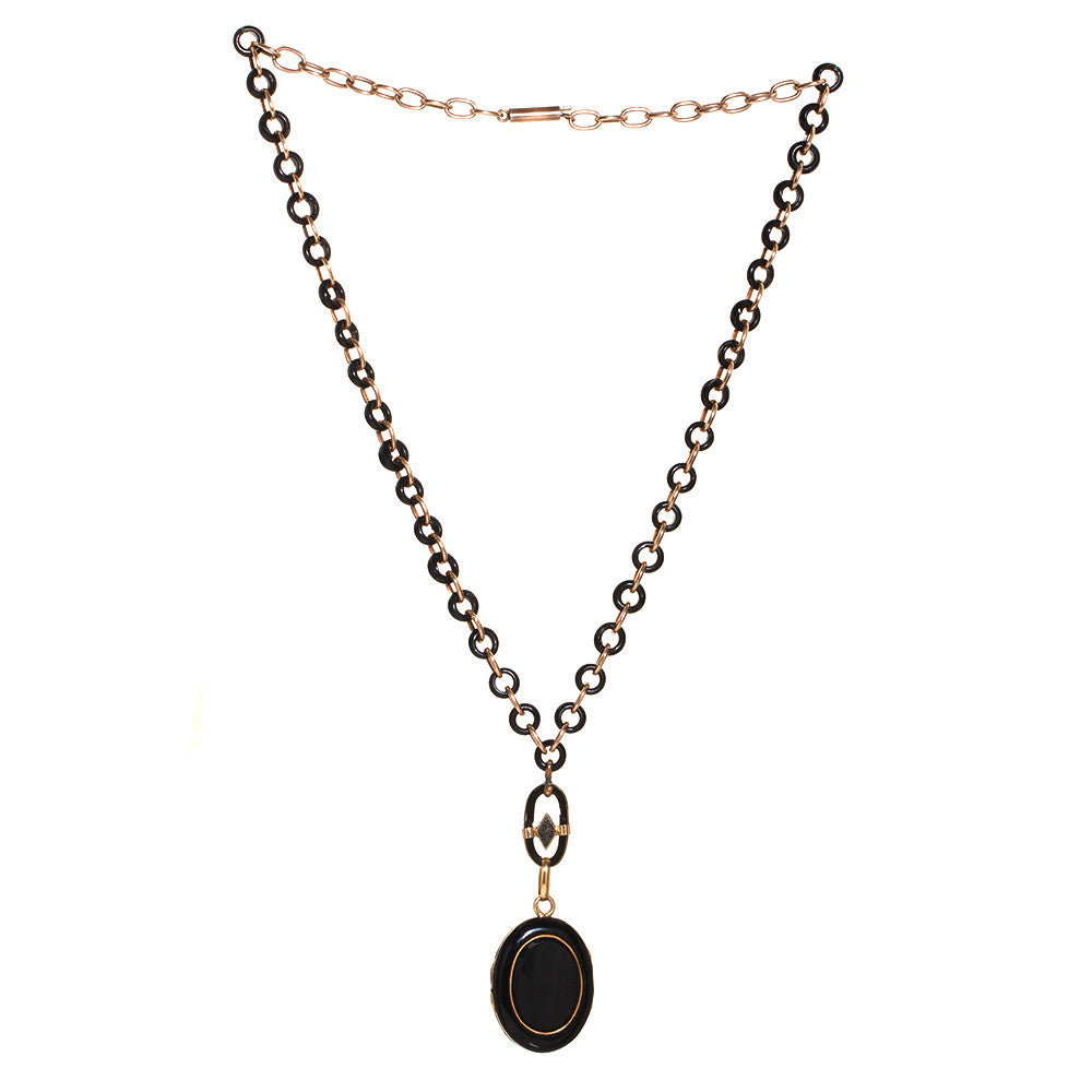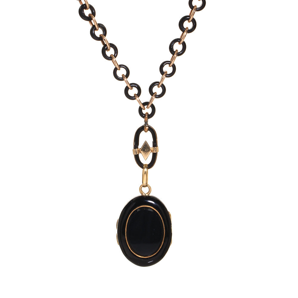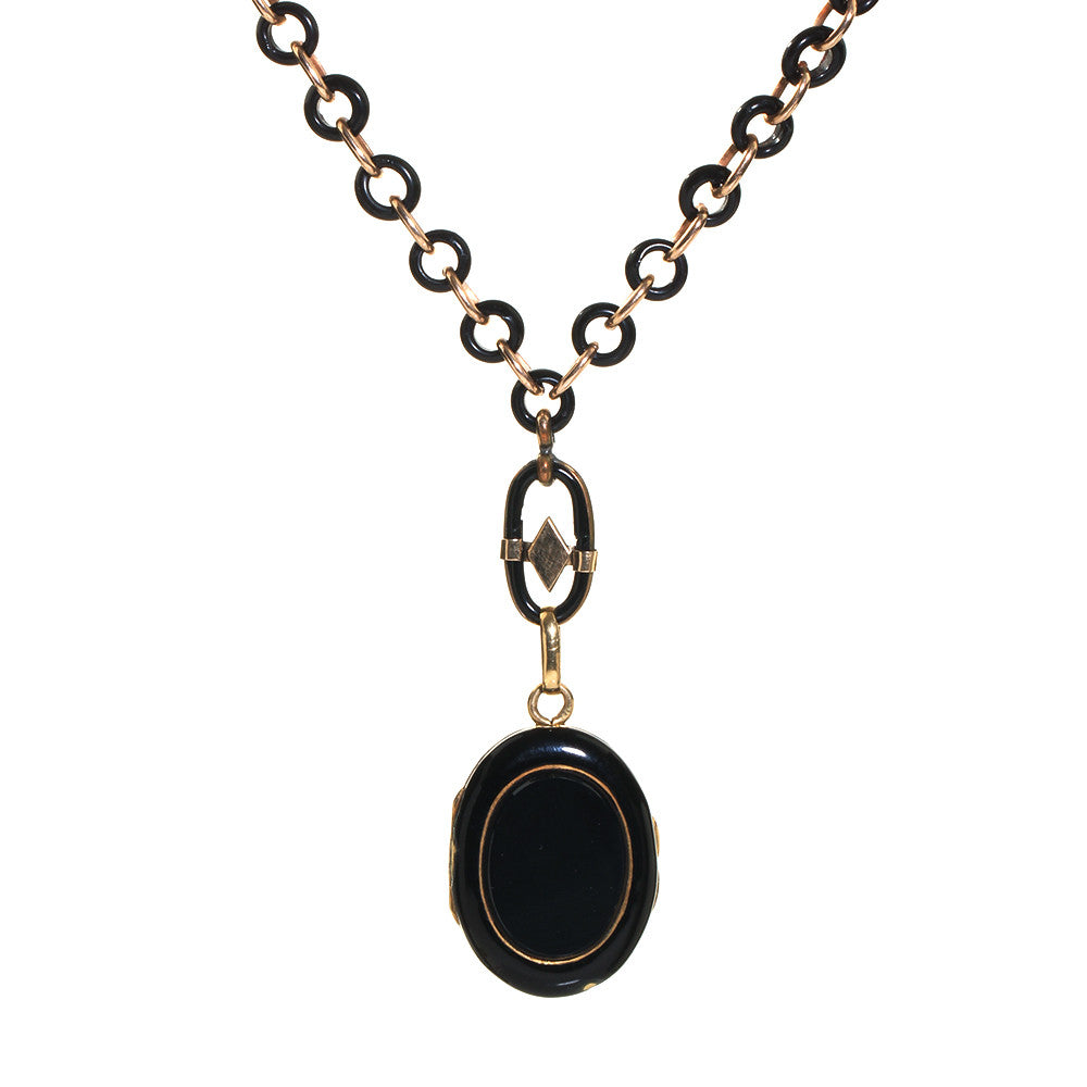 Victorian Onyx, enamel & Gold Locket on original glass & gold linked Chain. Necklace length 18.5" and locket length 1.25".