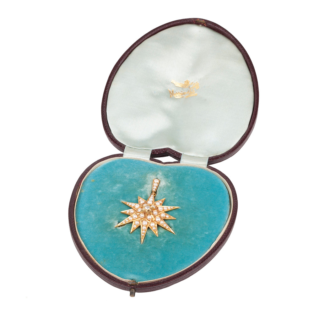 Victorian Era pearl and diamond star burst pendant, in gold. With a center round old mine cut diamond. Come with the original fitted 'Mappin & Webb' heart-shaped case. English in origin. Circa 1880.
