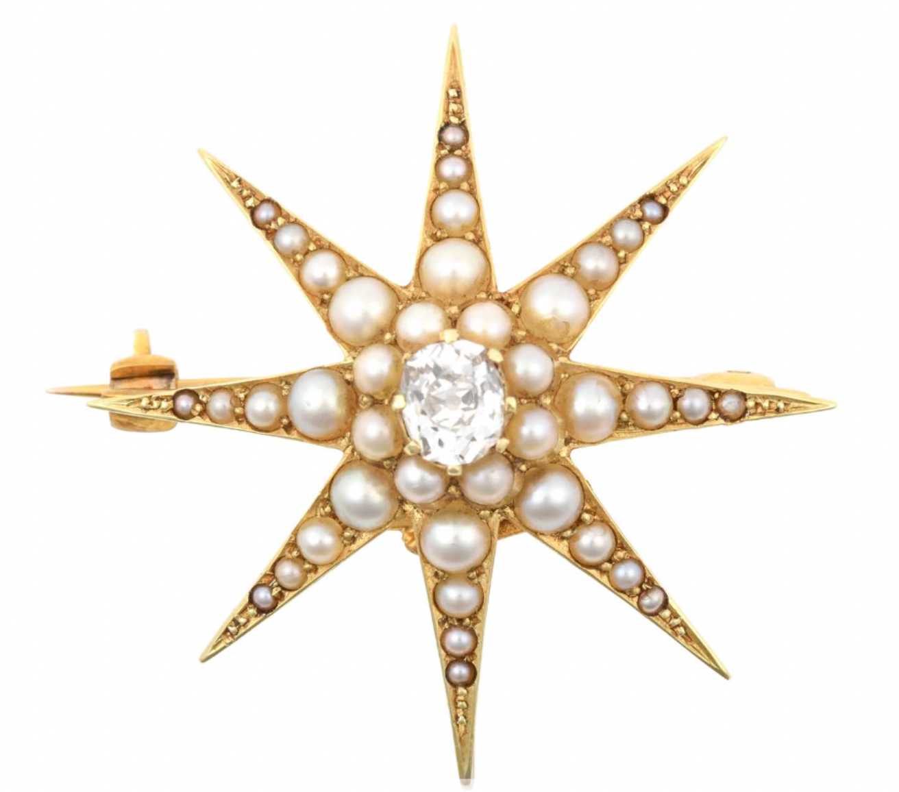 Natural split pearls and single old mine cut diamond in an 8 armed star in 18k gold. Diamond estimated .4 carats. English in origin, Circa 1880