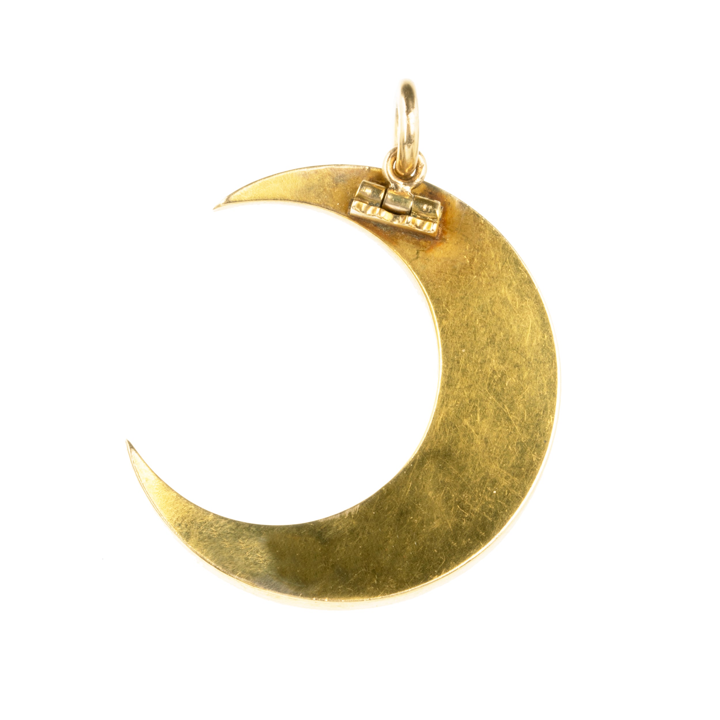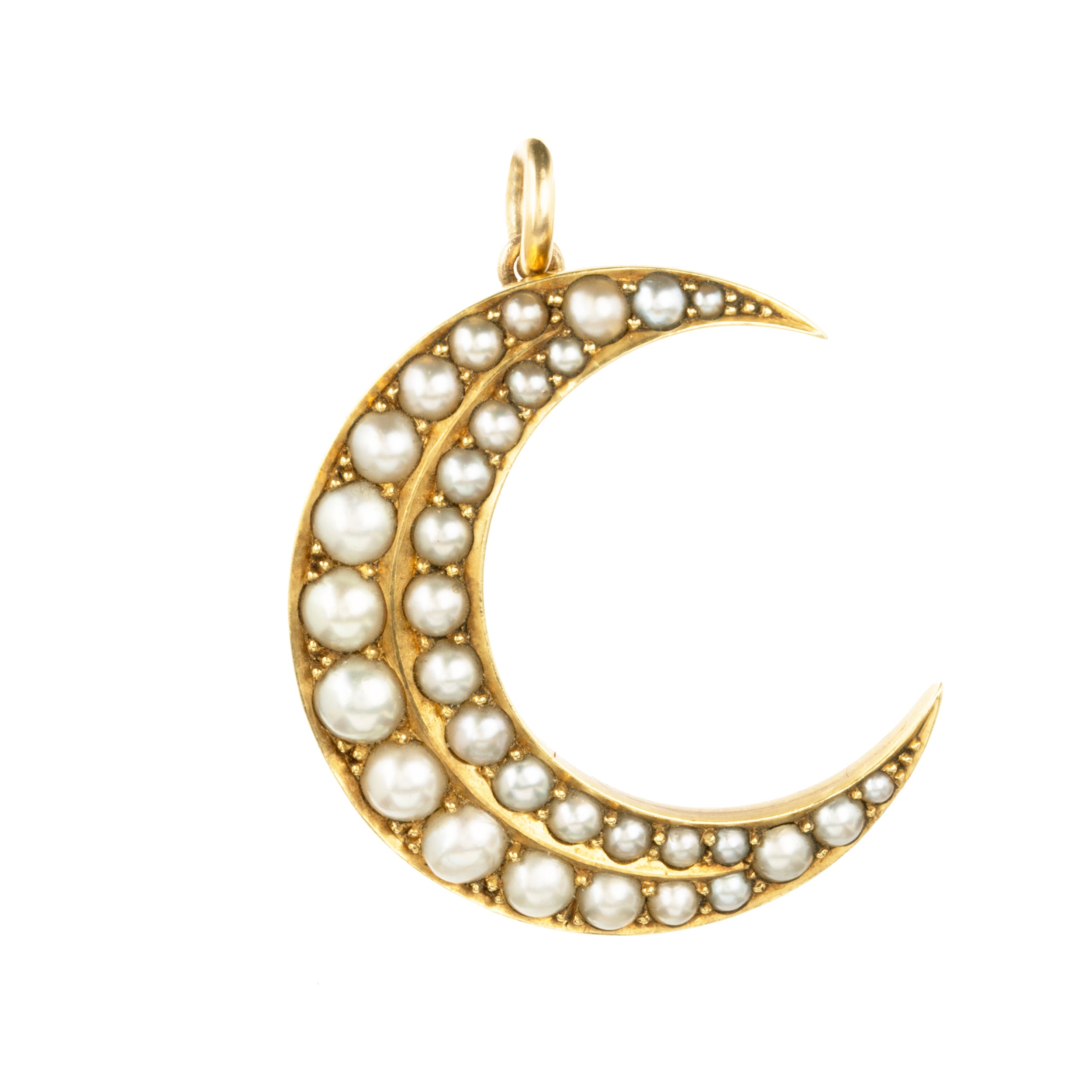 Victorian era pearl crescent moon pendant, in 18k gold with graduated split pearls. Originally a brooch, it was later converted into a pendant. English in Origin, Circa 1880.