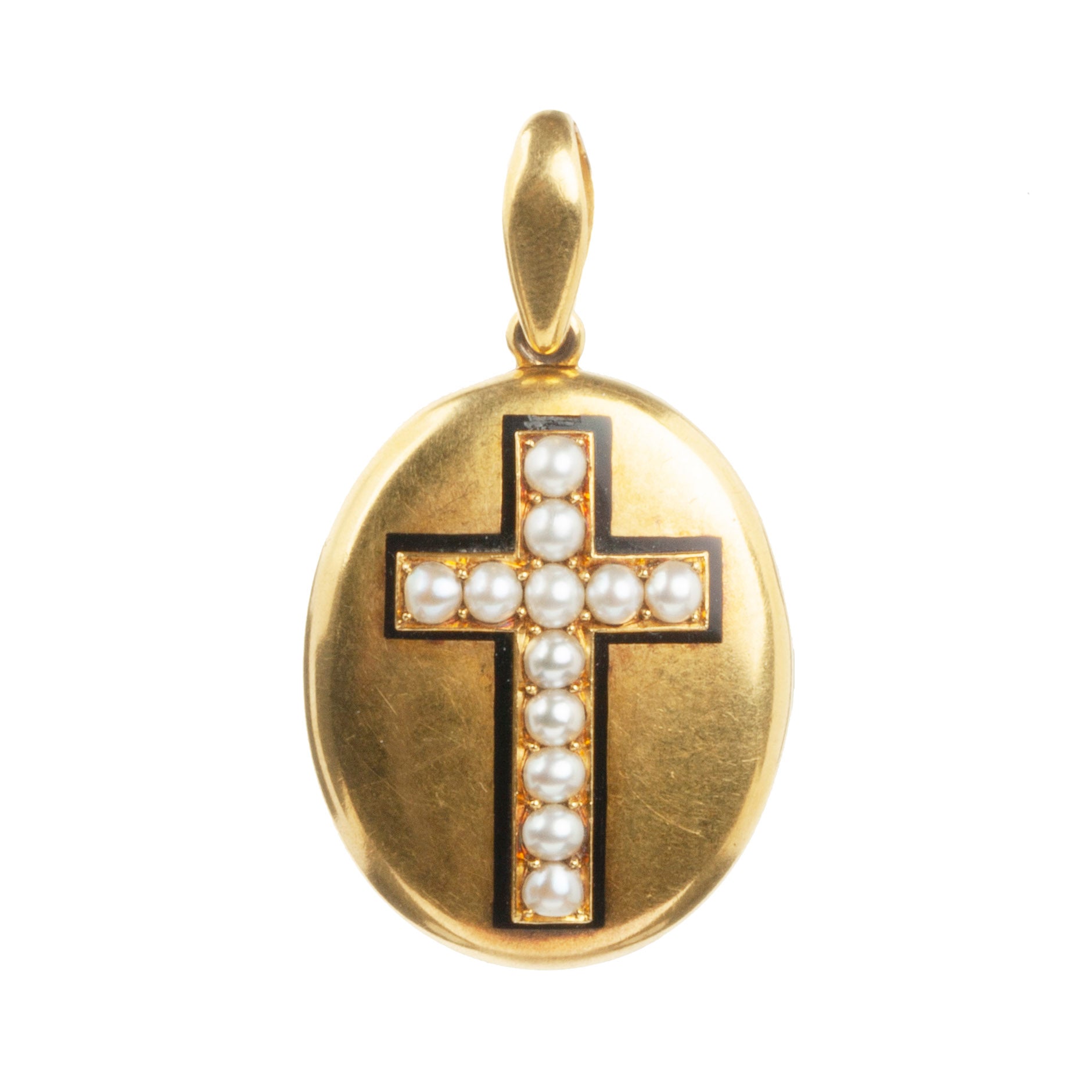 Victorian era locket with pearls and black enamel details forming a cross, in an 18k bloomed finished gold. The original frames and glass are intact and personal images can be placed in the locket compartments. English in origin. Circa 1870.