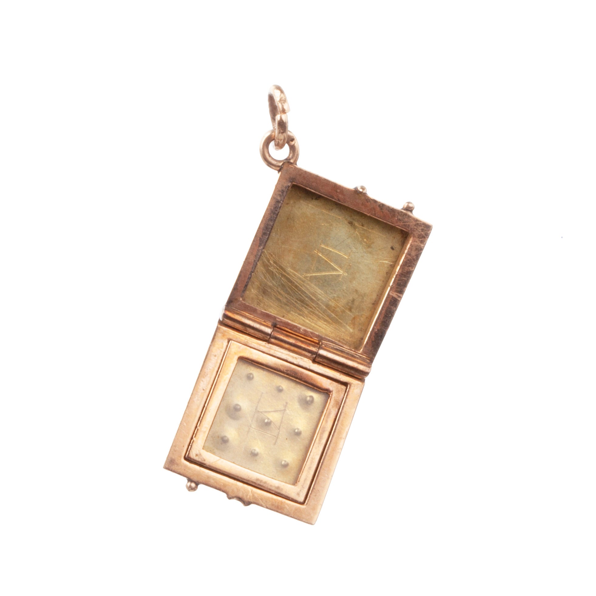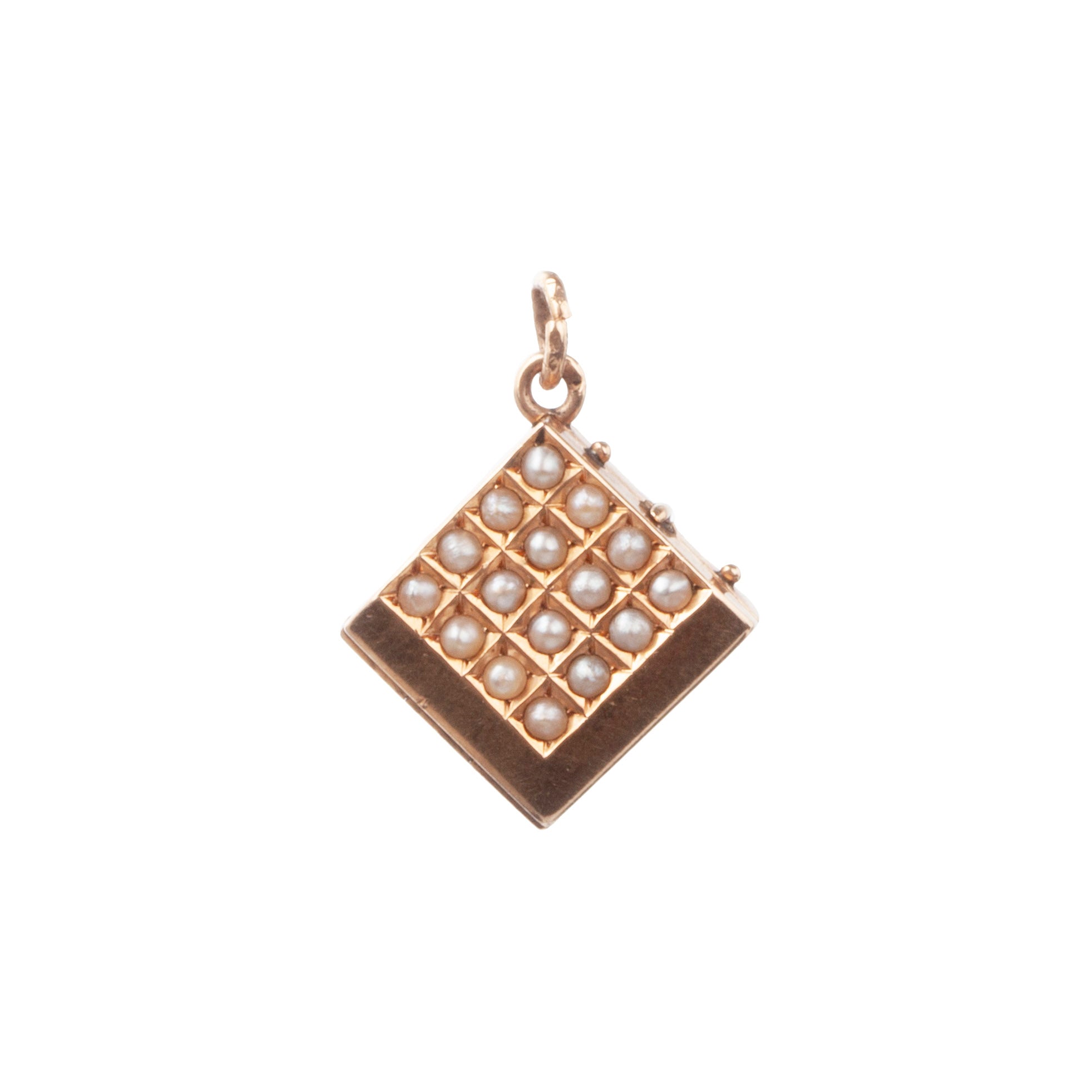 Victorian era pearl locket small, petite in size, in 9k rose gold. Original locket fixtures and glass are intact. Engraved "VI" on both interior sides of the locket. English in origin. Circa 1890.