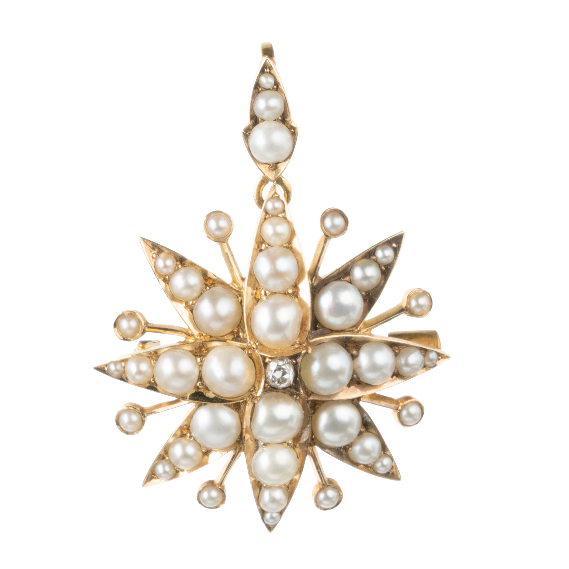Victorian era natural pearl and an old mine cut diamond starburst pendant, in 18k gold. The pendant can be converted and worn as a brooch. English in origin. Circa 1880.