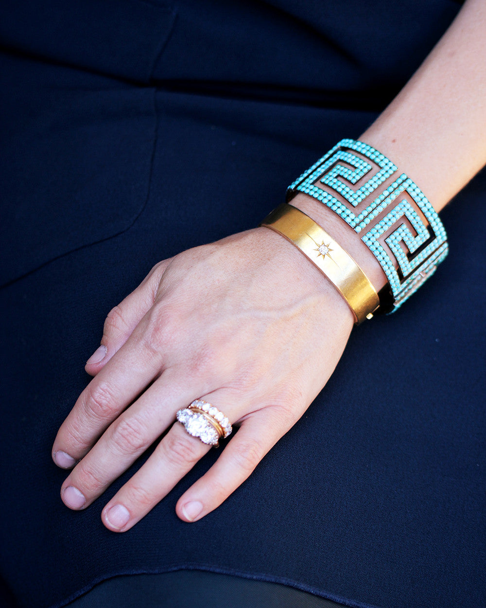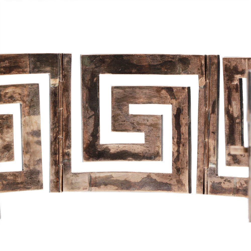 The bracelet is masterfully hinged at 5 separate points with a push button closure. at side with push button closure. The bangle is 1.65" wide with an inner circumference of approximately 8".