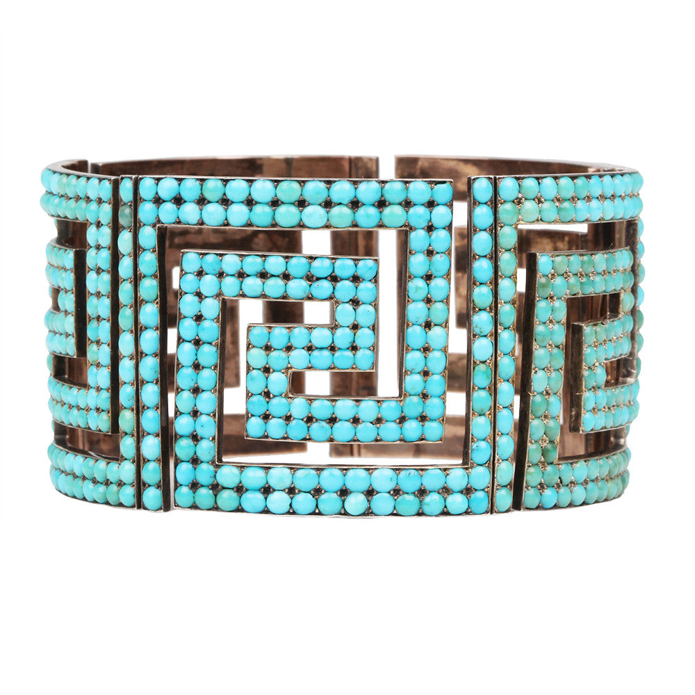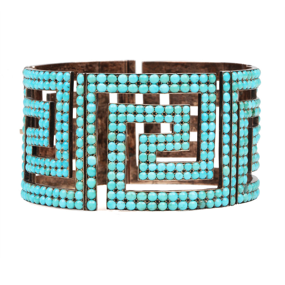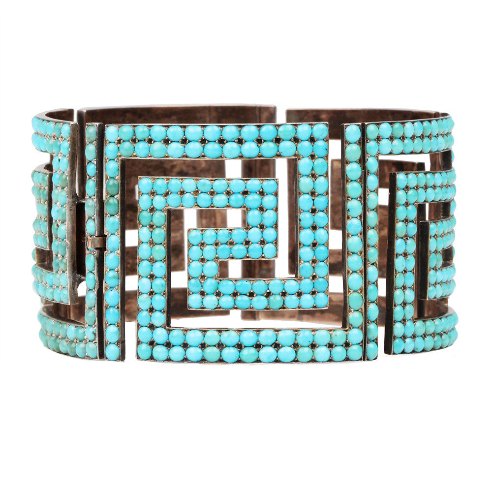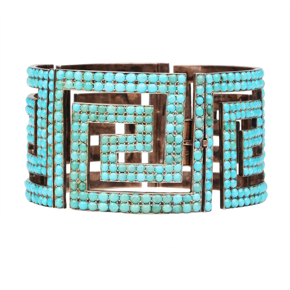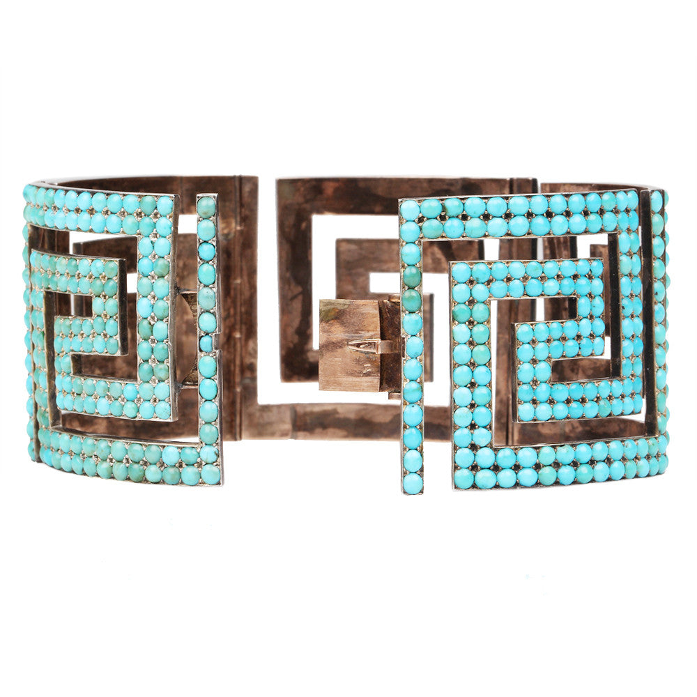Victorian Era Persian Turquoise Bangle in Greek Key Pattern in Rose Gold. English in Origin. Circa 1880.