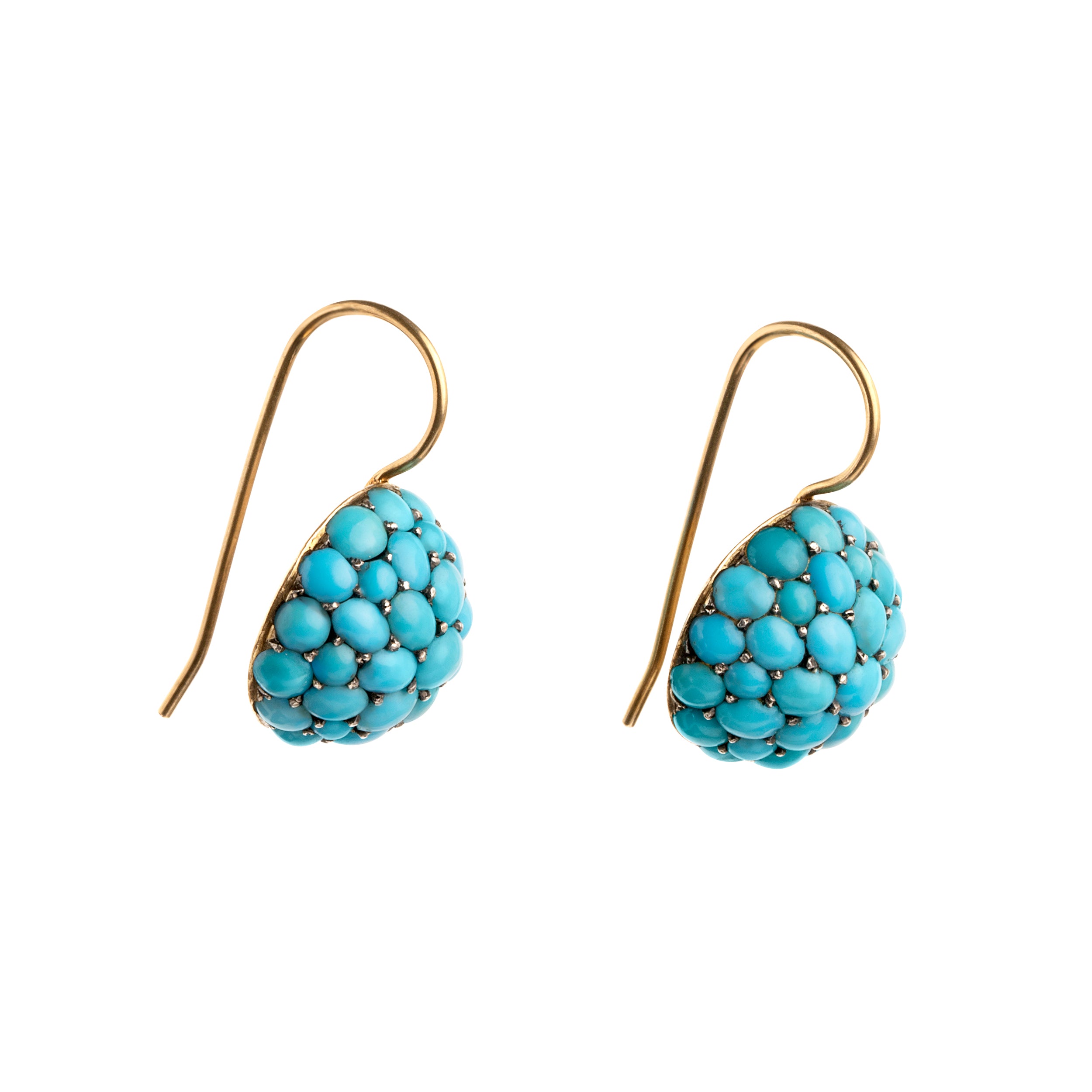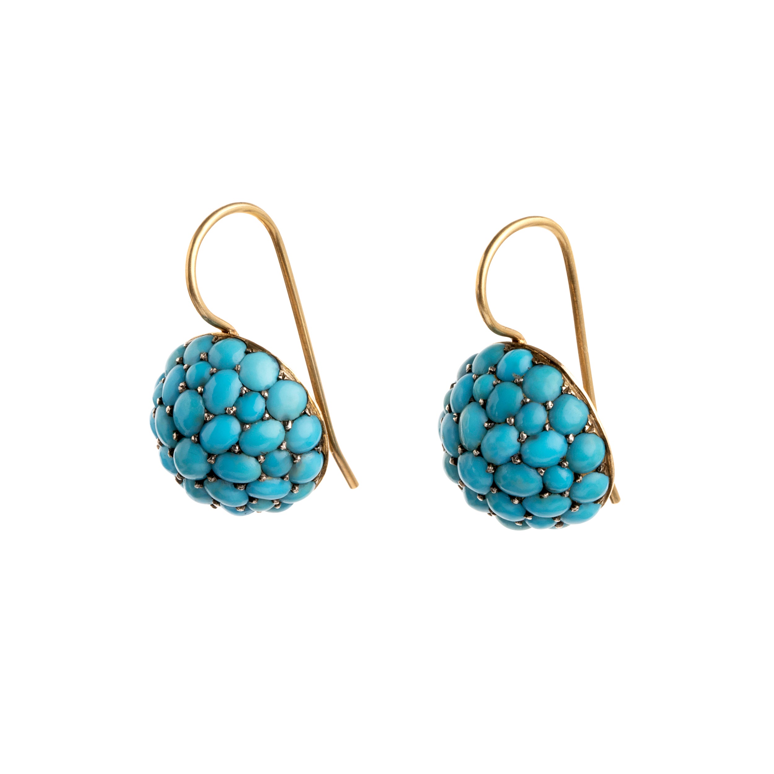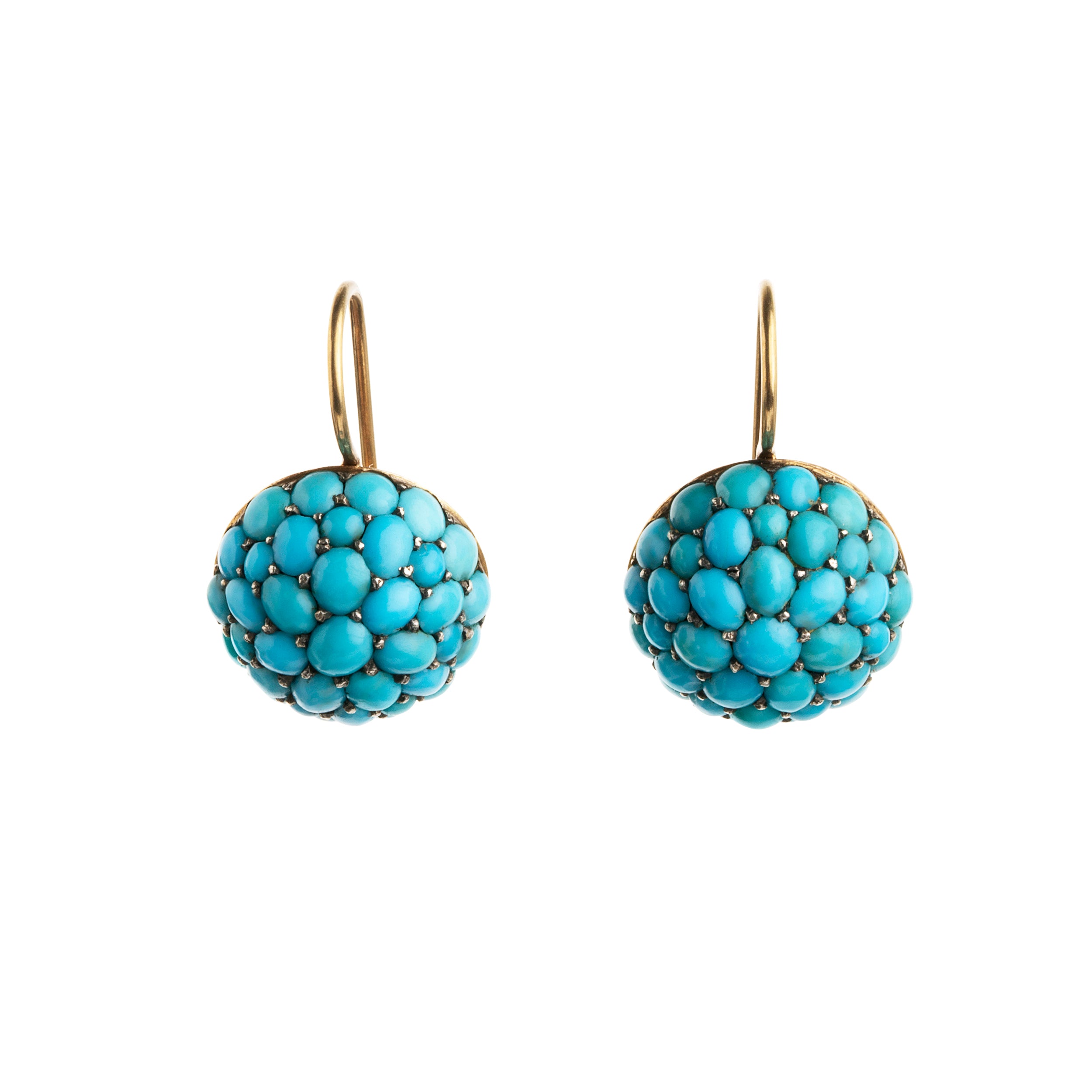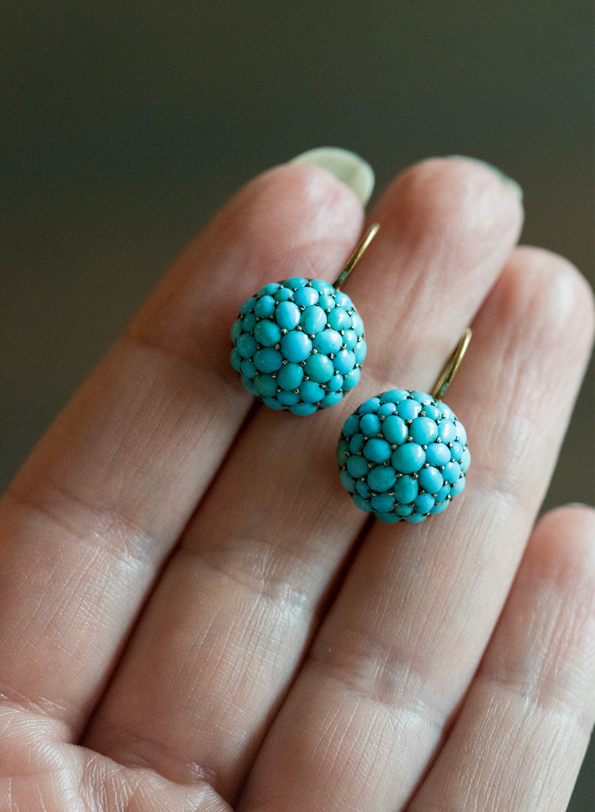 Victorian era Persian turquoise pavé set ball earrings, in 9k gold and silver. What were once beautiful Victorian era buttons or cufflinks are now perfect everyday earrings—hanging on modern 18k wires. England. Circa 1880.