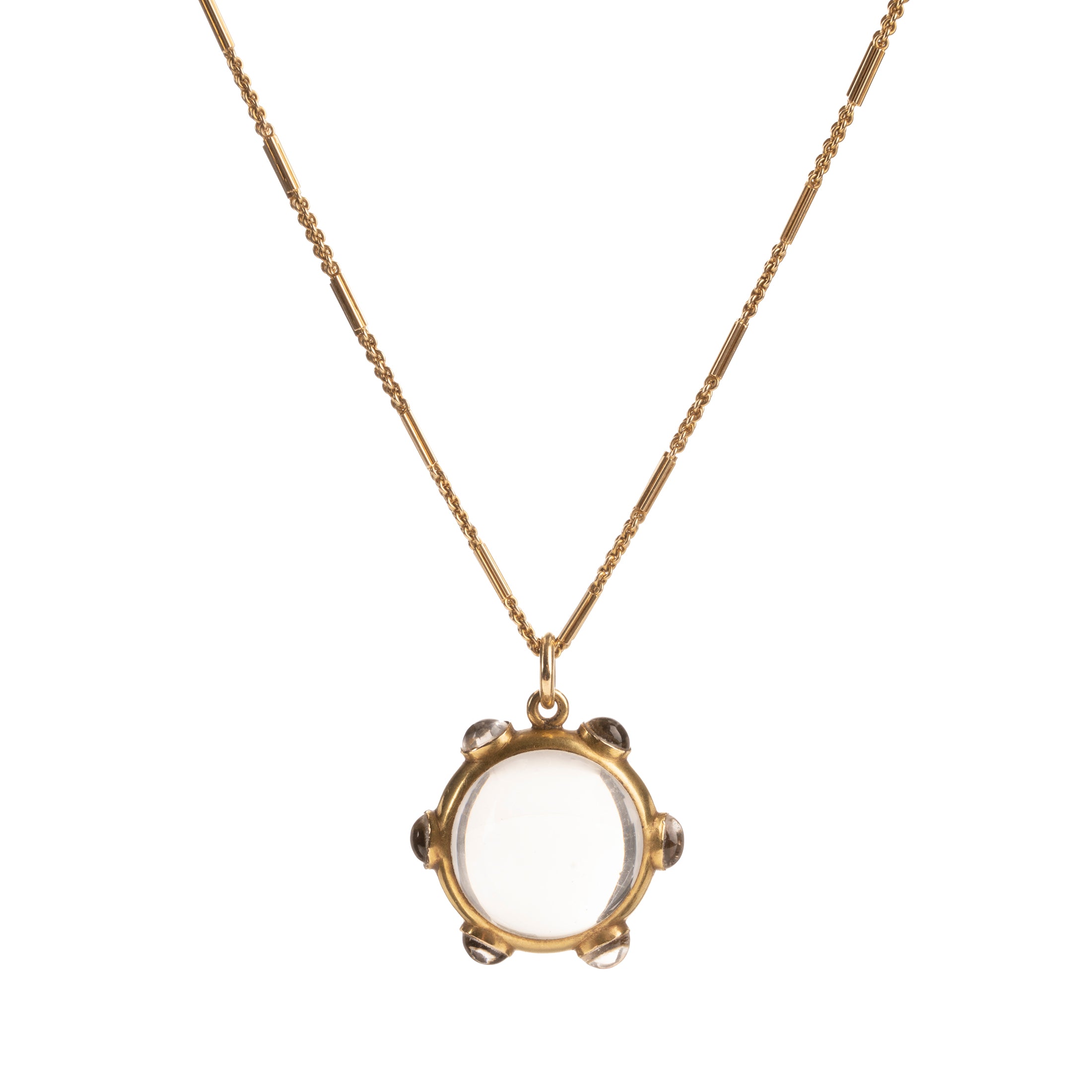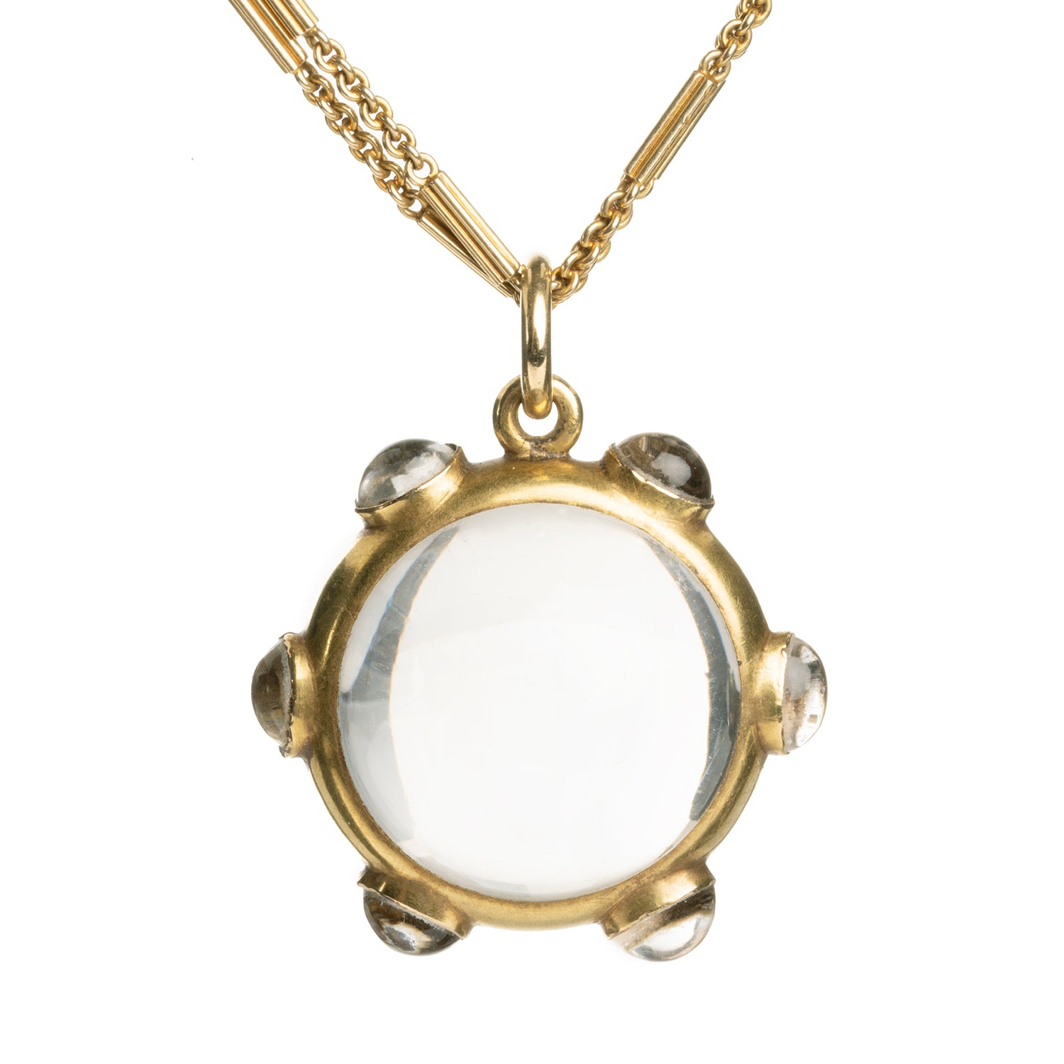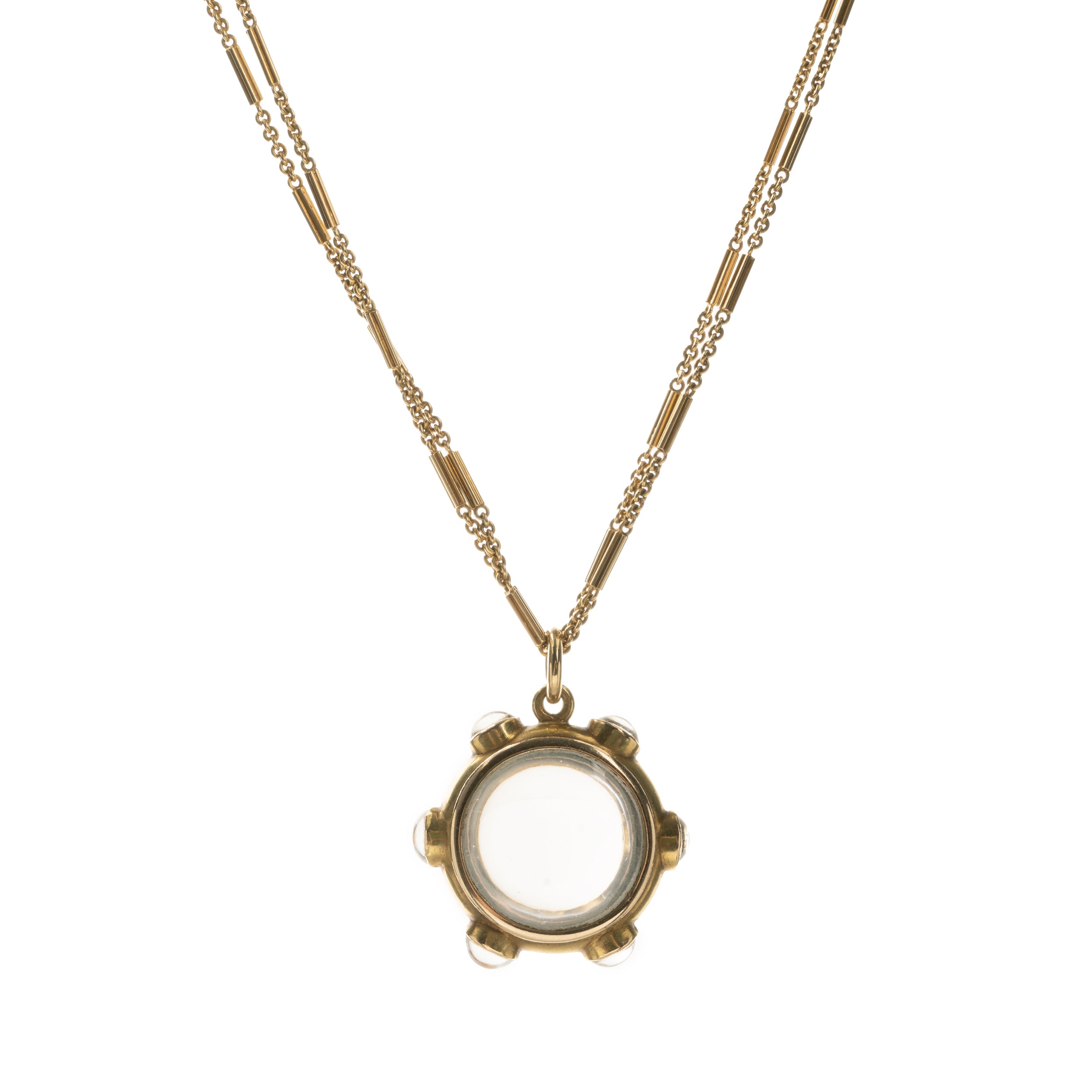 Victorian-era gold rock crystal locket. The crystal-clear quartz stones are cut in a way that grabs and plays with light, creating a beautiful visual effect. Lockets such as these predate commercial photography and were made to hold a loved one's plaited hair. They can be worn empty or with a small keepsake. English in origin. Circa 1860.