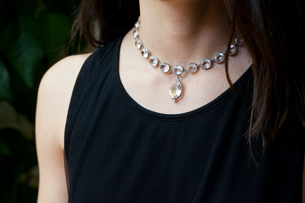 Integrated box clasp. 14.5" in length. Largest center stone measures .50" in length. The necklace is the top one worn on the model. Paired with the longer larger rock crystal necklace.