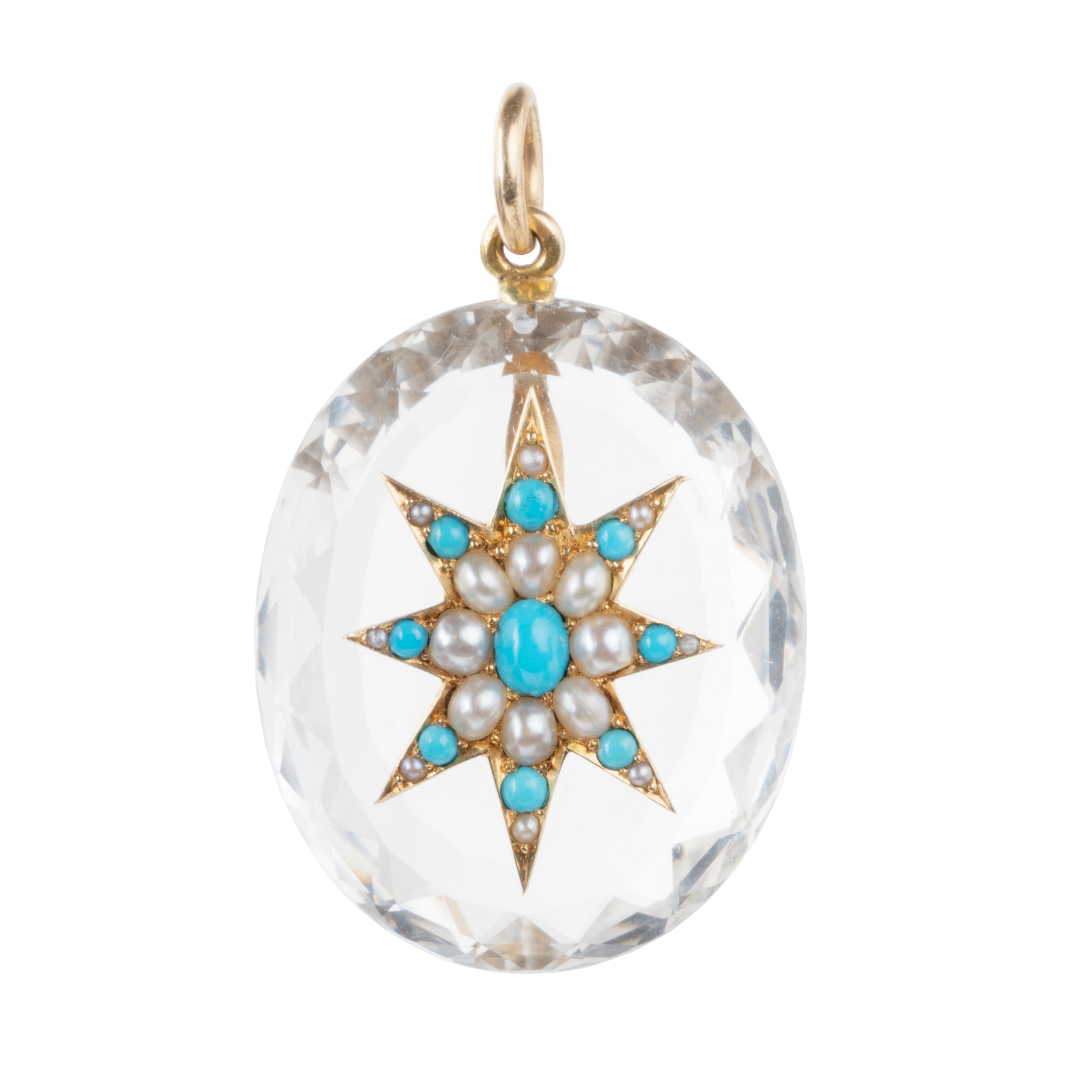 A large bright faceted quartz crystal stone holds an 18k gold, natural pearl, and Persian turquoise starburst. English in origin. Circa 1870.