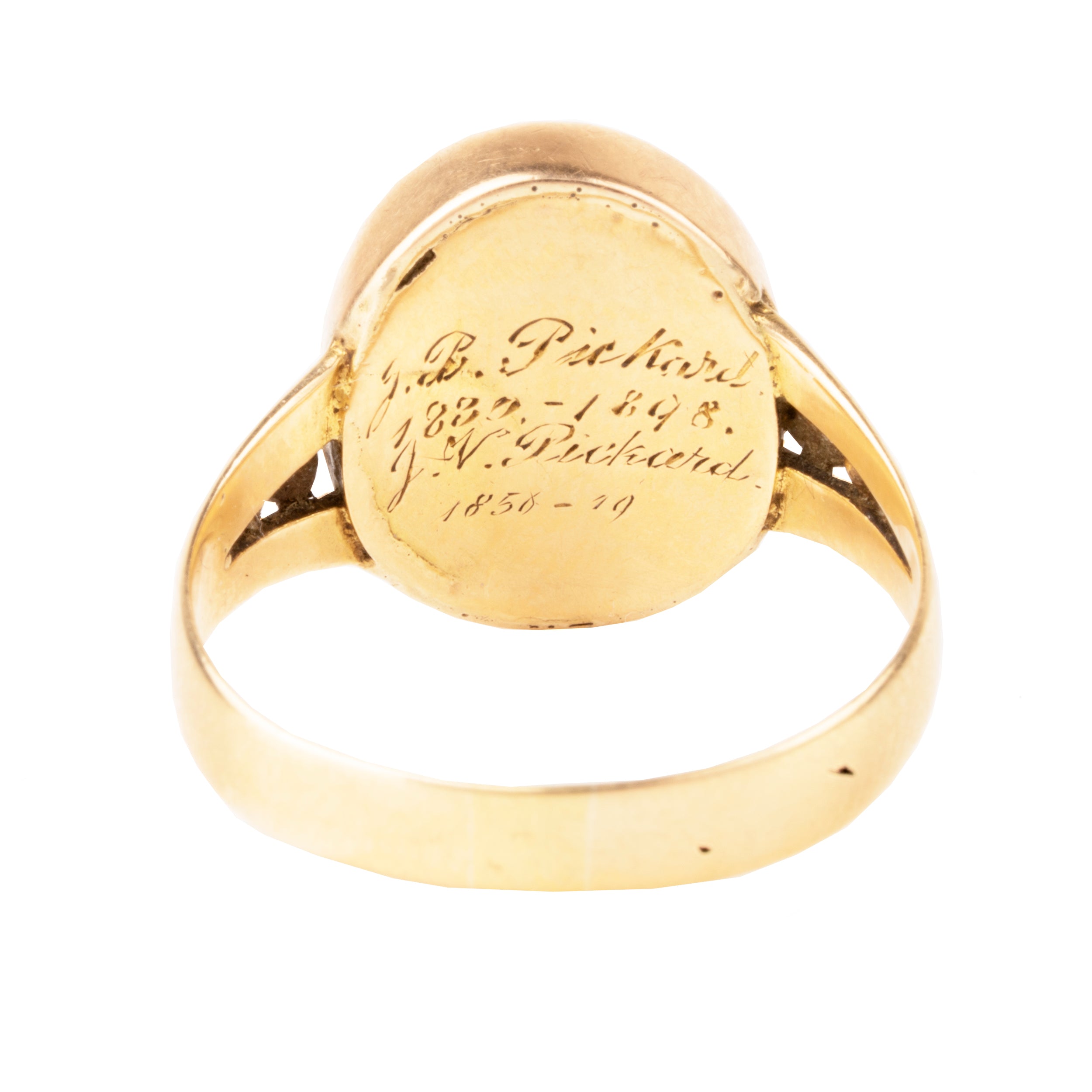 Victorian era Roman intaglio signet ring, in 15k gold. The carnelian carving depicts Prudence (a woman holding a serpent and a mirror), one of the four cardinal virtues. The interior engraving, "J.B Pichard 1820 - 1848, J.N. Pichard 1850 - 1900." English in Origin. Circa 1880.