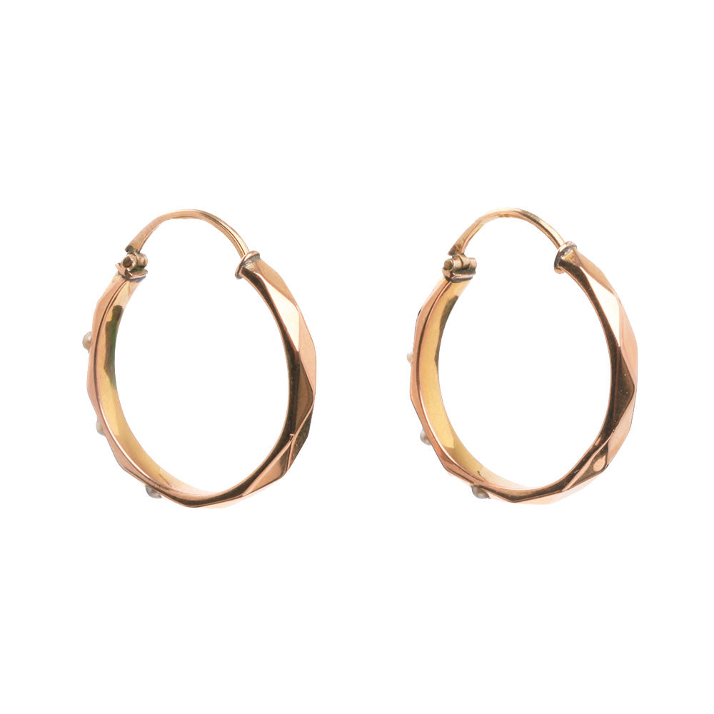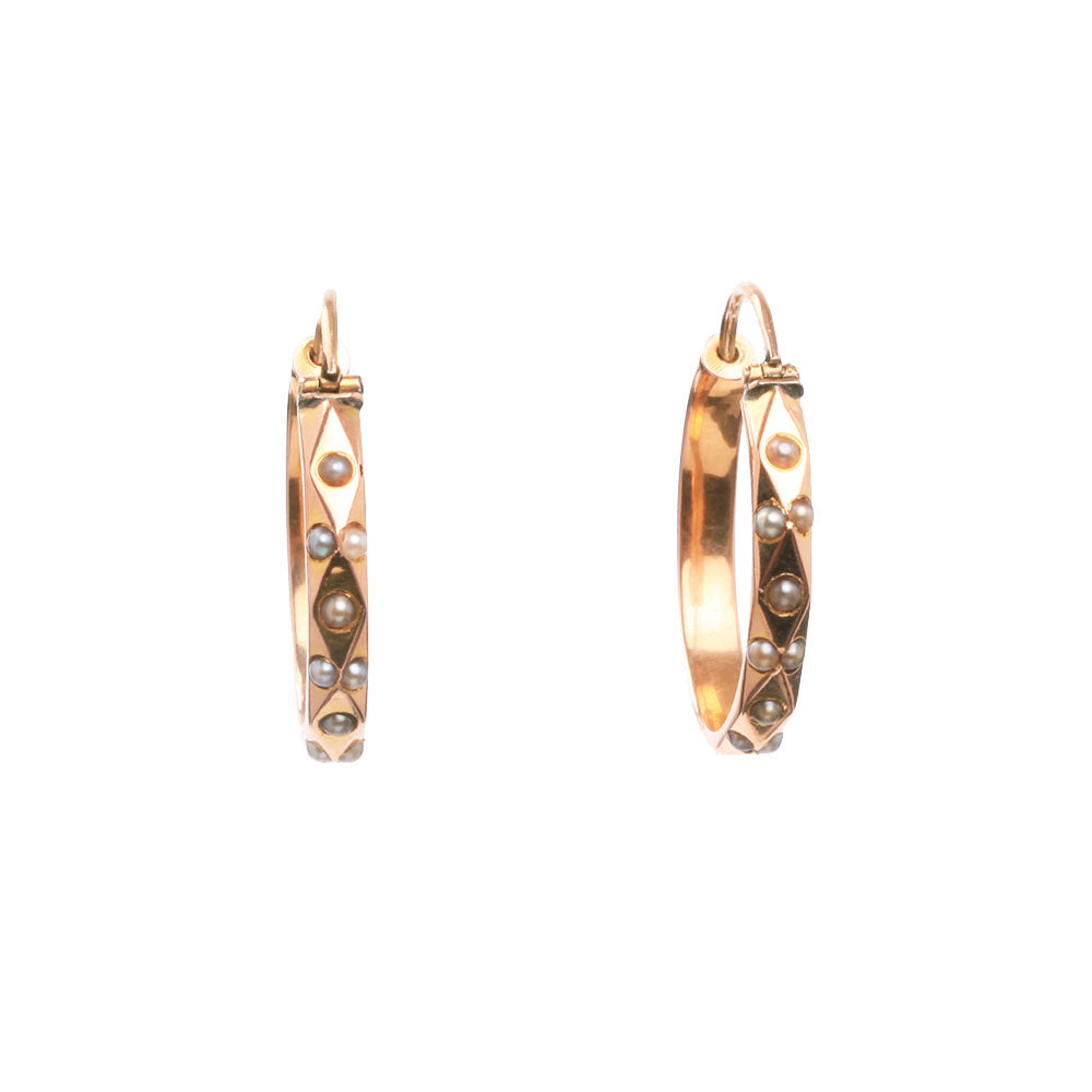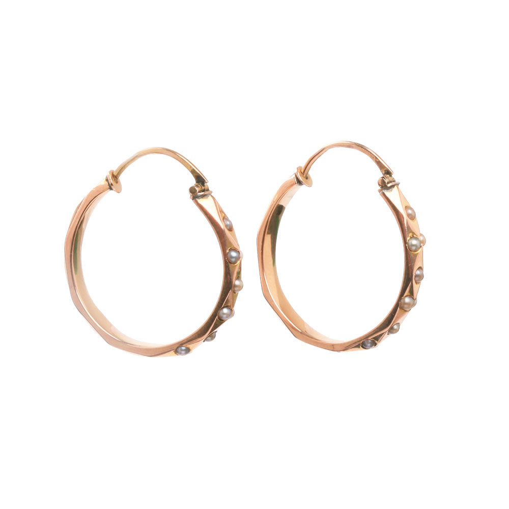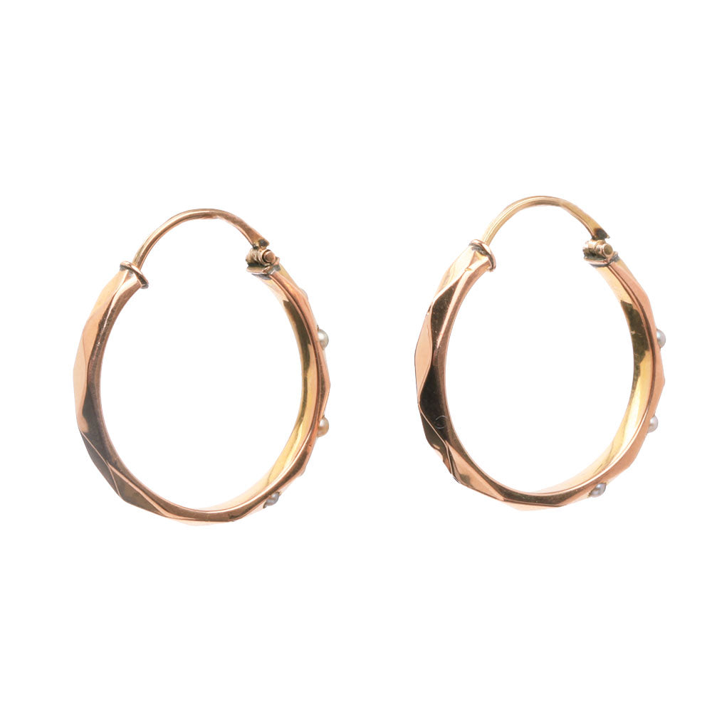 Victorian era reversible rose gold pearl seed earrings. Can be worn displaying either side, the plain facets or the tiny seed pearls. English in origin. Circa 1870