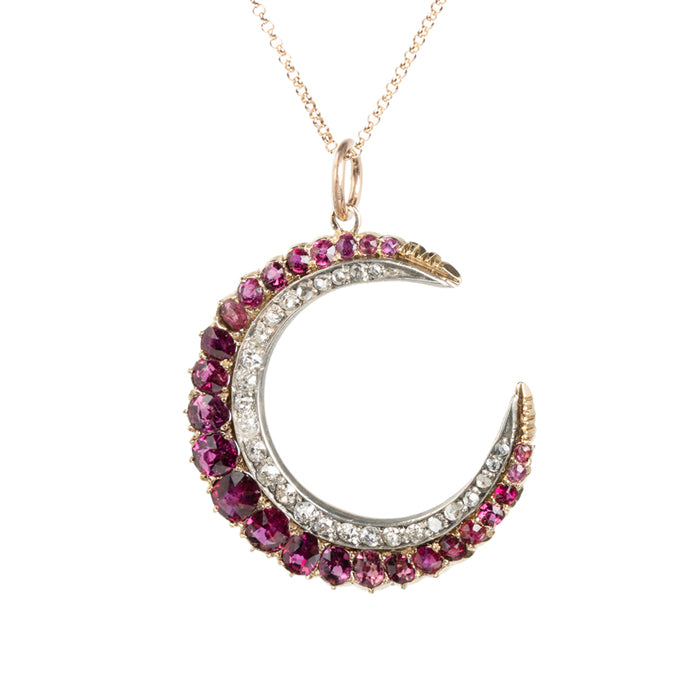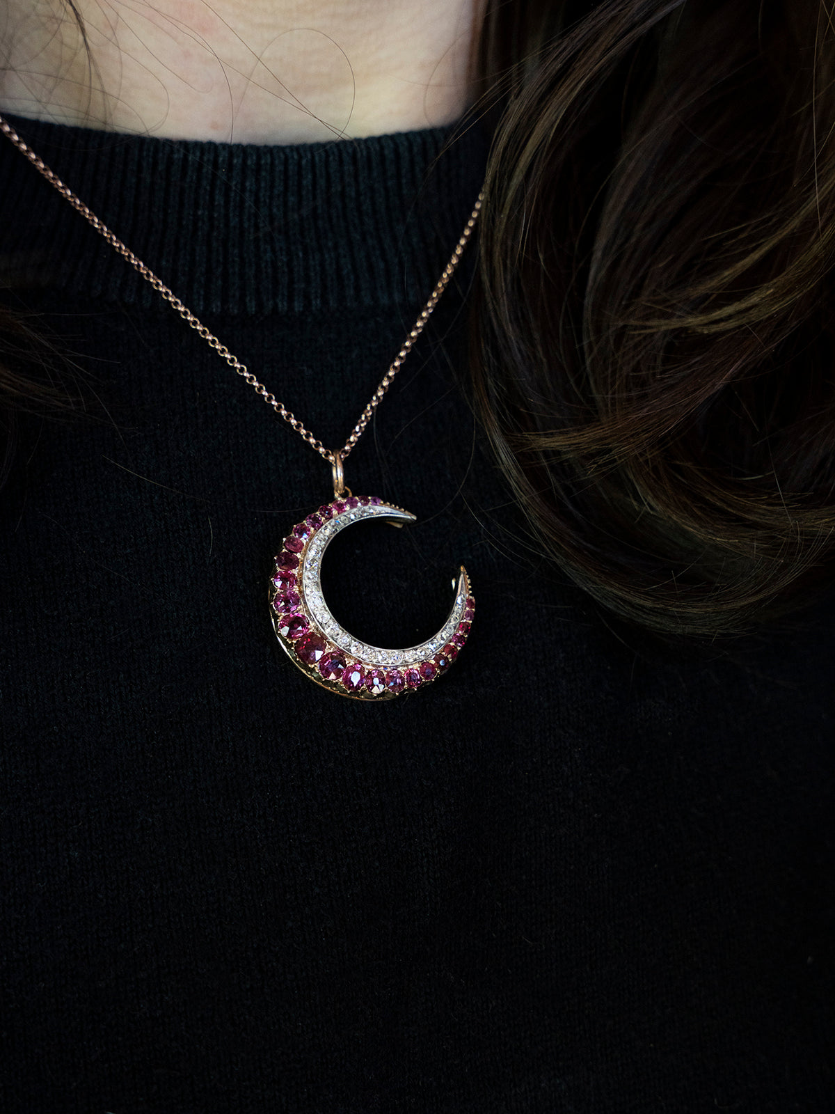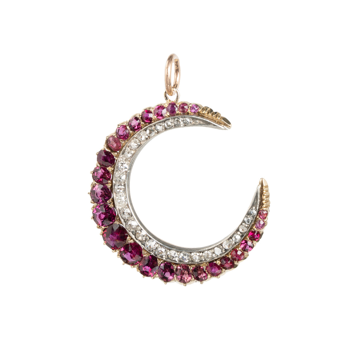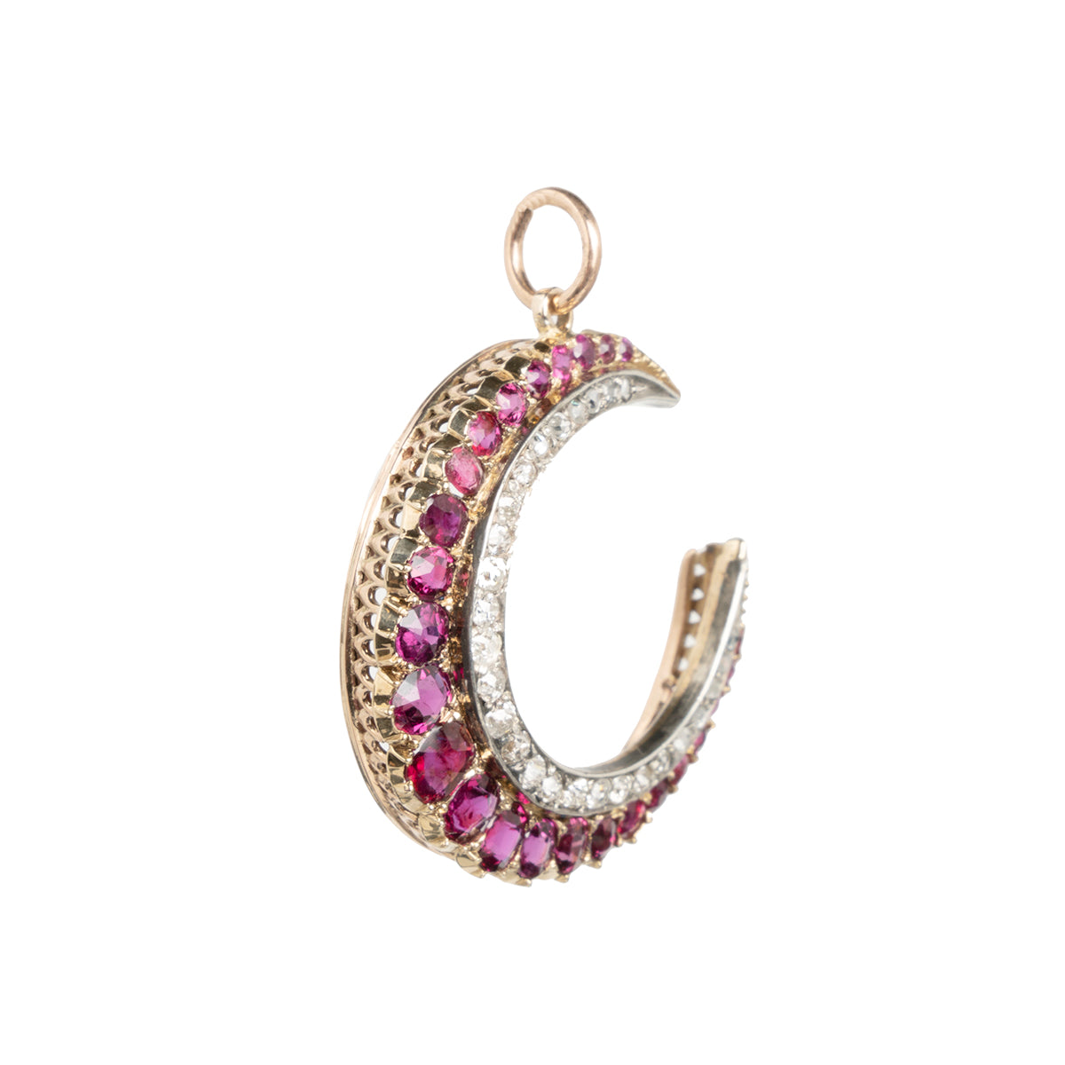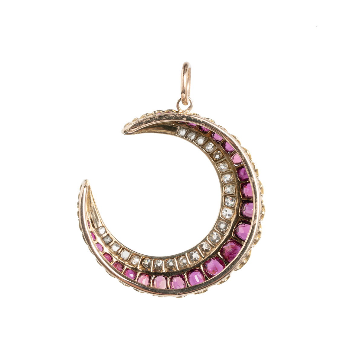 The crescent moon can represent the alluring promise of a new beginning wherever there is an end as well as the promise of more light to come. We have an example in ruby and old mine cut diamonds set in silver and 18k gold. English in origin. Circa 1880.