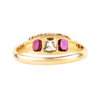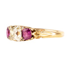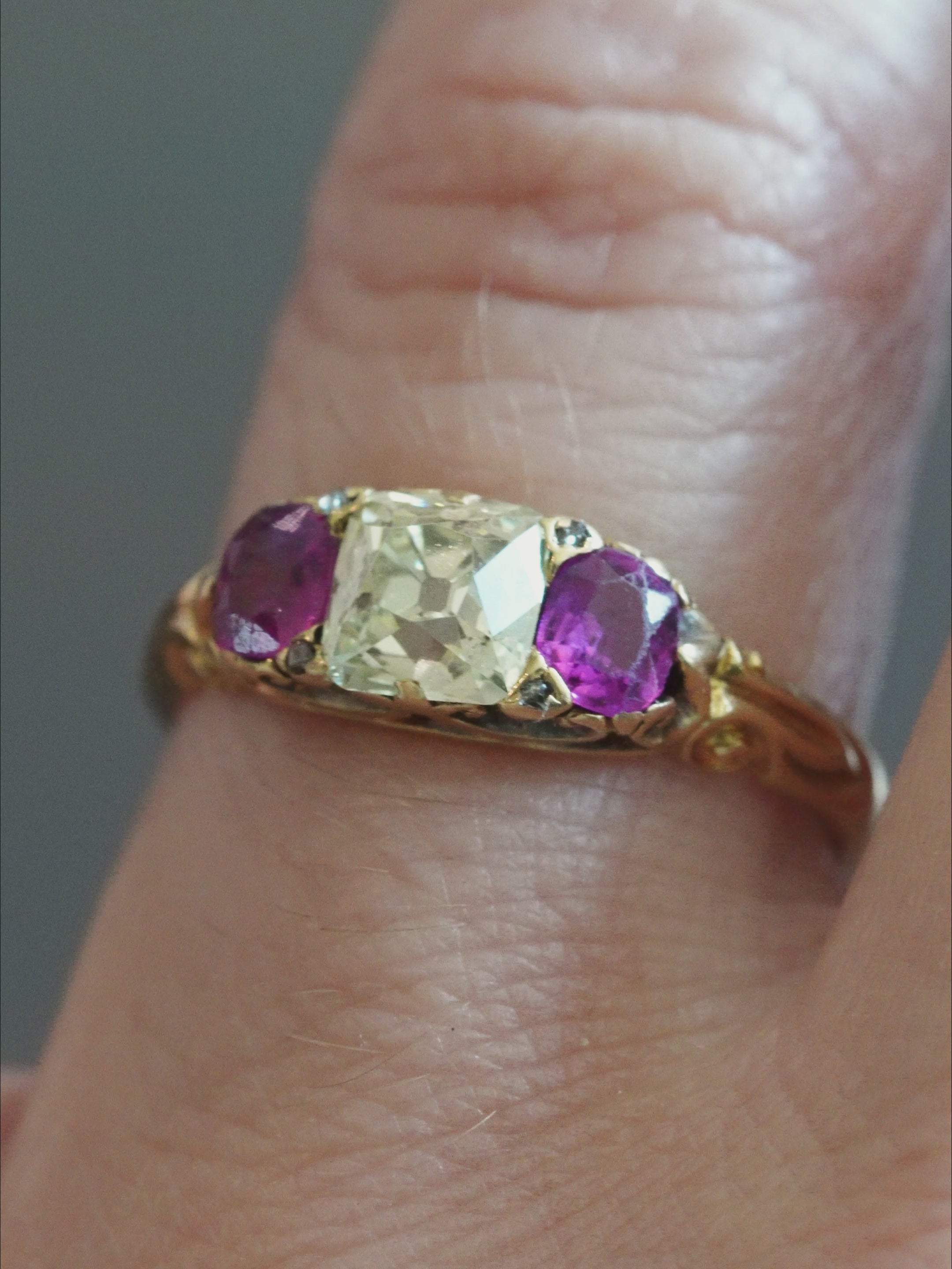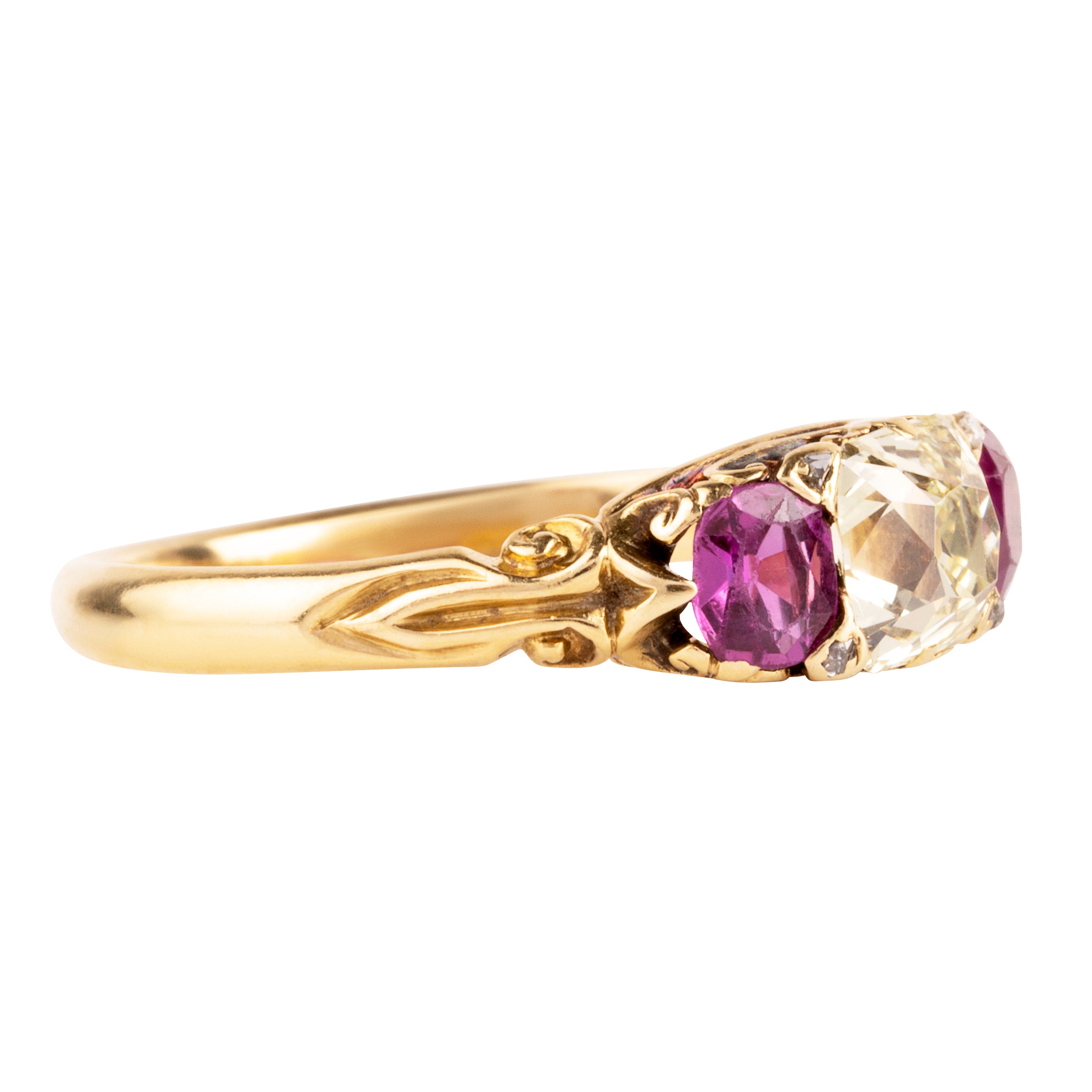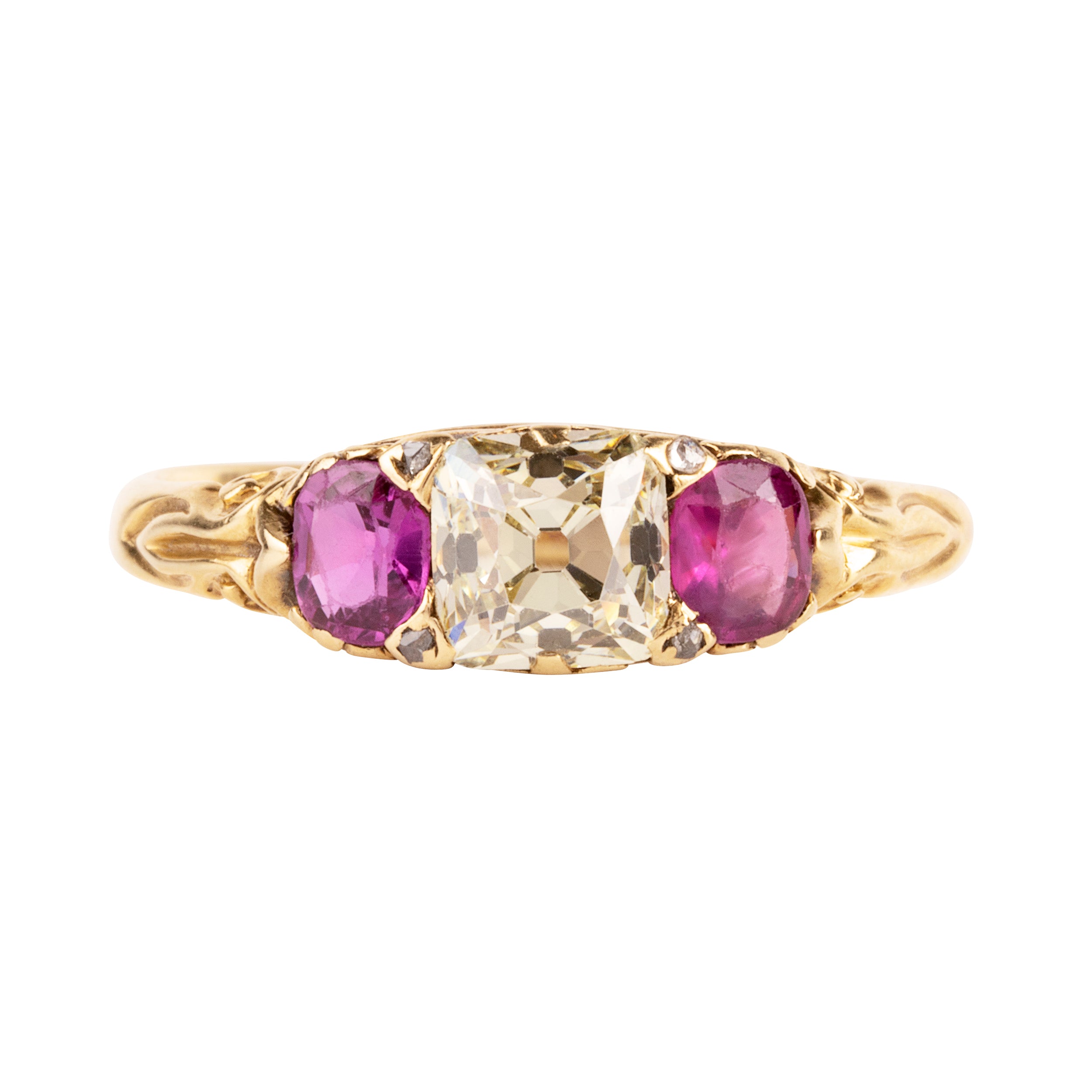 Victorian era ruby and diamond ring in 18k gold. Approximately 1 carat yellow old mine diamond with two Burmese rubies. England. Circa 1890.