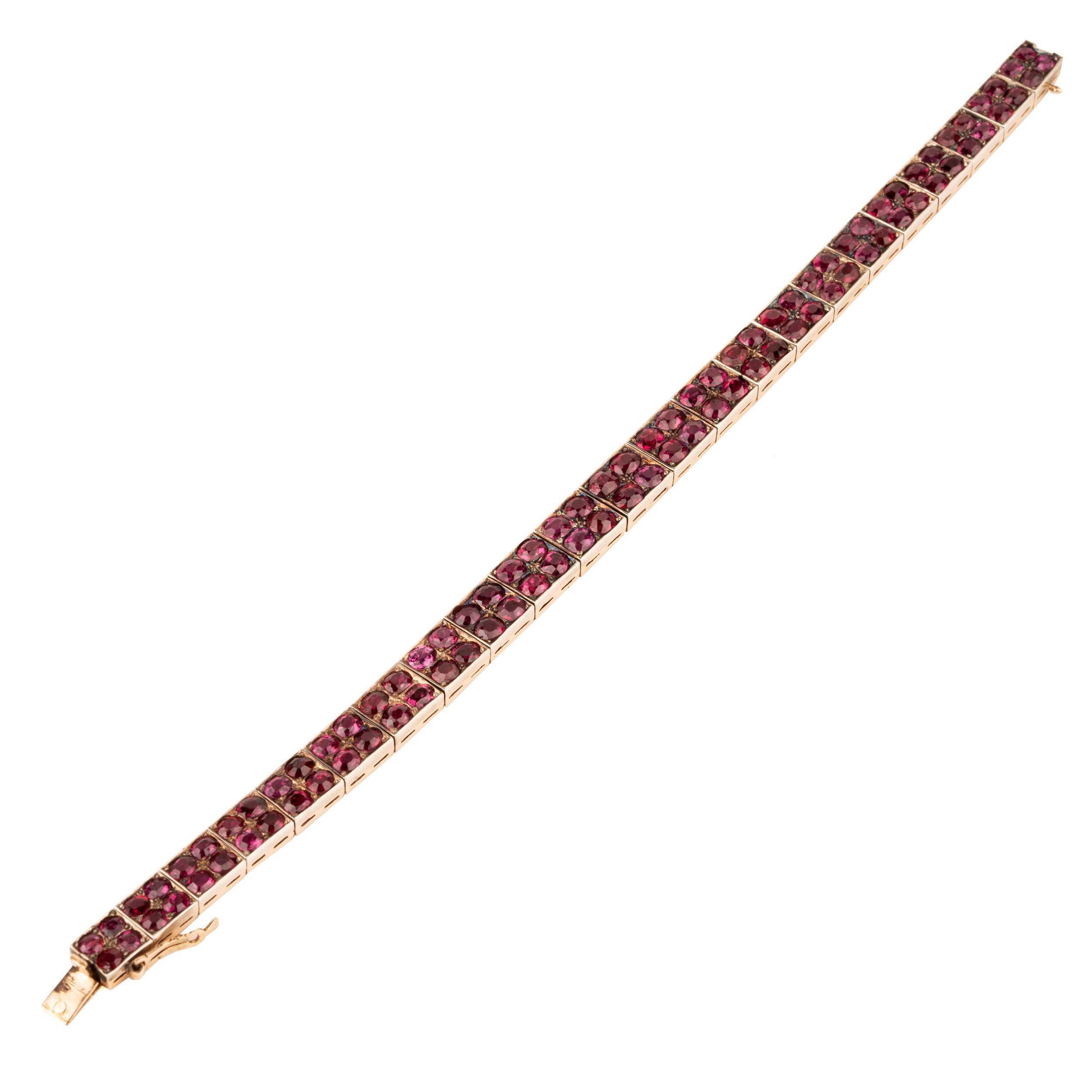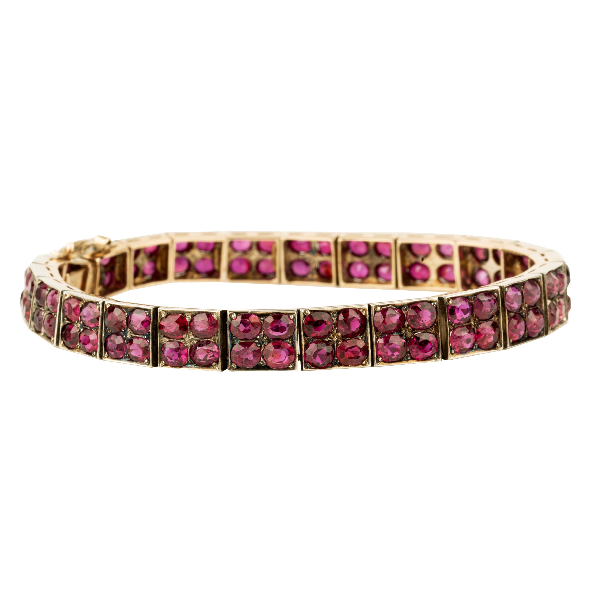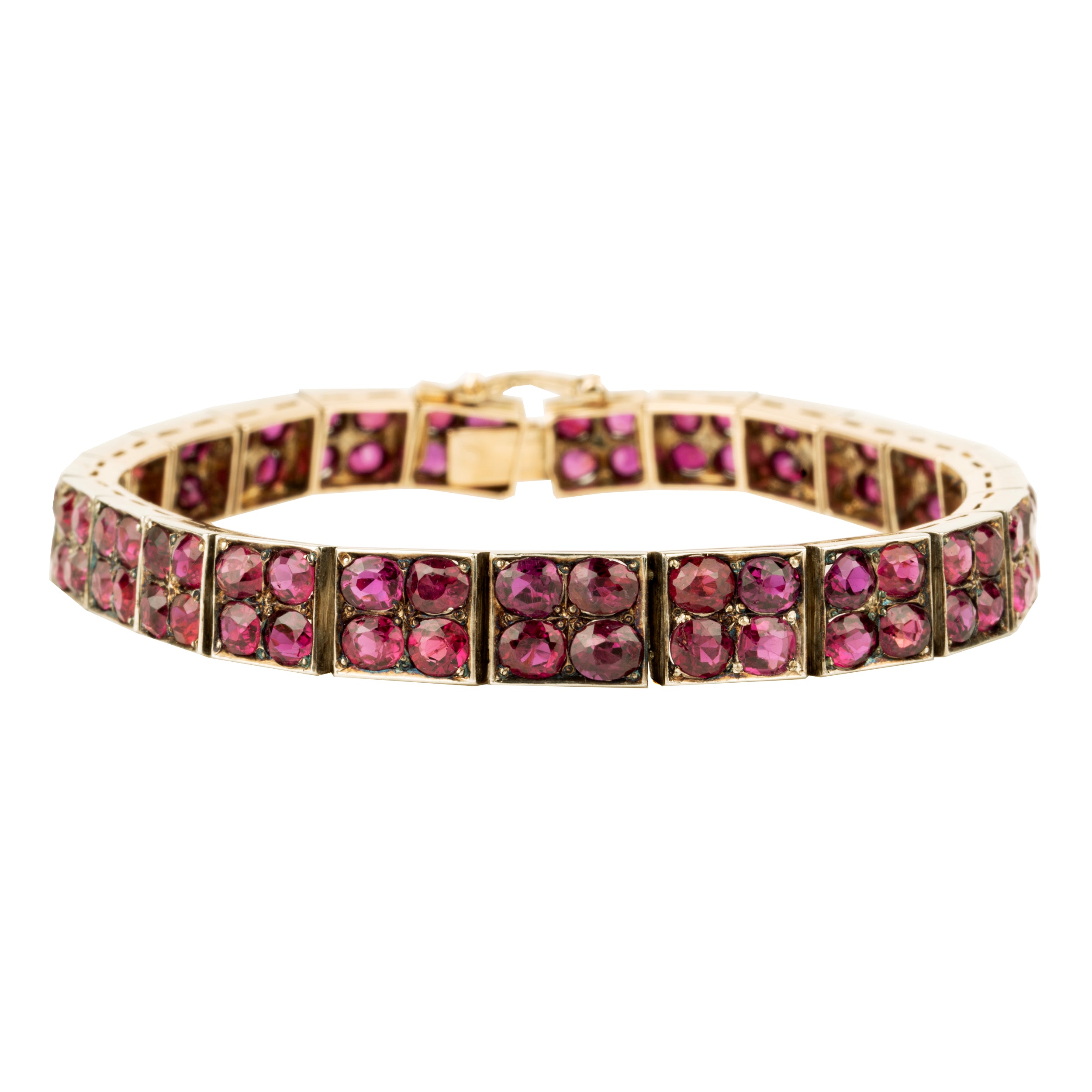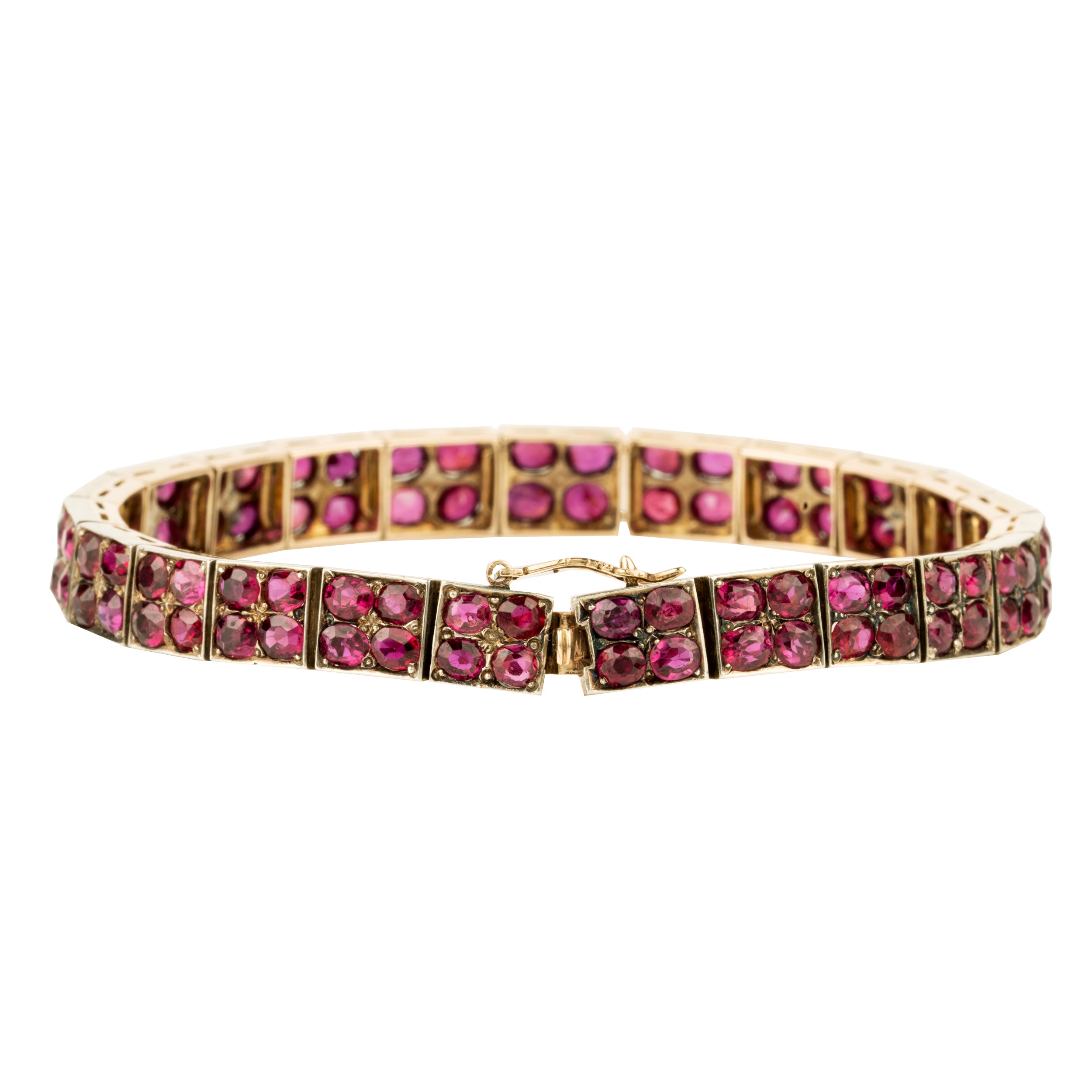 Ninety-two oval shaped rubies are set in a slightly graduating design. The deep pinkish-red natural rubies are subtly different in shape and size set in silver on gold settings. Found in England. Early 20th century.