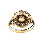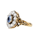 A cornflower blue sapphire is surrounded by old mine-cut diamonds in a classic cluster design, with delicate pierced shoulders in 18k Gold. Petite scale. The sapphire is a more modern replacement.