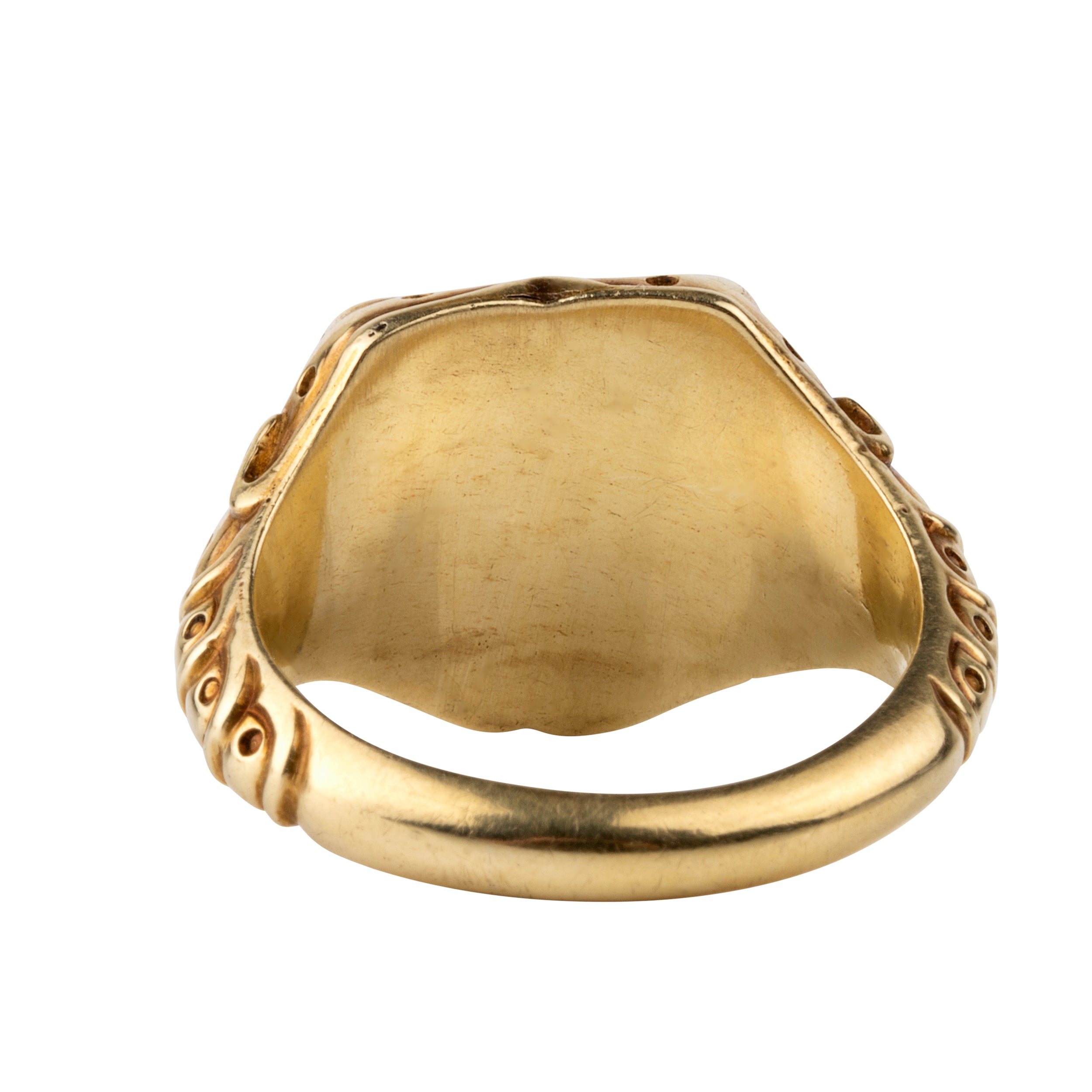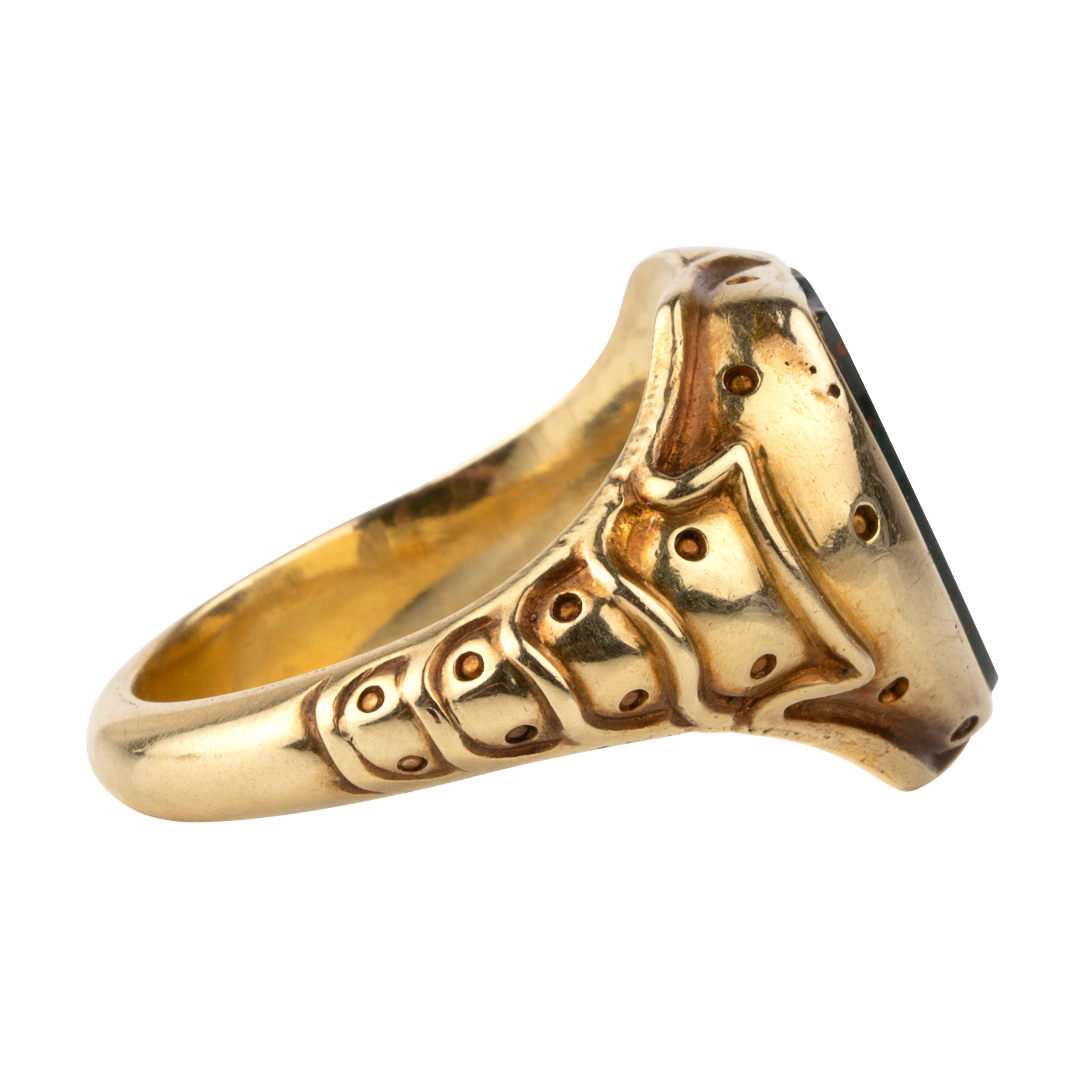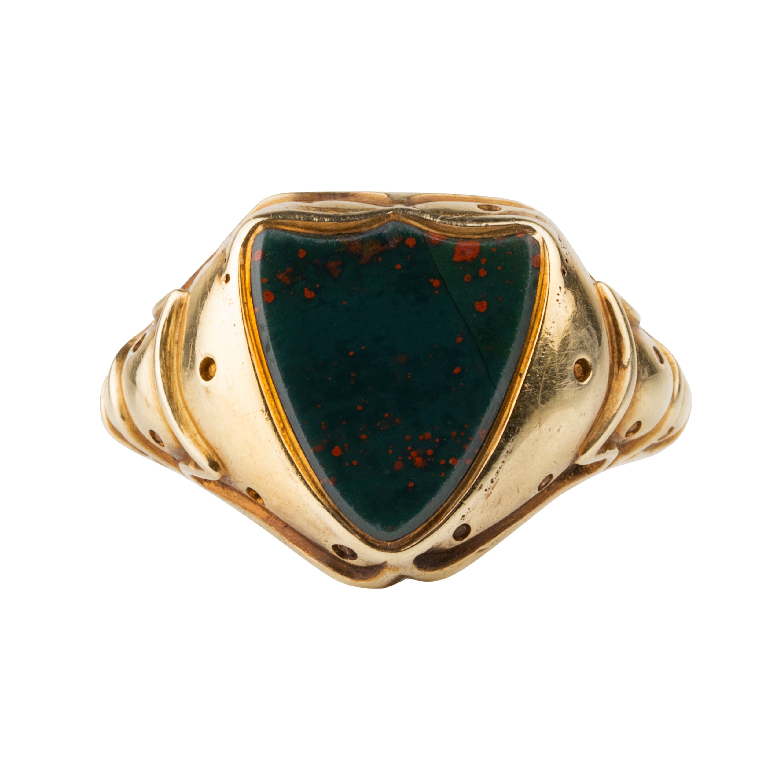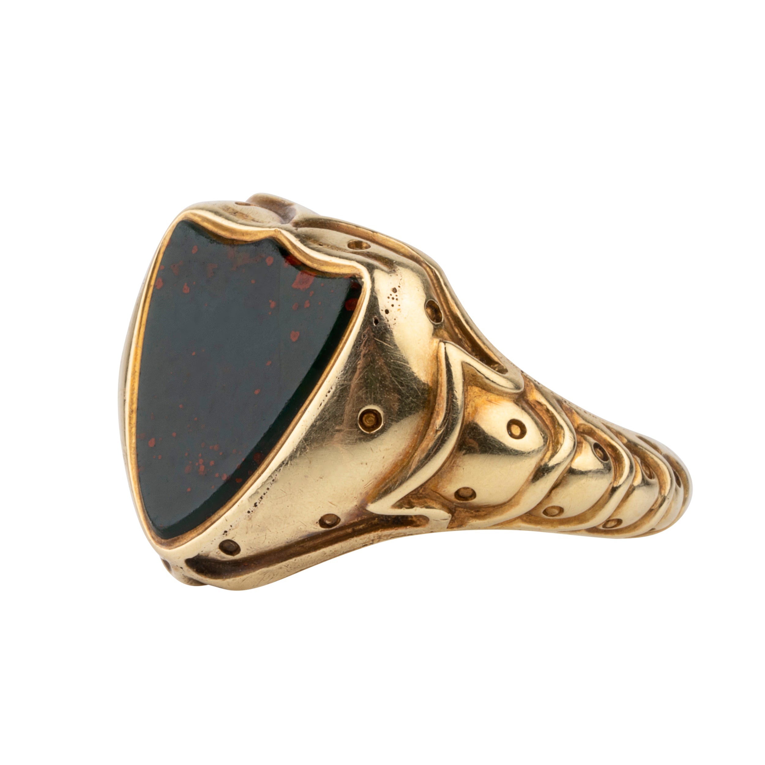 Victorian era signet ring, in 18k gold. Carved bloodstone shield with armored plate details on the shoulder. England. Circa 1870.
