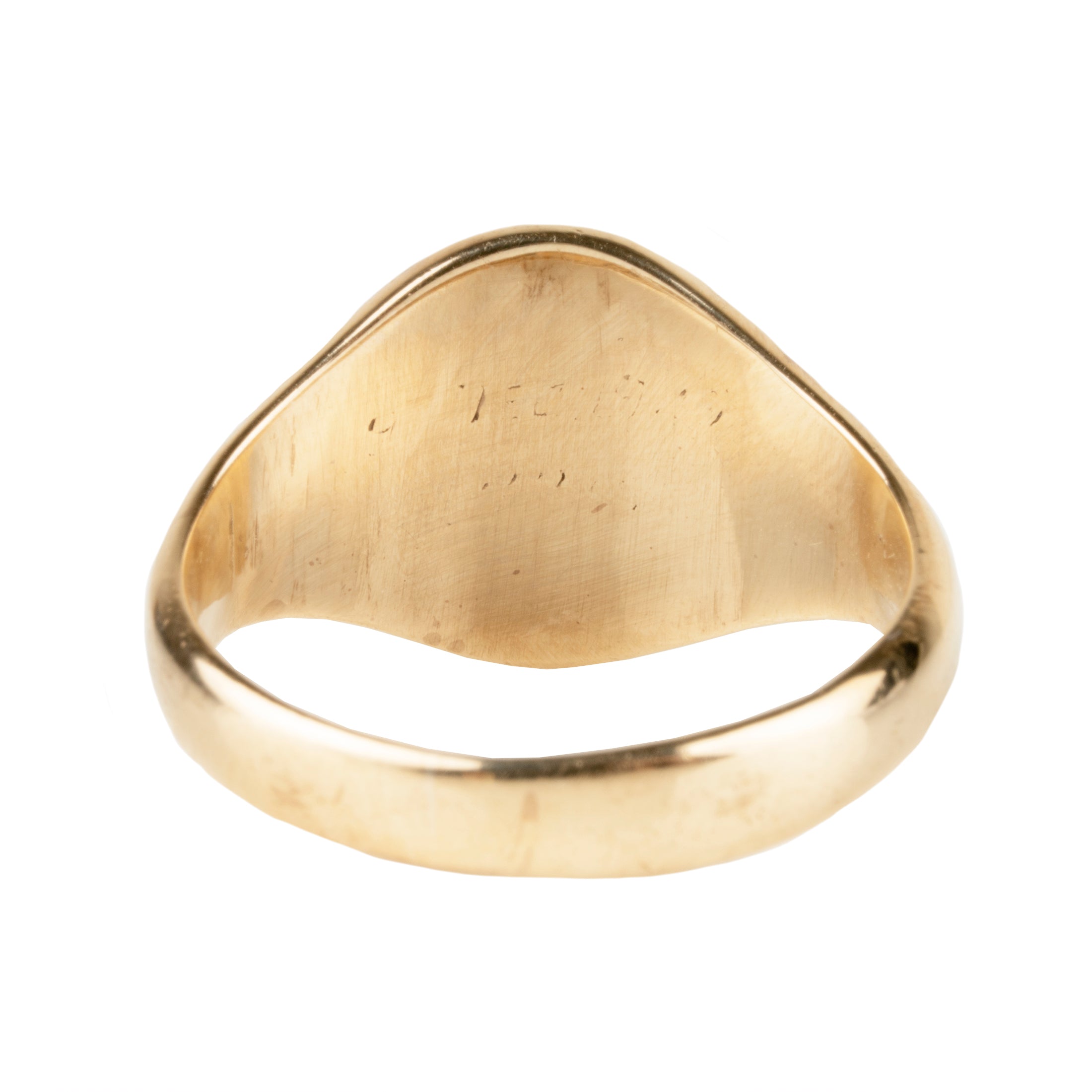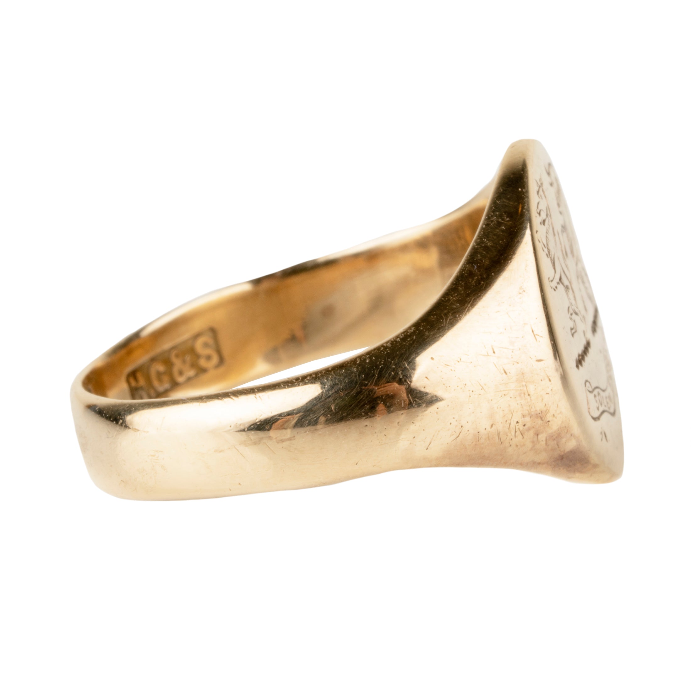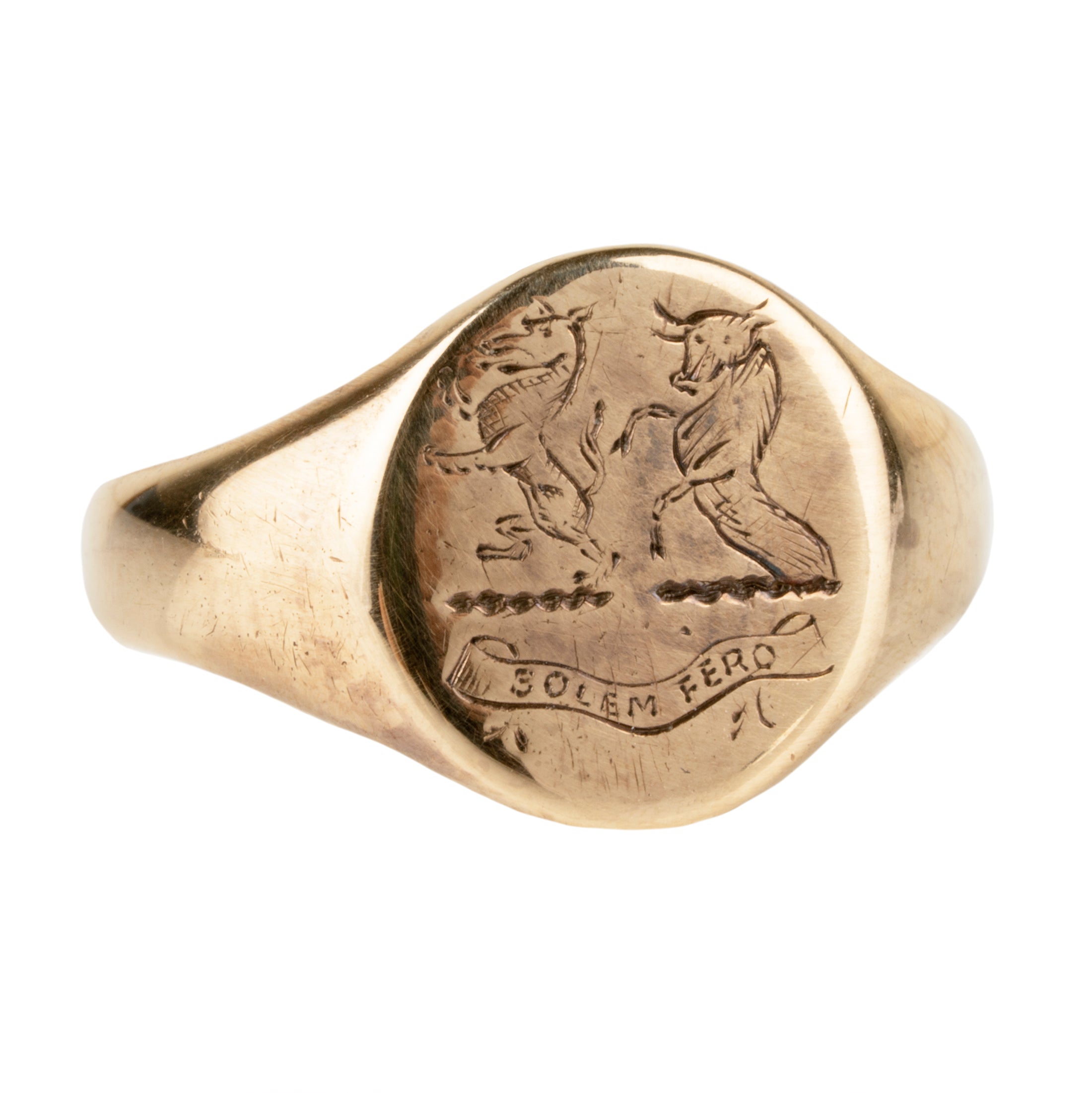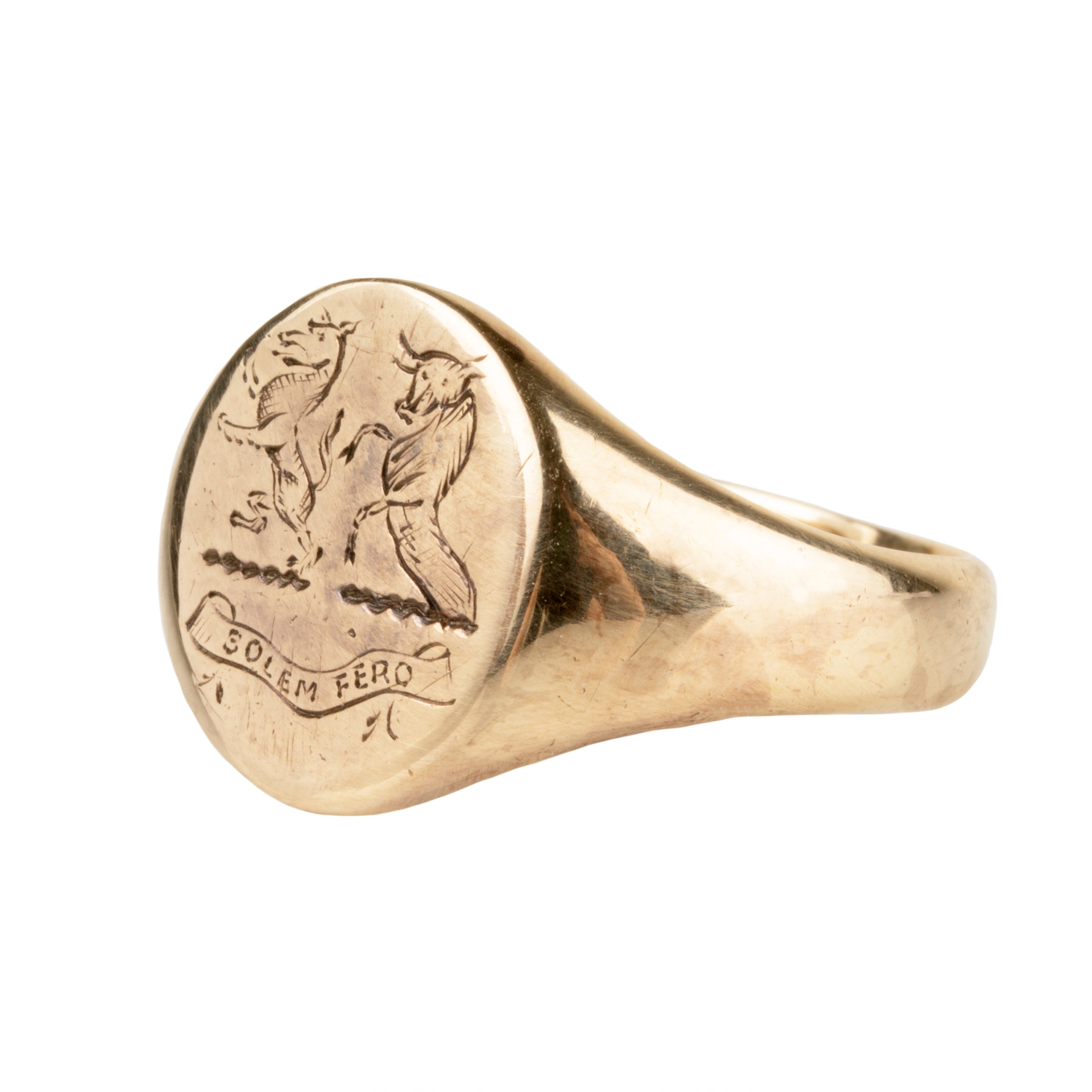 Victorian era signet ring, with a bull and dragon engraving, in 9k gold. The engraved motto reads Solem Faro which translates to "I will make the sun/light". English in origin. Circa 1870.