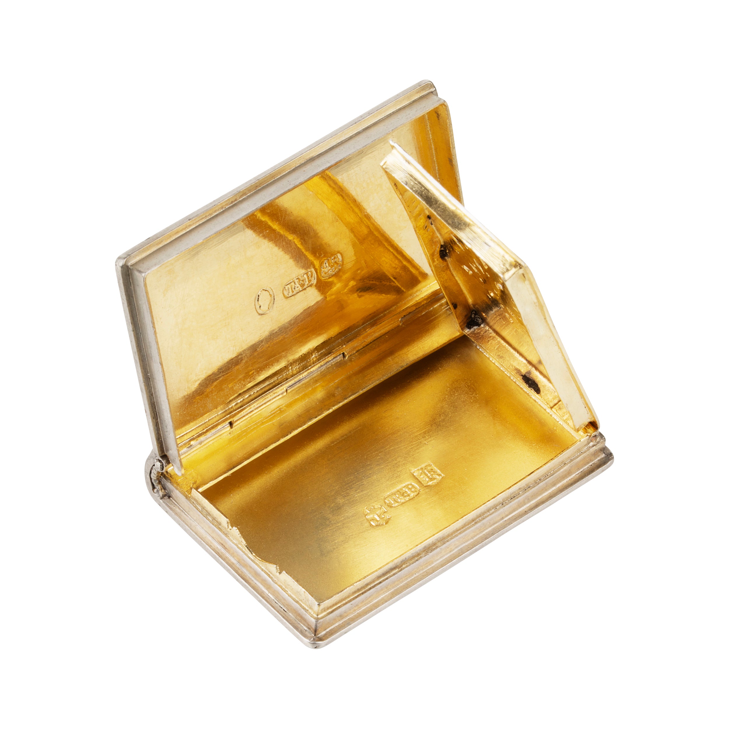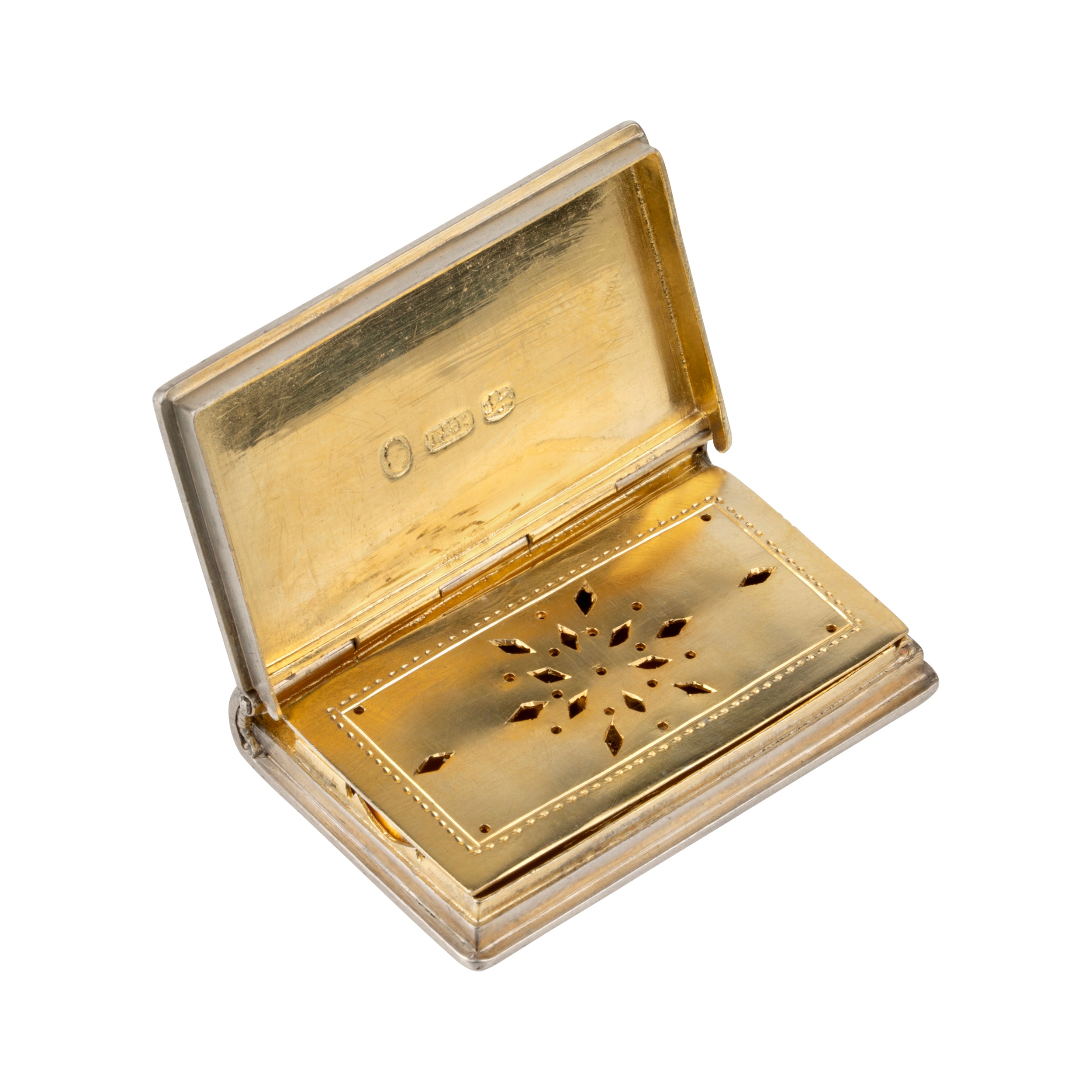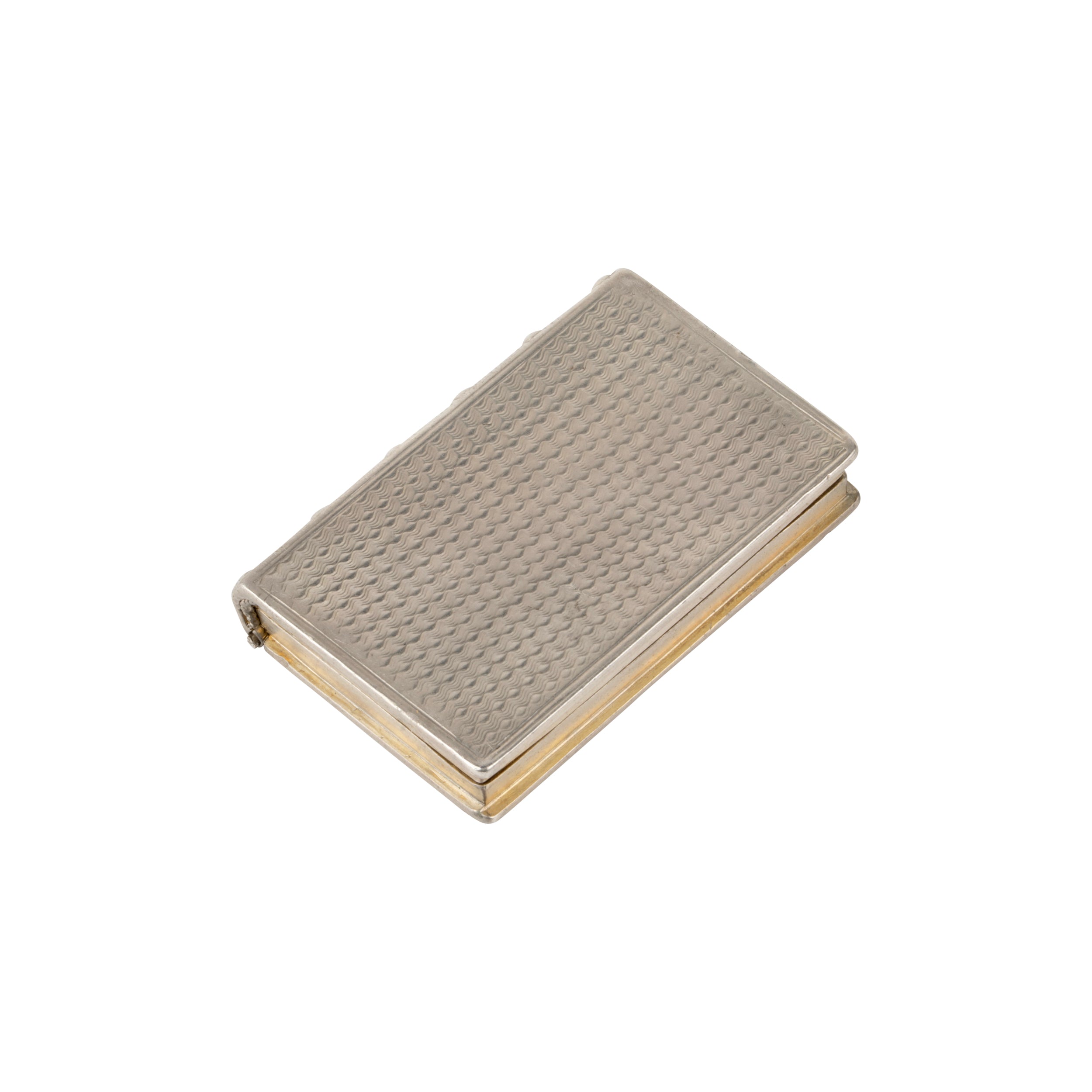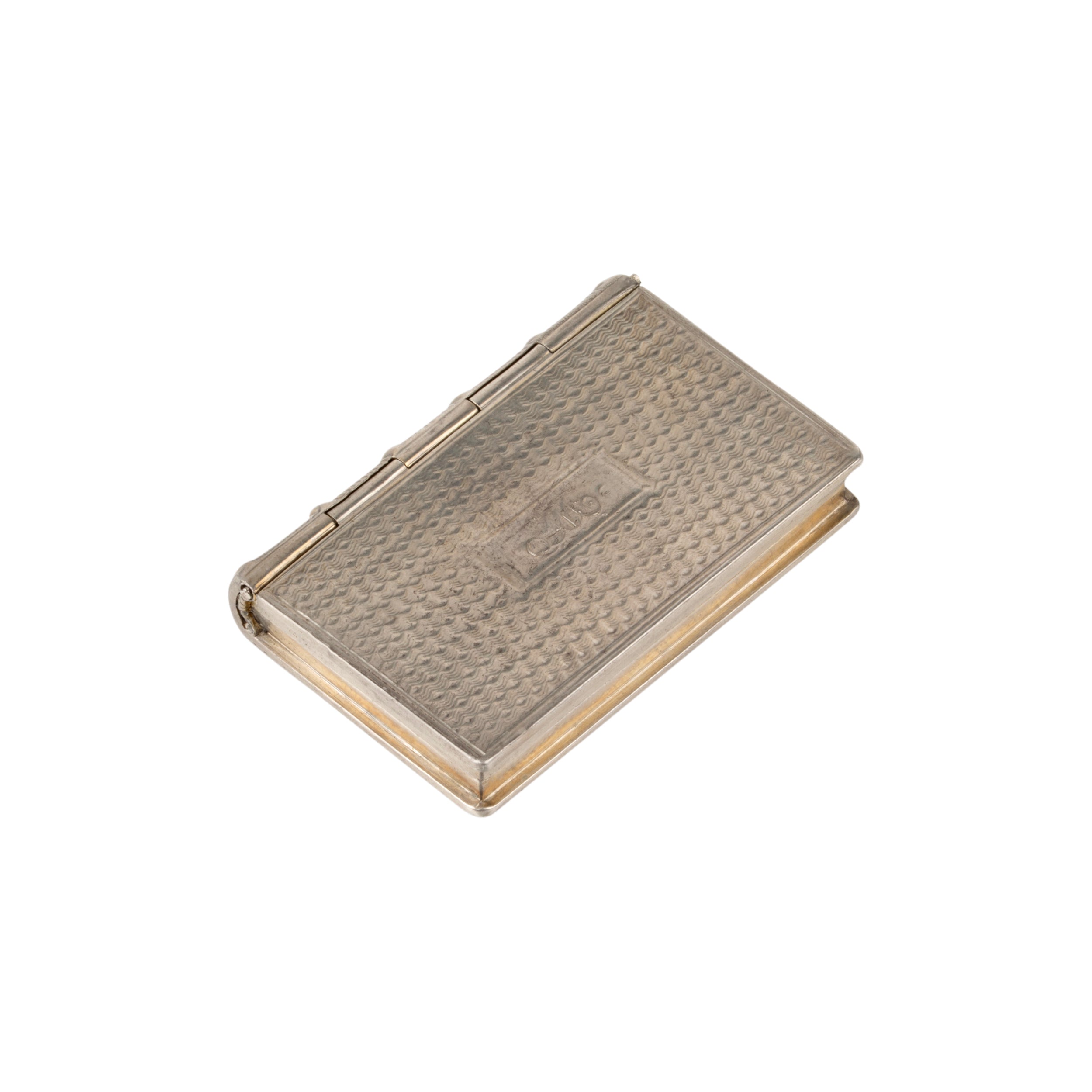 Silver vinaigrette in the form of a novelty book by Taylor & Perry. Featuring an engine-turned cover, depicting book pages, a ribbed spine, and a gilded pierced floral grille.