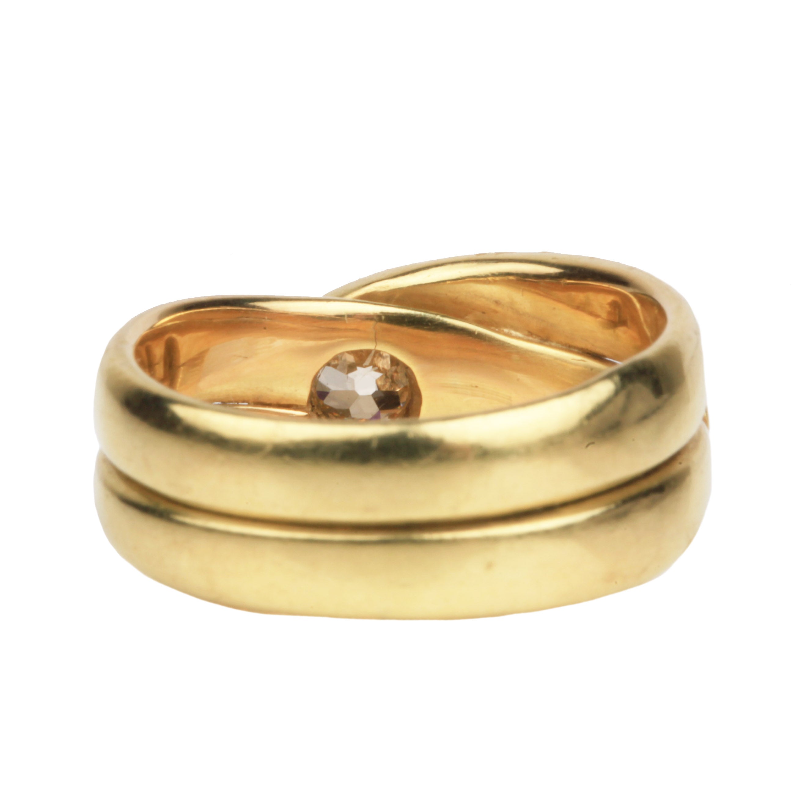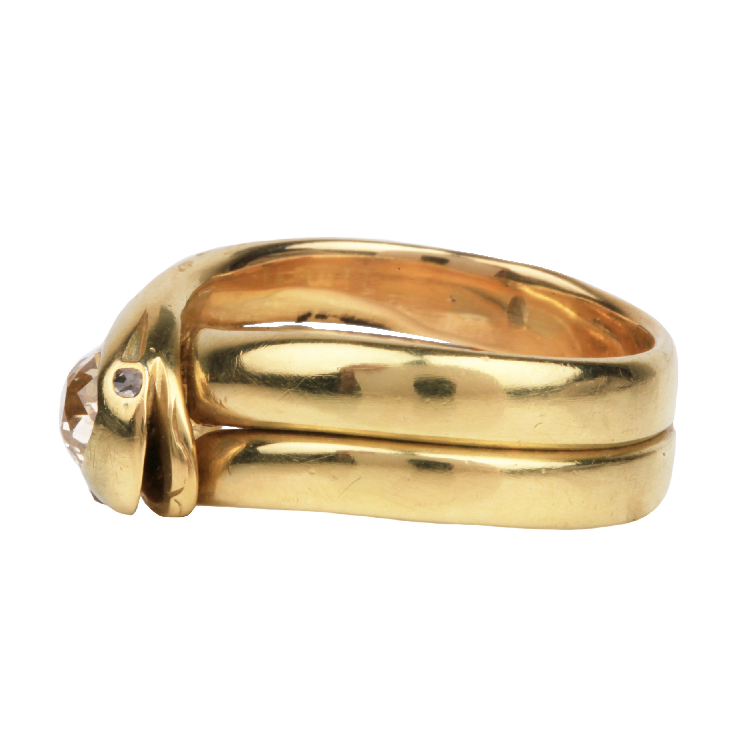 Victorian era diamond snake ring, in 18k gold. Old Mine cut diamond set in the head, with Rose cut diamonds for eyes. Heavy in weight. Circa 1860. English in Origin.