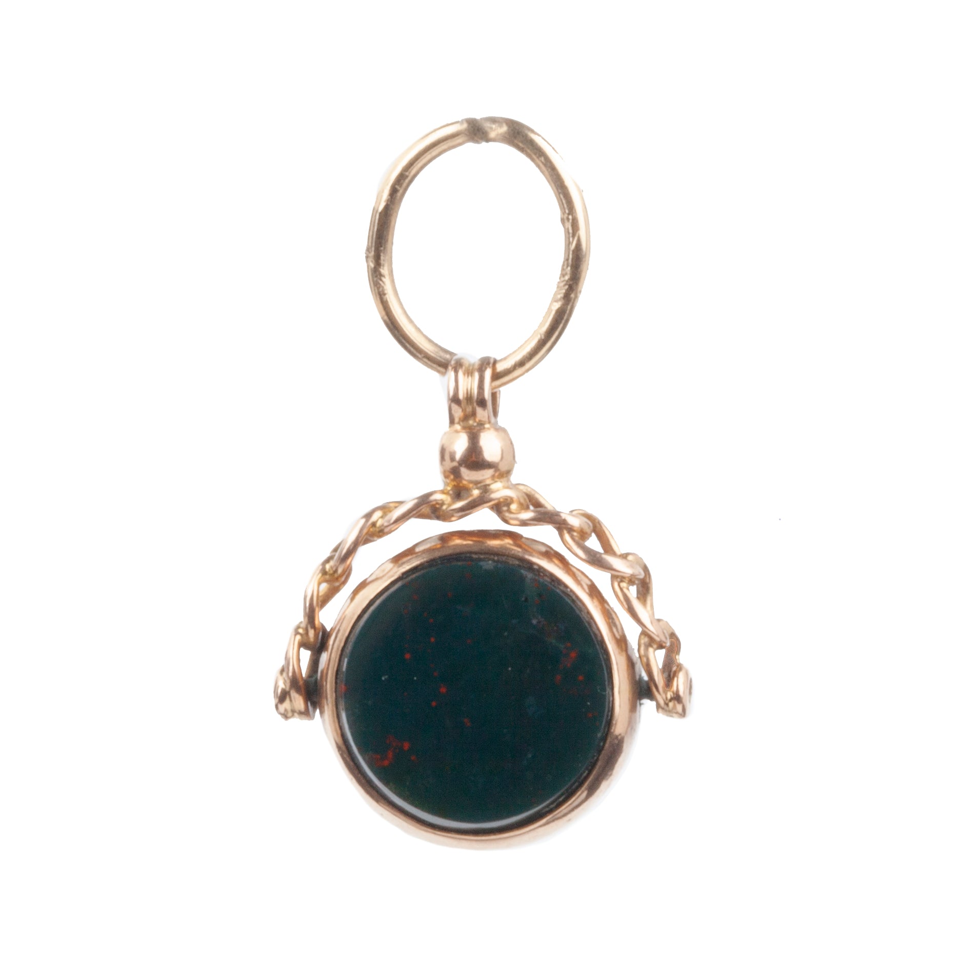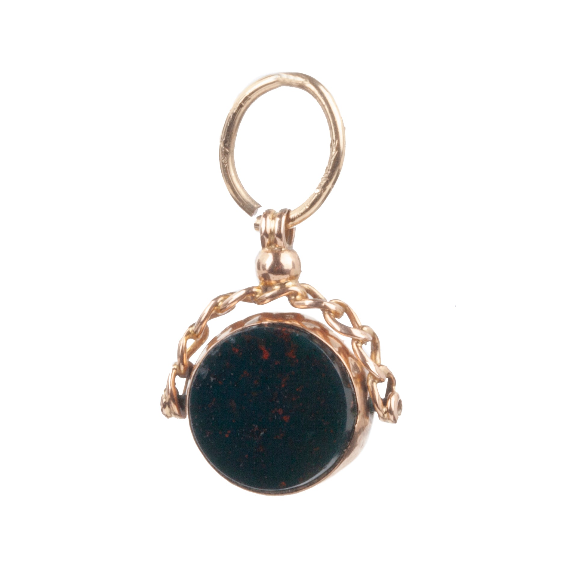 Victorian era spinning watch fob with bloodstone panels in 9k rose gold. English in origin. Circa 1880.