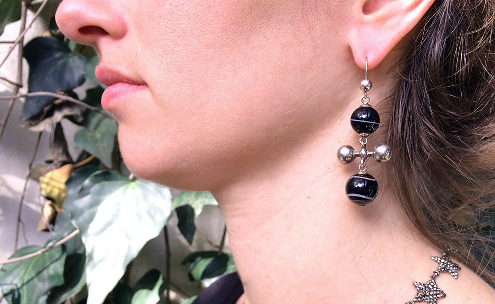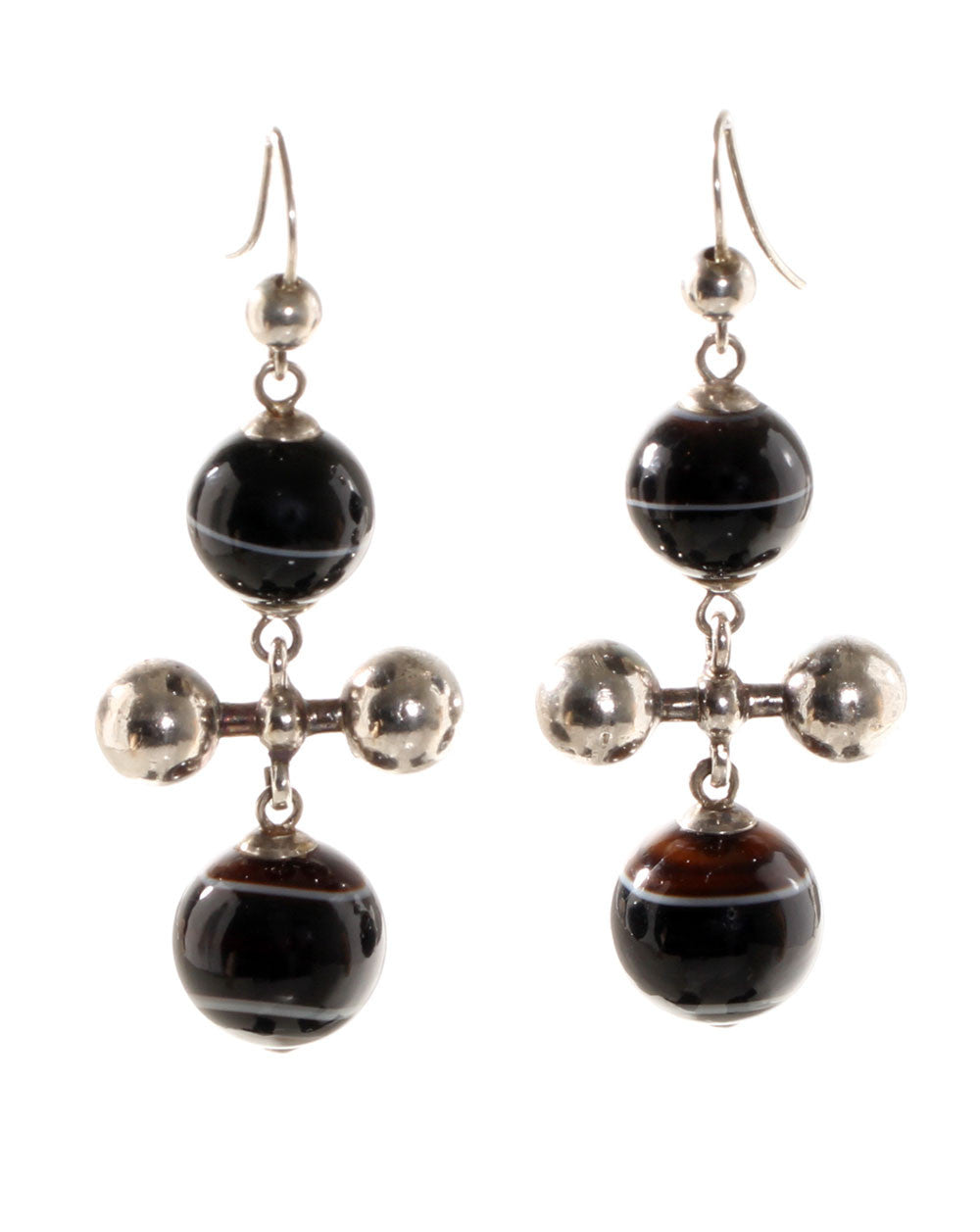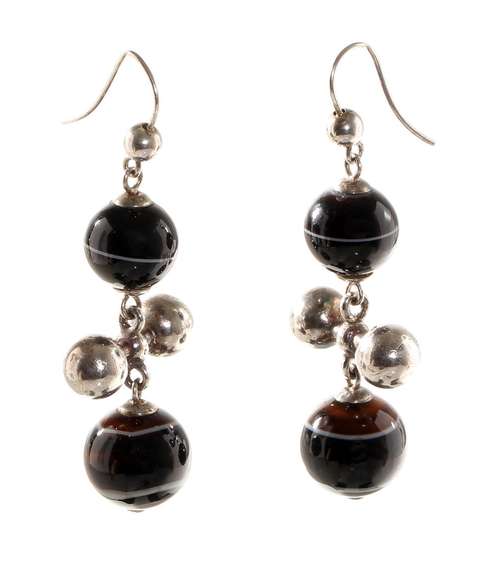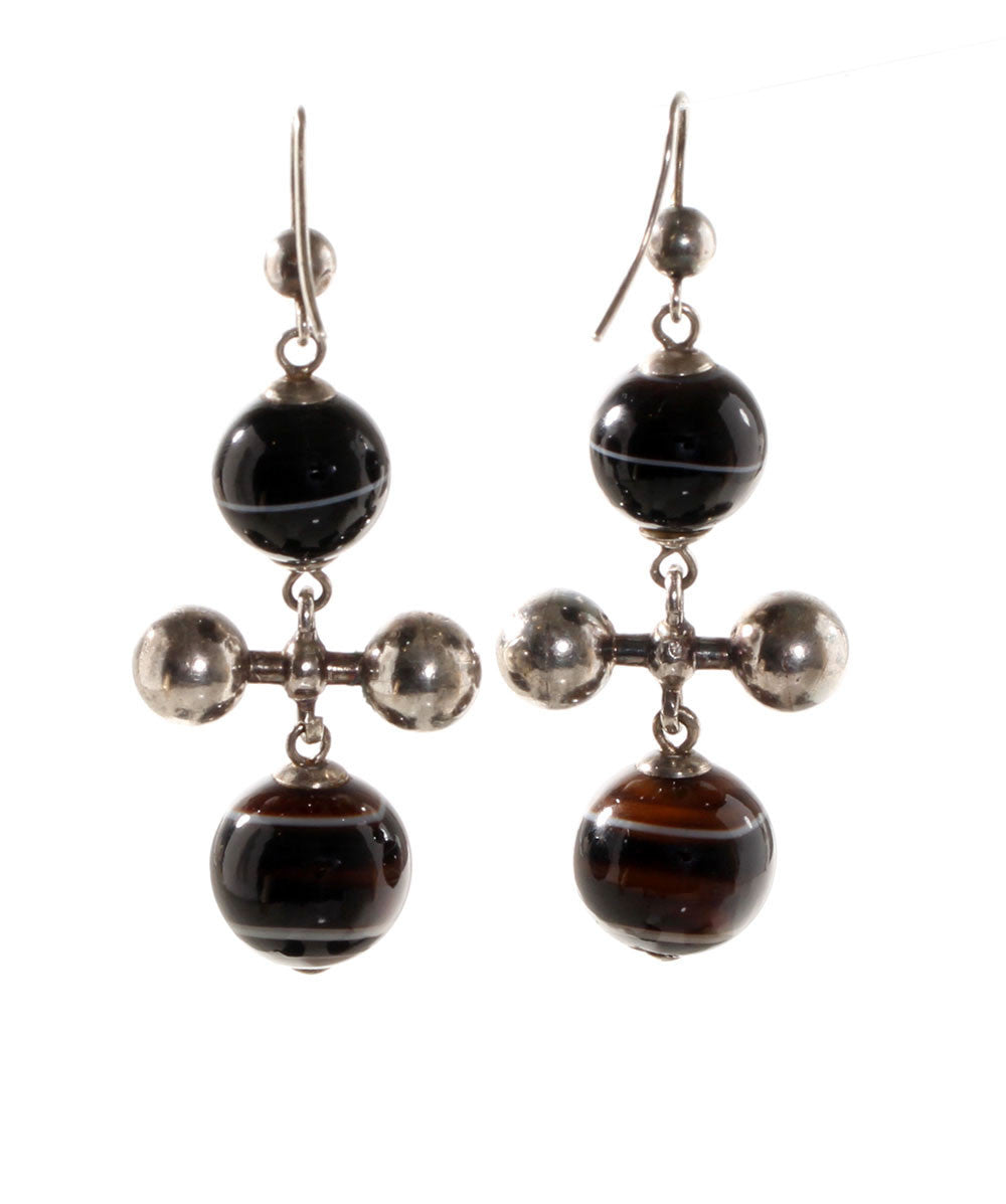 Late 19th Century Victorian Earrings. Banded agate stones in silver. Very bold in design. Circa 1870-1880. English in origin, found in London.