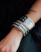Great wide size for stacking or worn as an everyday bracelet. Approximate 6.5" inner circumference and 1.25" in width.