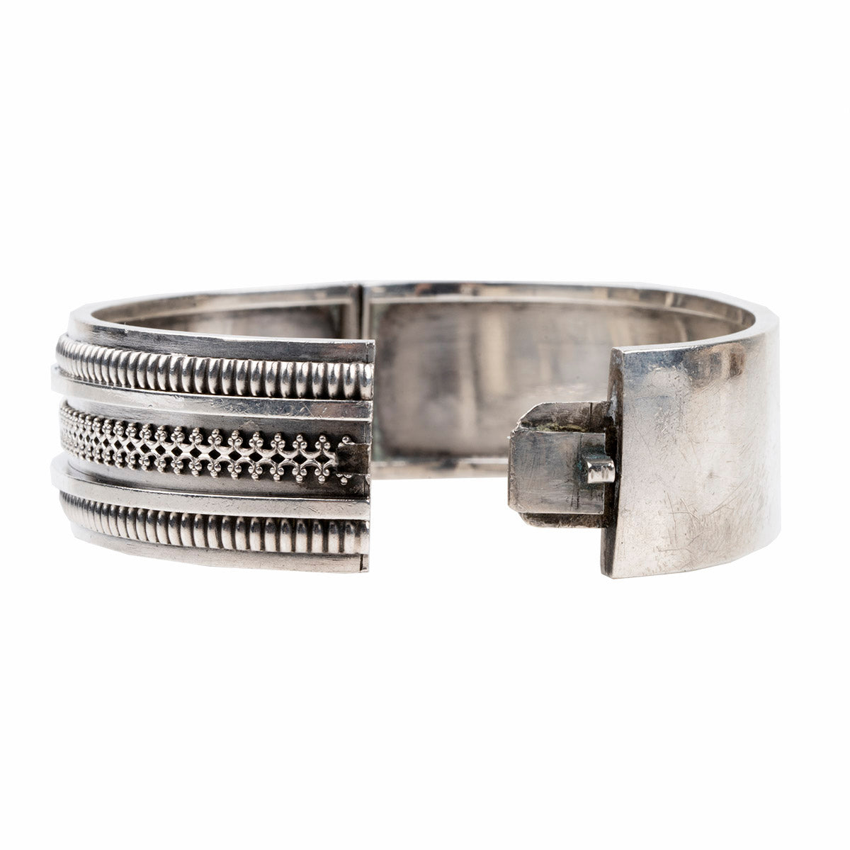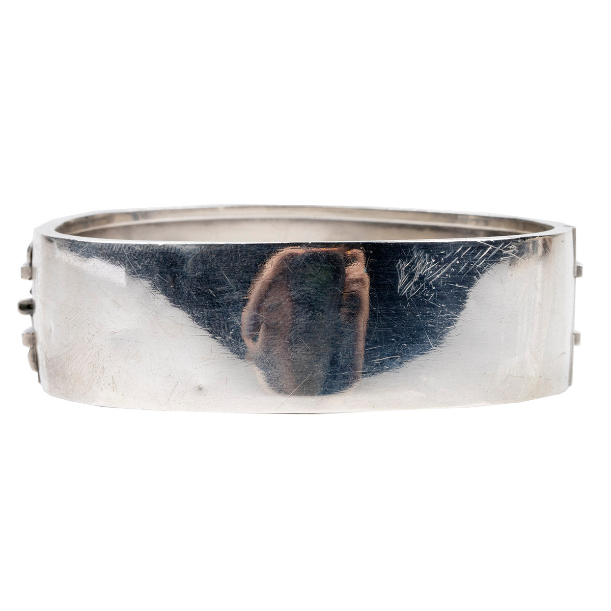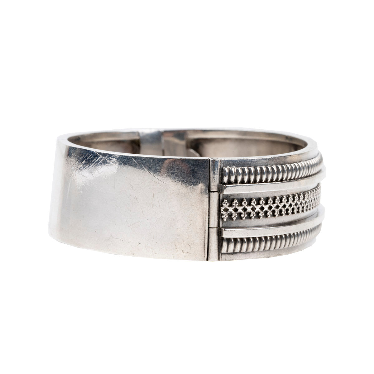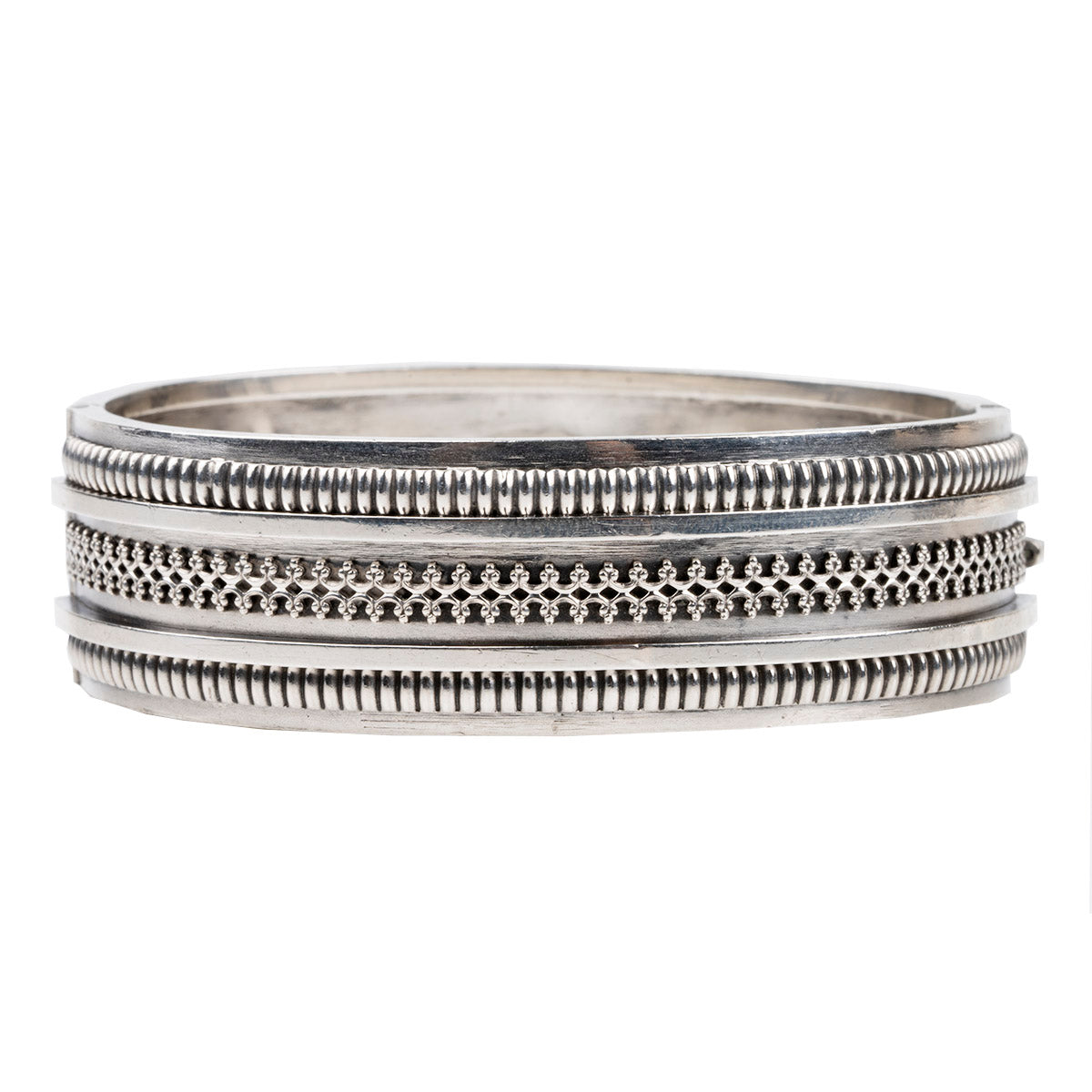 Victorian era sterling silver bangle bracelet with a 3-dimensional modern striped design. shirt button detail and plain design. English in origin. Circa 1880.