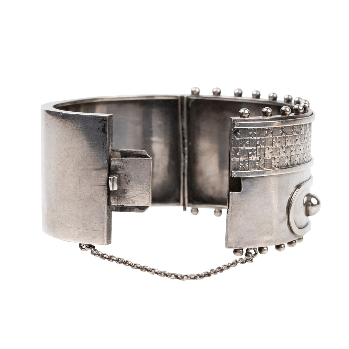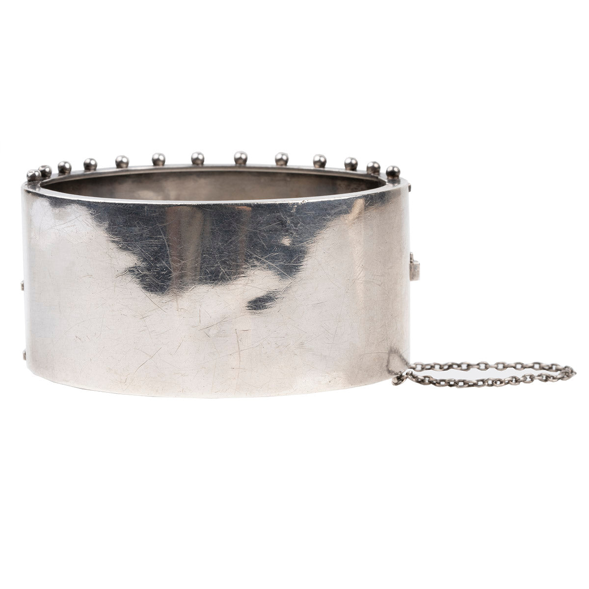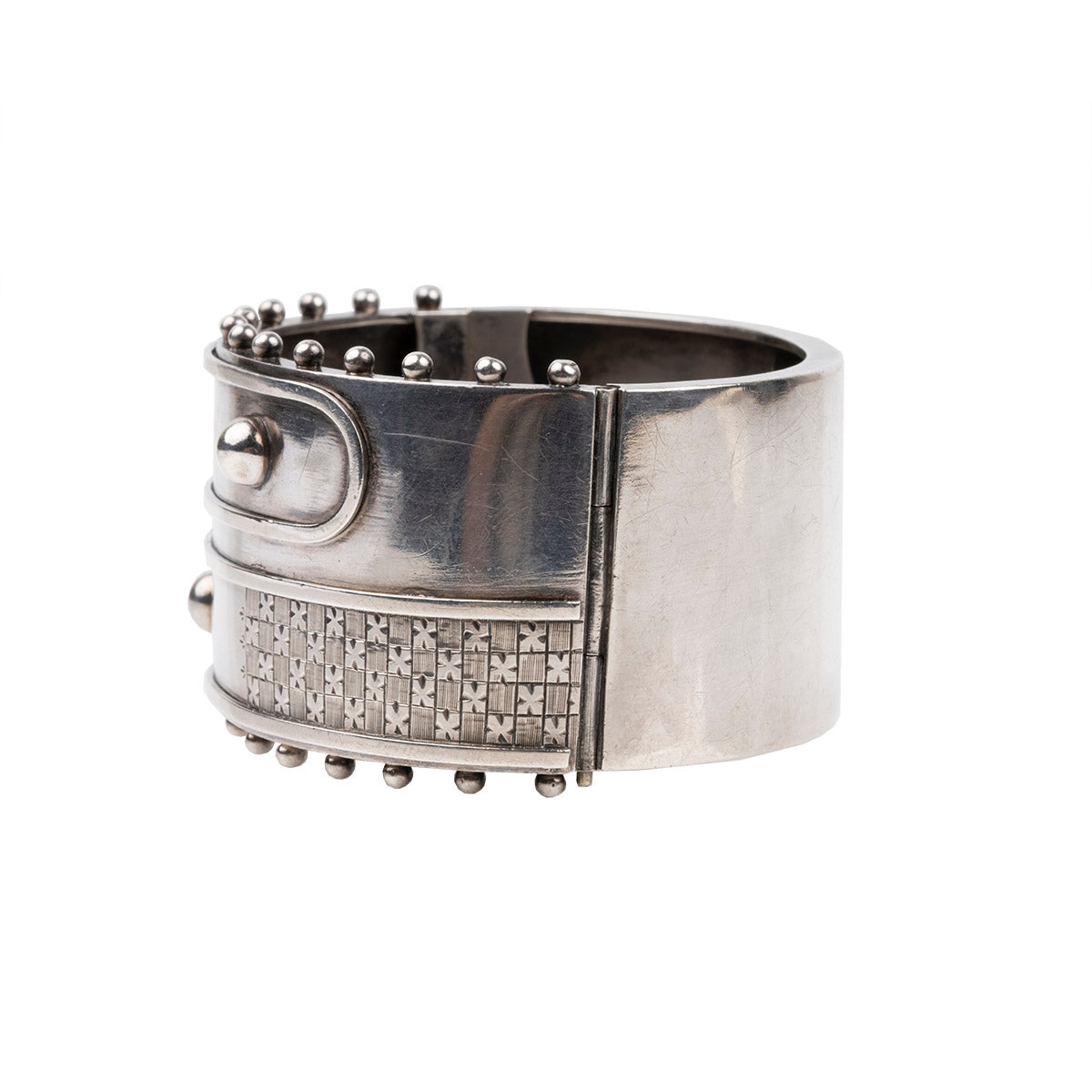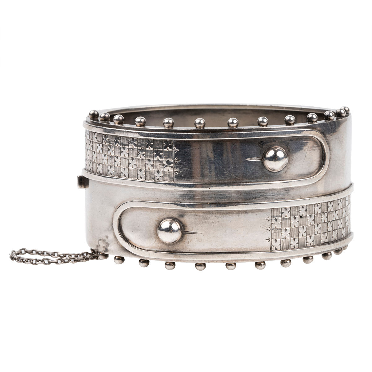 Victorian era sterling silver bangle bracelet with a double shirt button details. A bangle like this would have been the daytime jewel of choice for a well-appointed English woman of the 1870's and 80's. English in origin. Circa 1880.