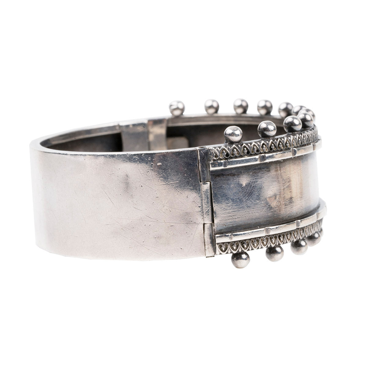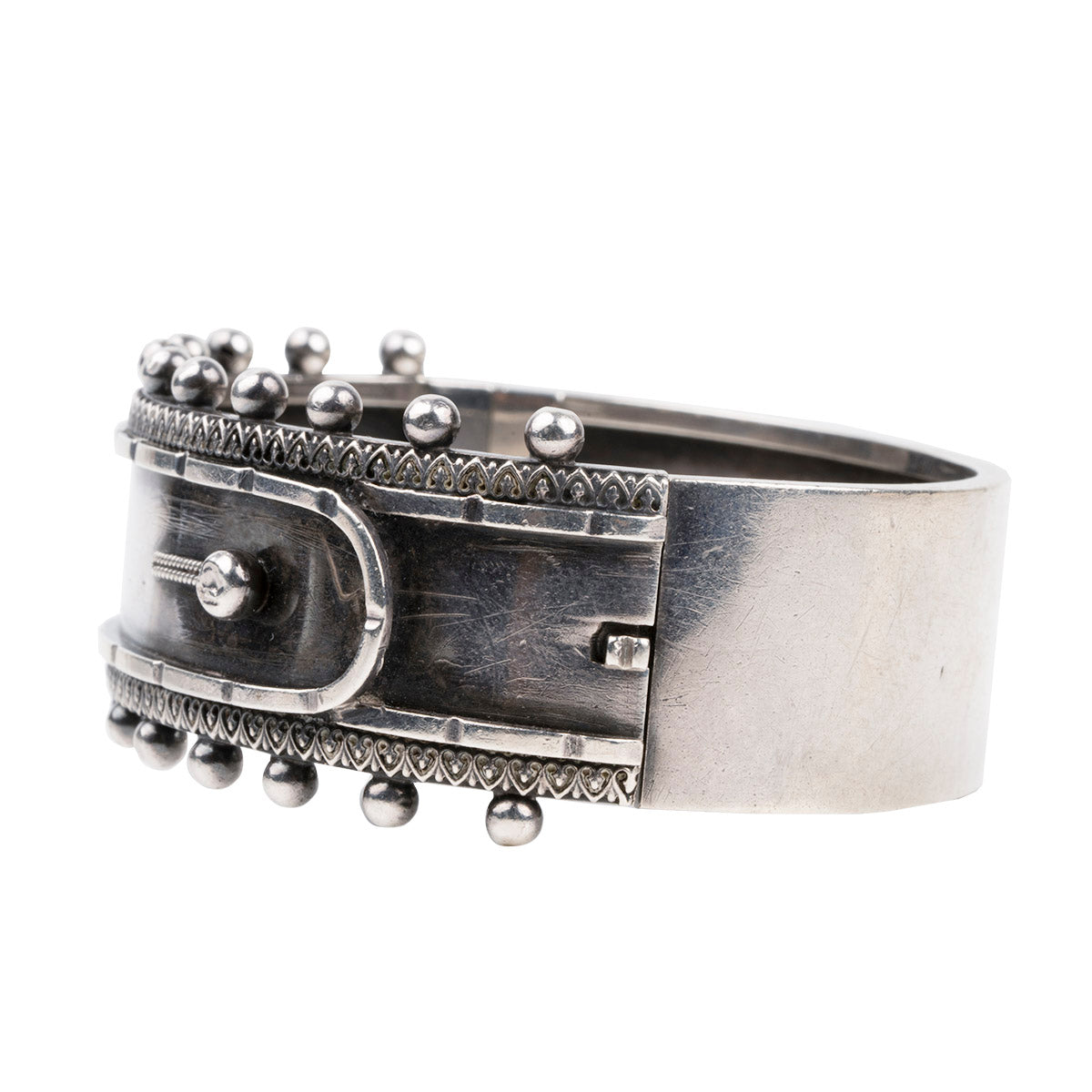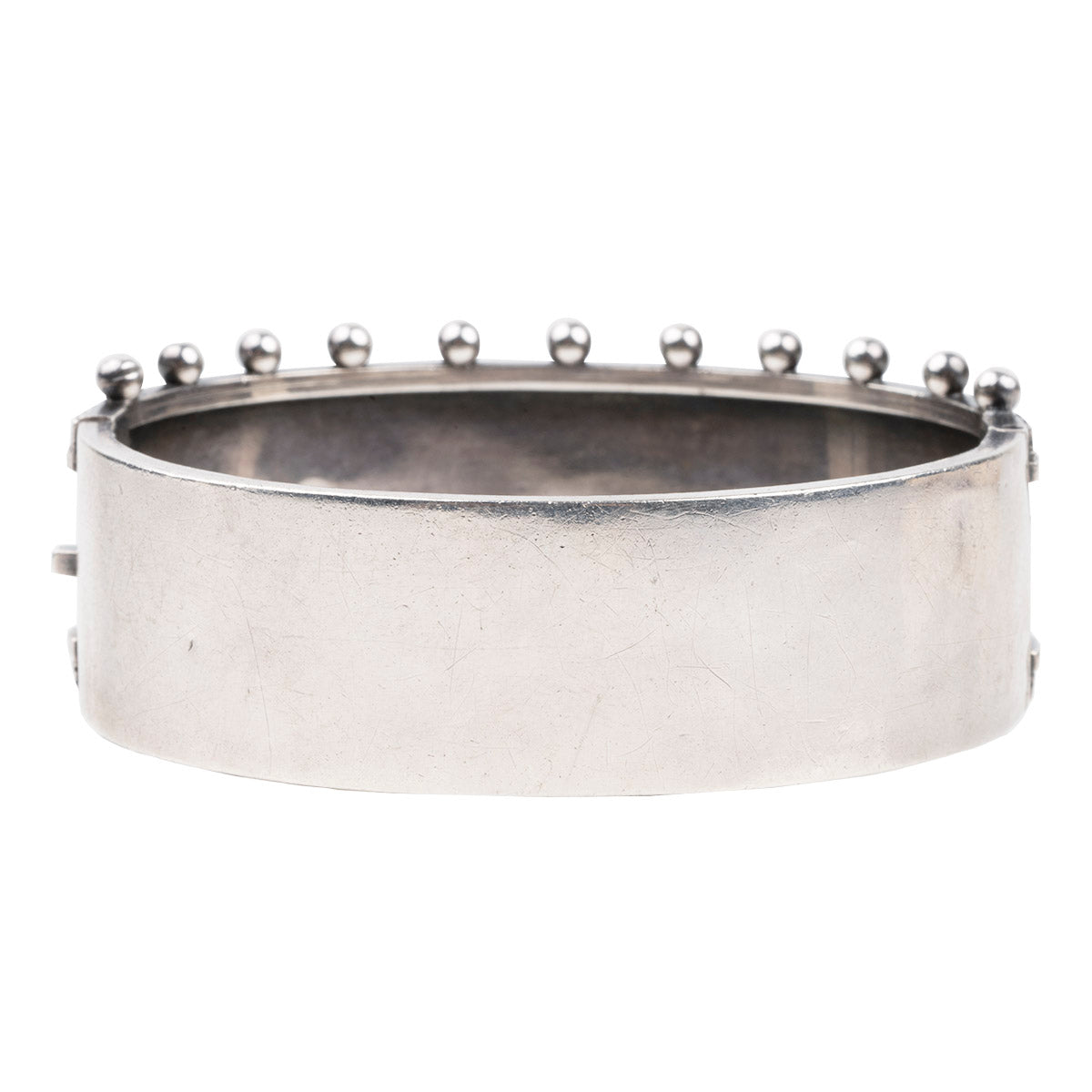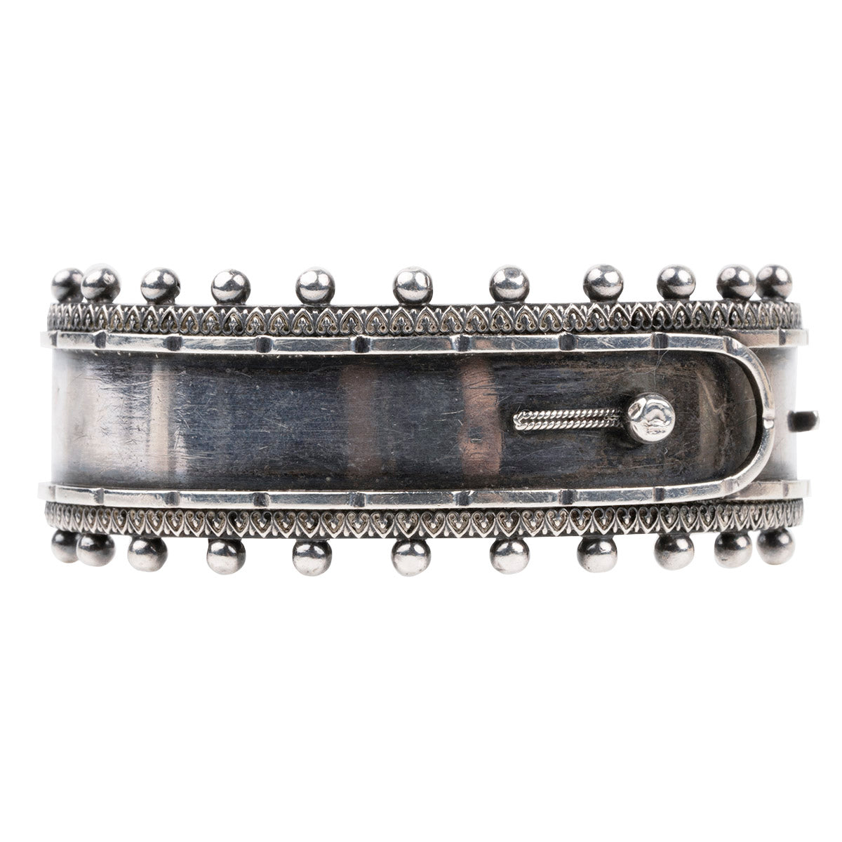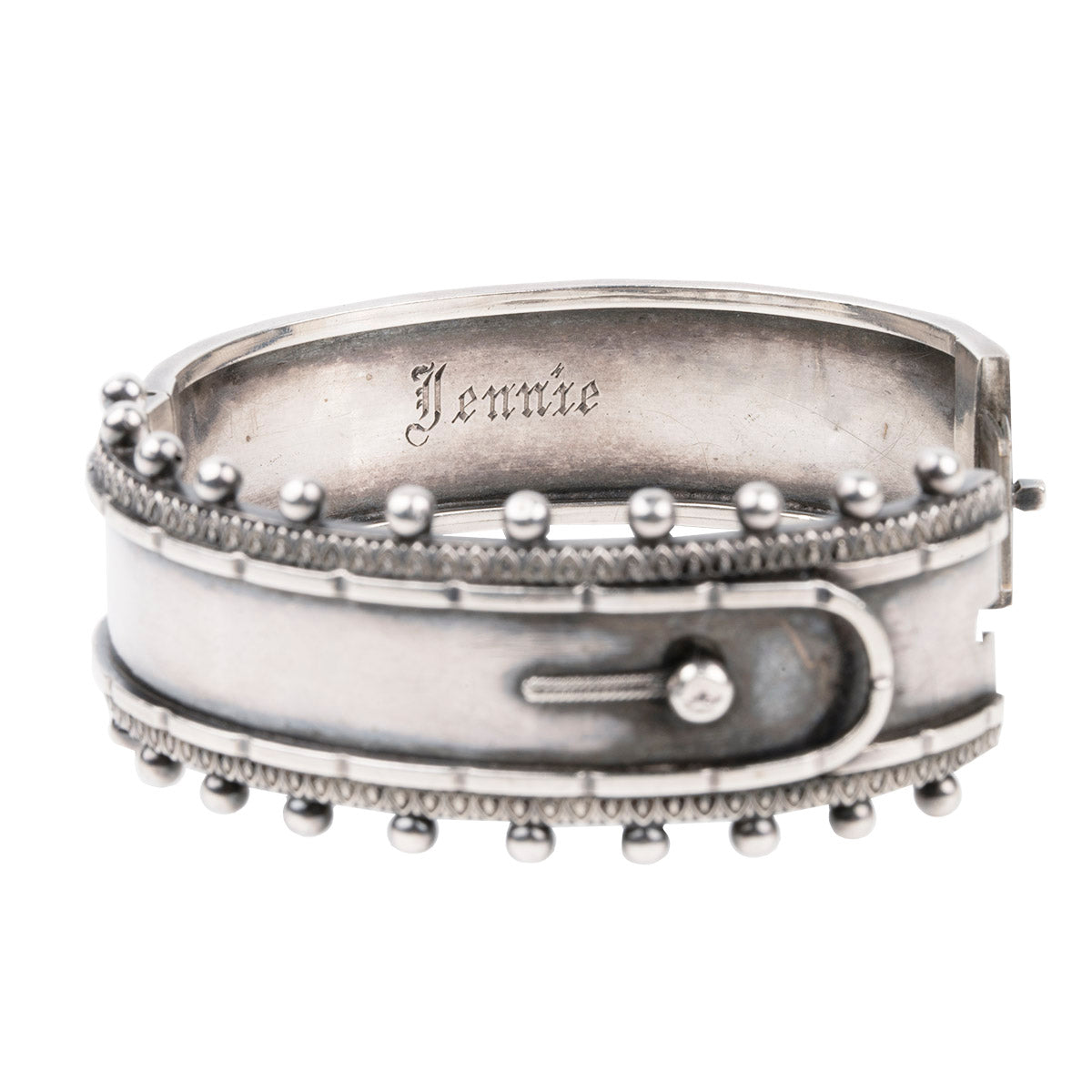 Victorian era sterling silver bangle bracelet with a shirt button detail. A bangle like this would have been the daytime jewel of choice for a well-appointed English woman of the 1870's and 80's. The interior of the bangle is engraved "Jennie". English in origin. Circa 1880.