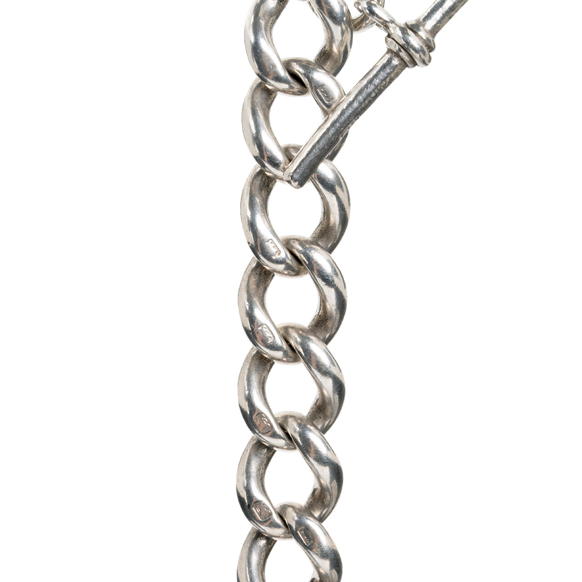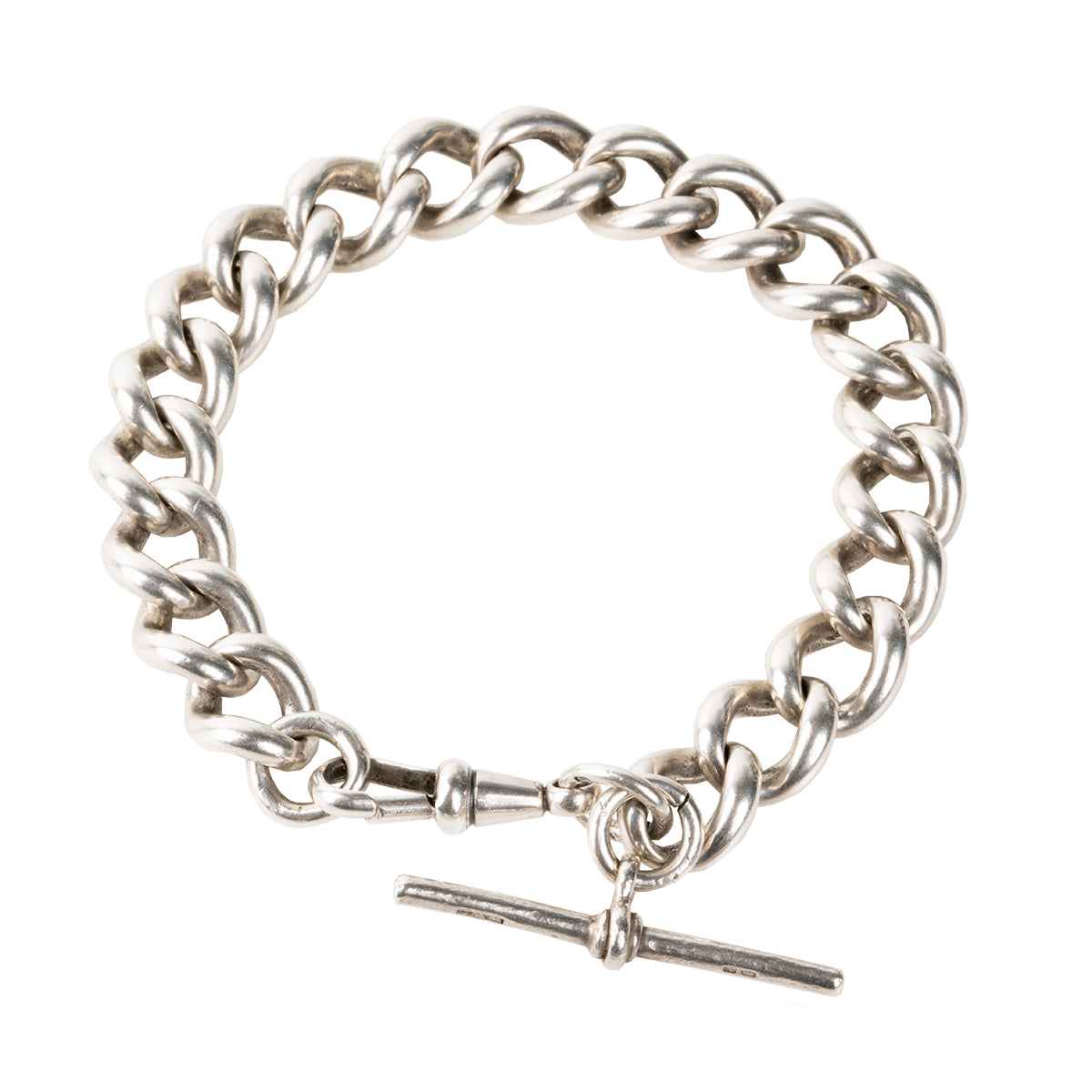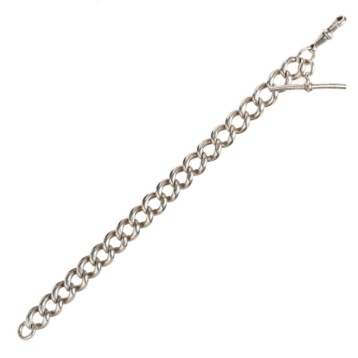 Victorian era sterling sliver Albert watch chain bracelet, with curb links. Perfect for everyday wear. Nice heavy links with a watch toggle. English in origin. Circa 1890.
