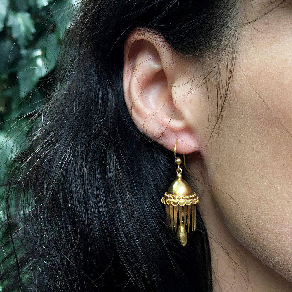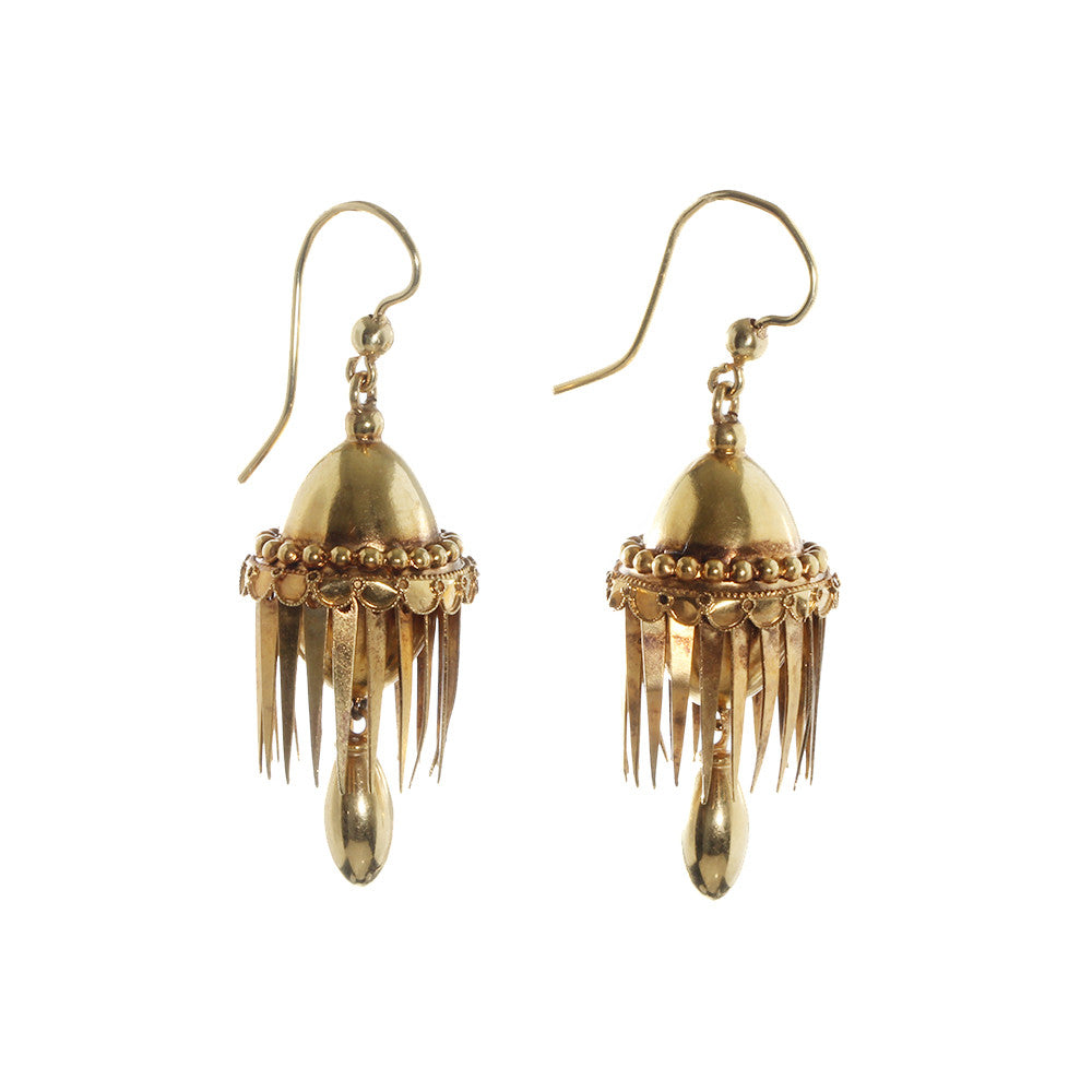 Victorian Era gold drop earrings, in 15k gold. The dagger tassels details have great movement. Light weight and very wearable. Circa 1870, English is origin.