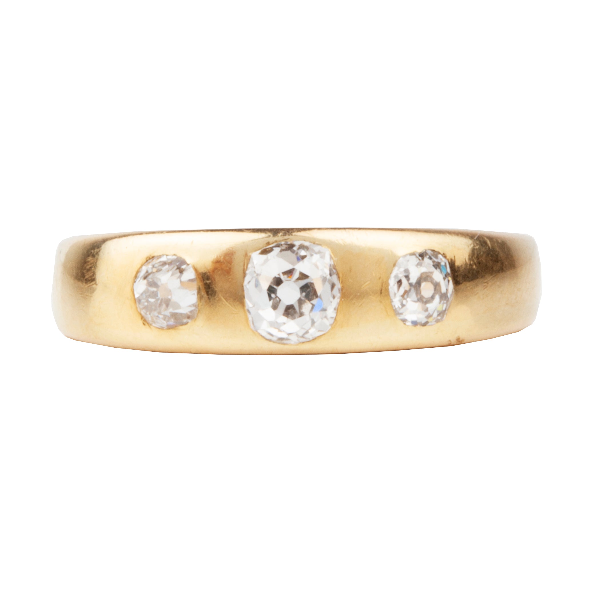 Victorian era three stone old mine cut diamond ring, in 18k gold. Flush set diamonds. English in origin. Circa 1880.