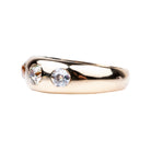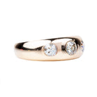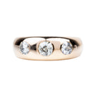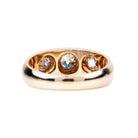 Victorian era flush set three stone old mine cut diamond ring, in 18k gold. English in origin. Circa 1890.