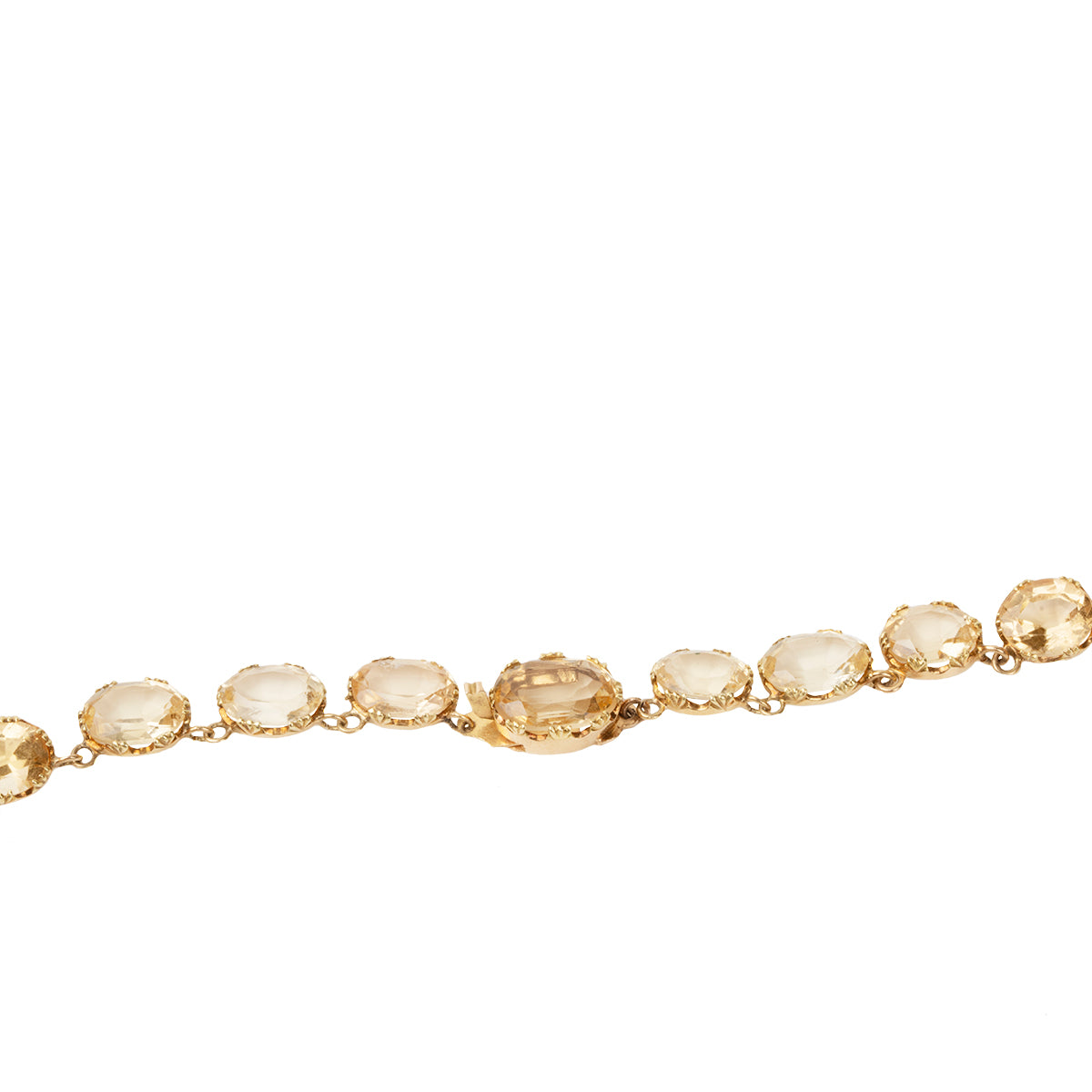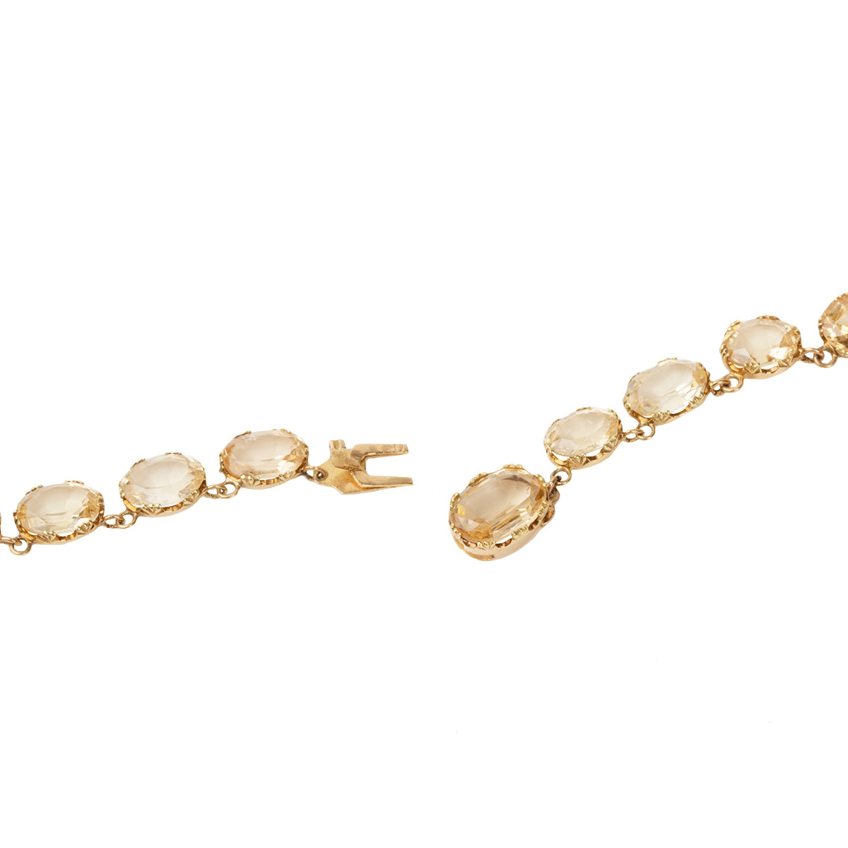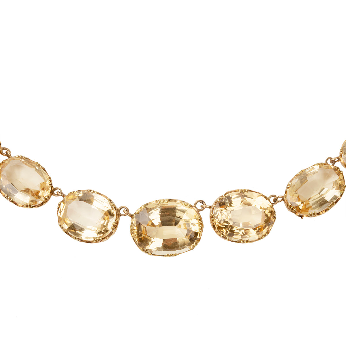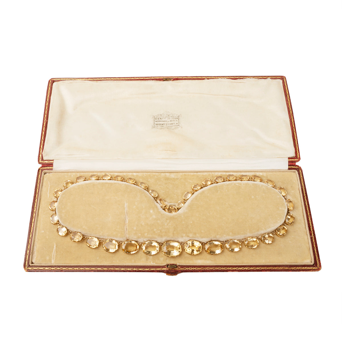 A fine topaz gemstone necklace, in gold collet settings. Fine oval stones in pale golden colors. In the original leather fitted tool red box. Wearable and Rare. English in origin. Circa 1870.