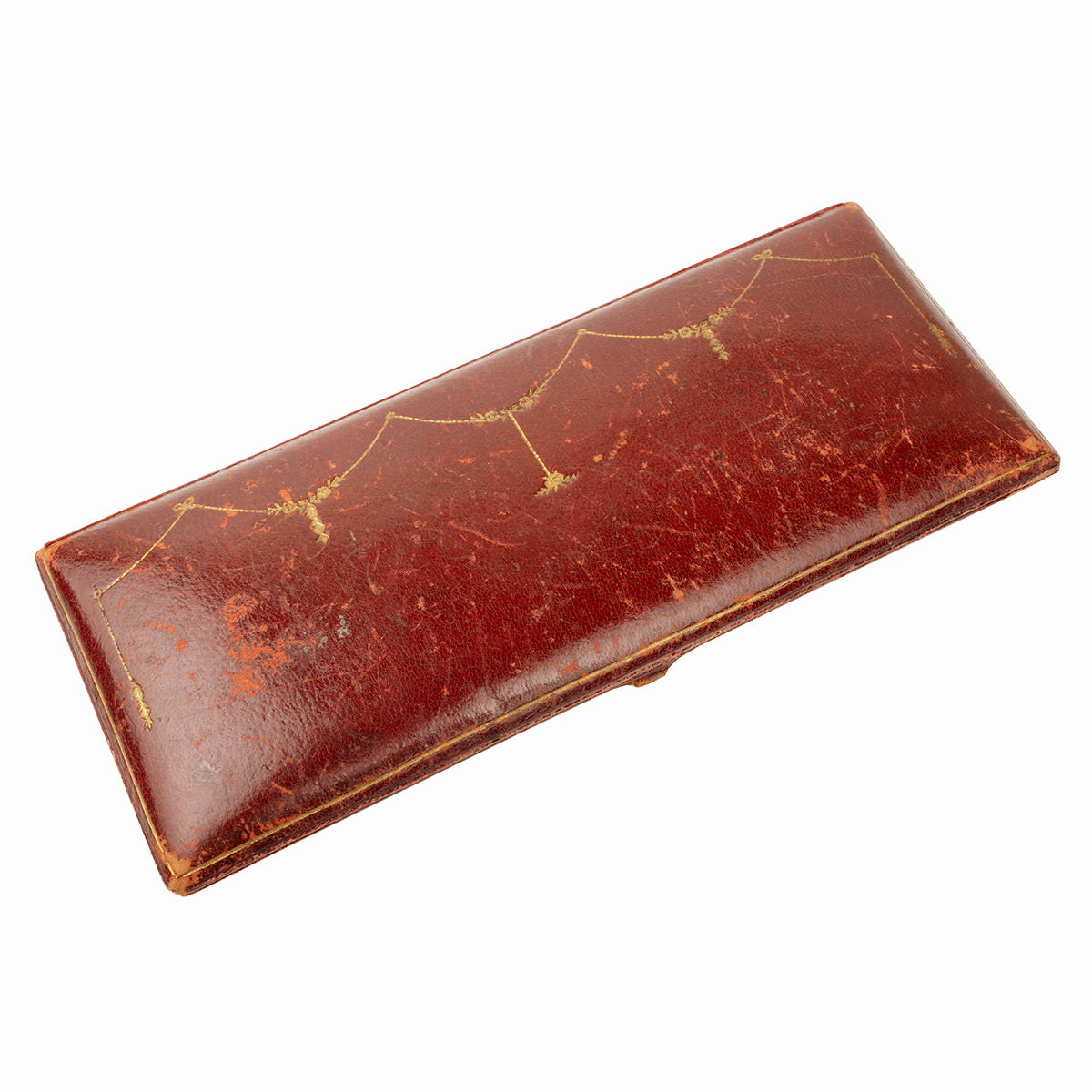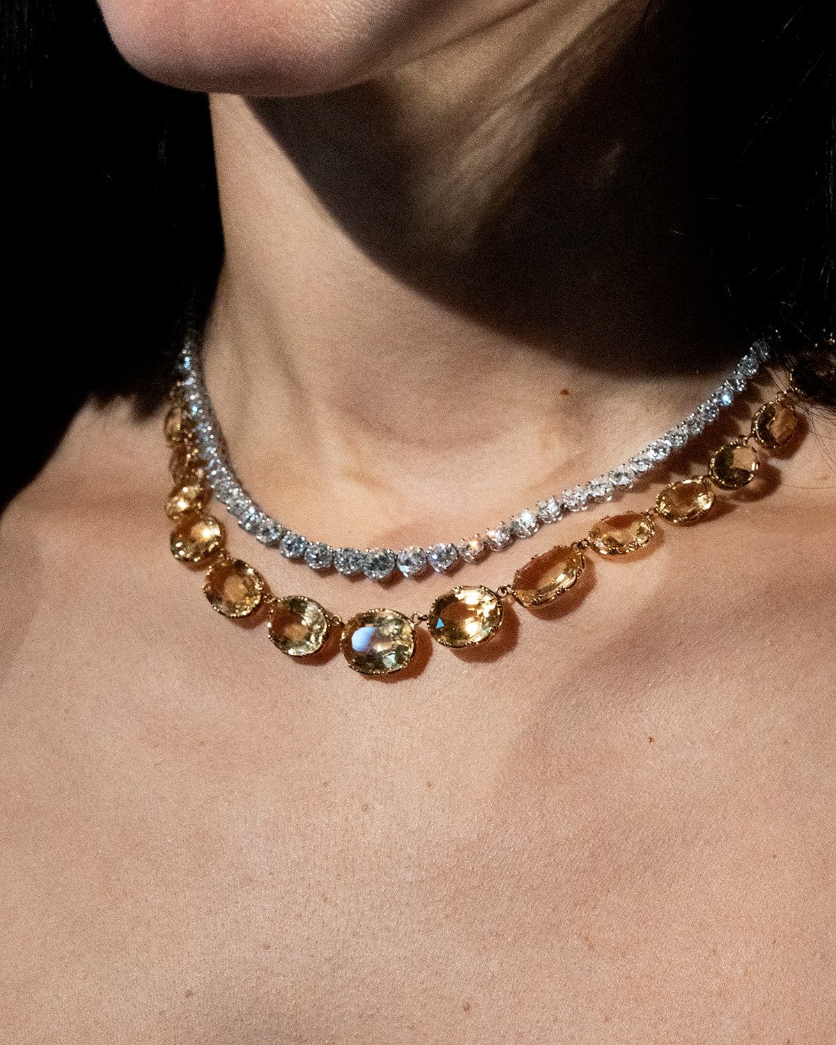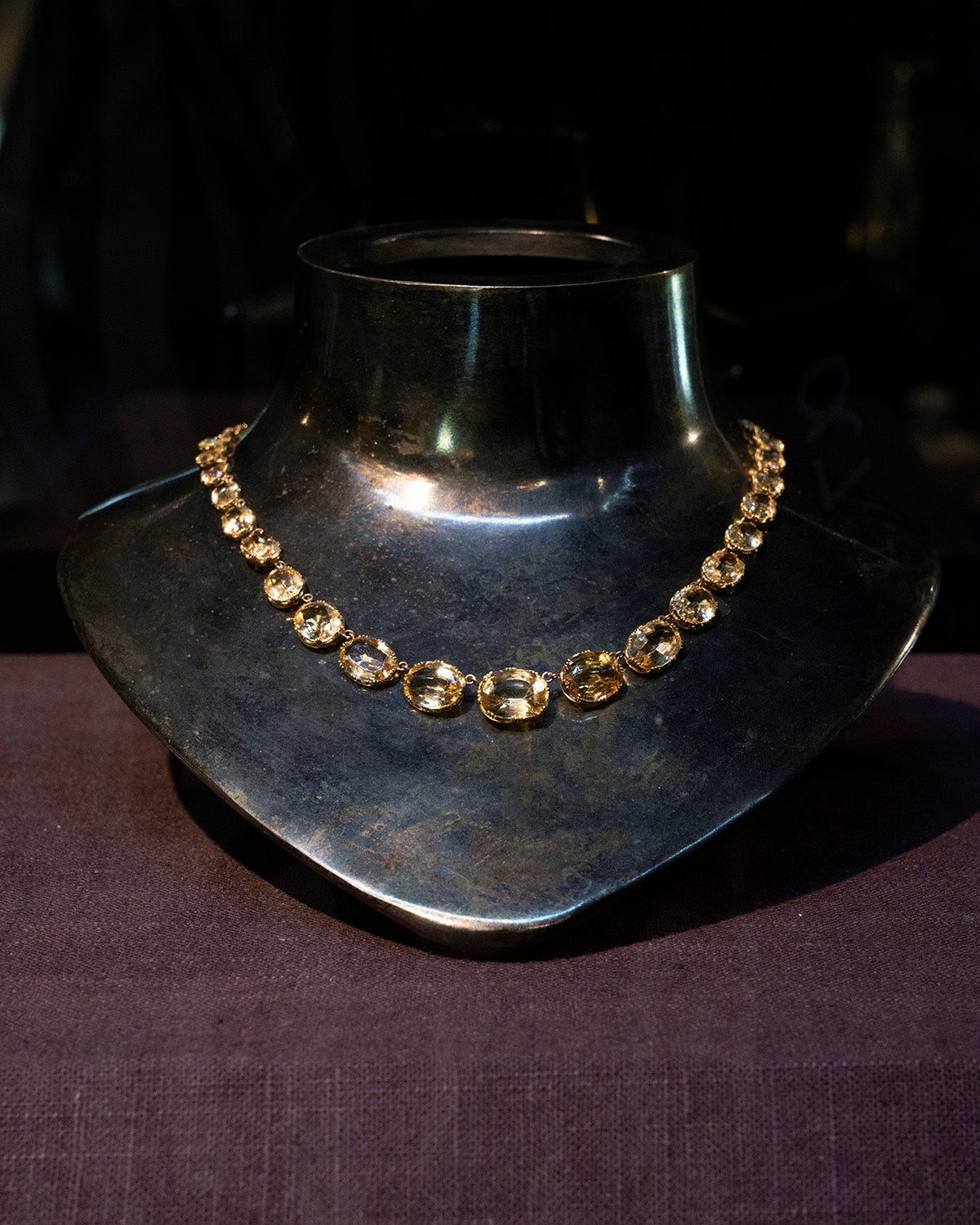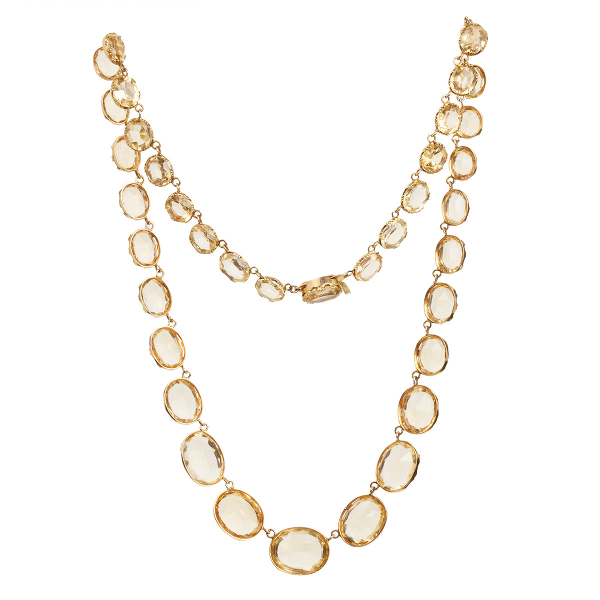 A fine topaz gemstone necklace, in gold collet settings. Fine oval stones in pale golden colors. In the original leather fitted tool red box. Wearable and Rare. English in origin. Circa 1870.