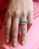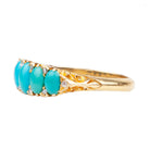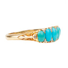 Victorian era Persian turquoise five stone ring with rose cut diamond accents, in 18k gold. English in origin. Circa 1890.