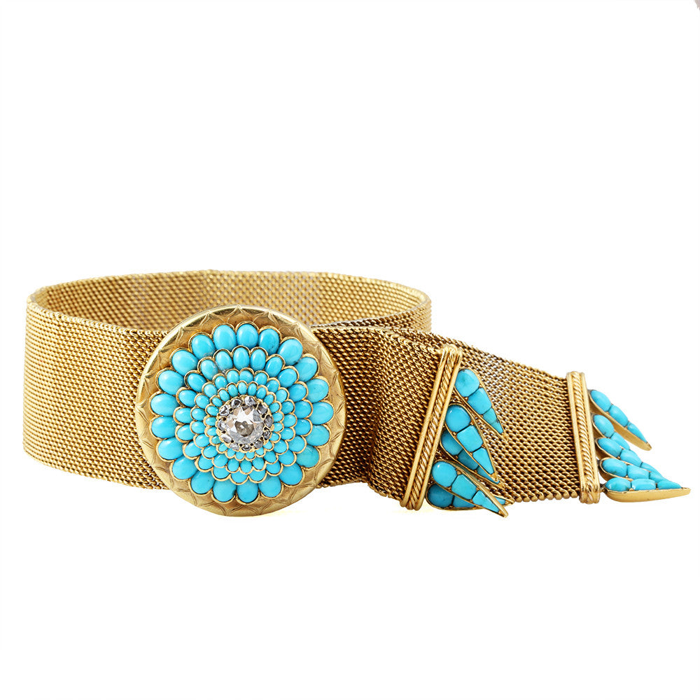 Victorian gold mesh bracelet with turquoise and diamond with turquoise tassels. Circa 1870. English in origin in 18k carat gold. Slide mechanism adjusts for a varied fit. Old mine cut center stone surrounded by rose cut diamonds and oval turquoise cabochons.