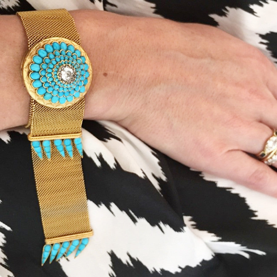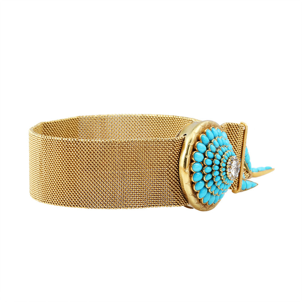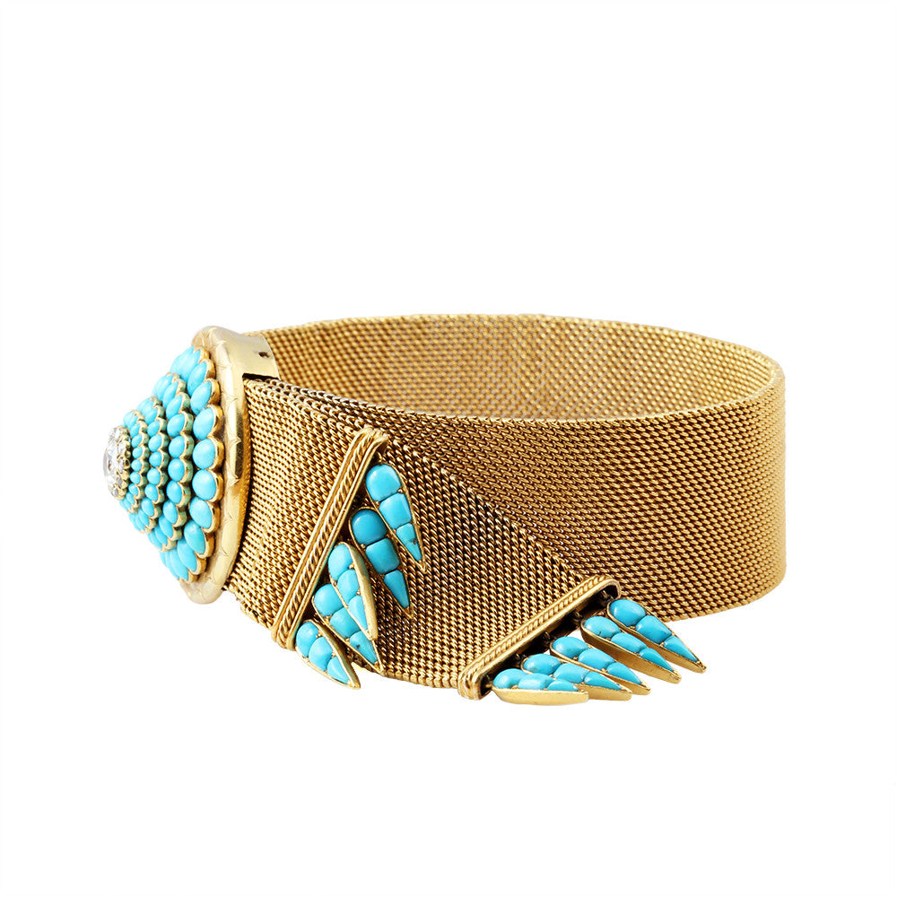 Victorian Era Turquoise and Diamond Woven Gold Bracelet