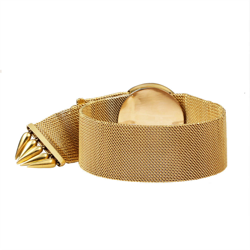Central element measures 1.25" across. Bracelet is .75" and adjust easily to fit many wrist sizes.