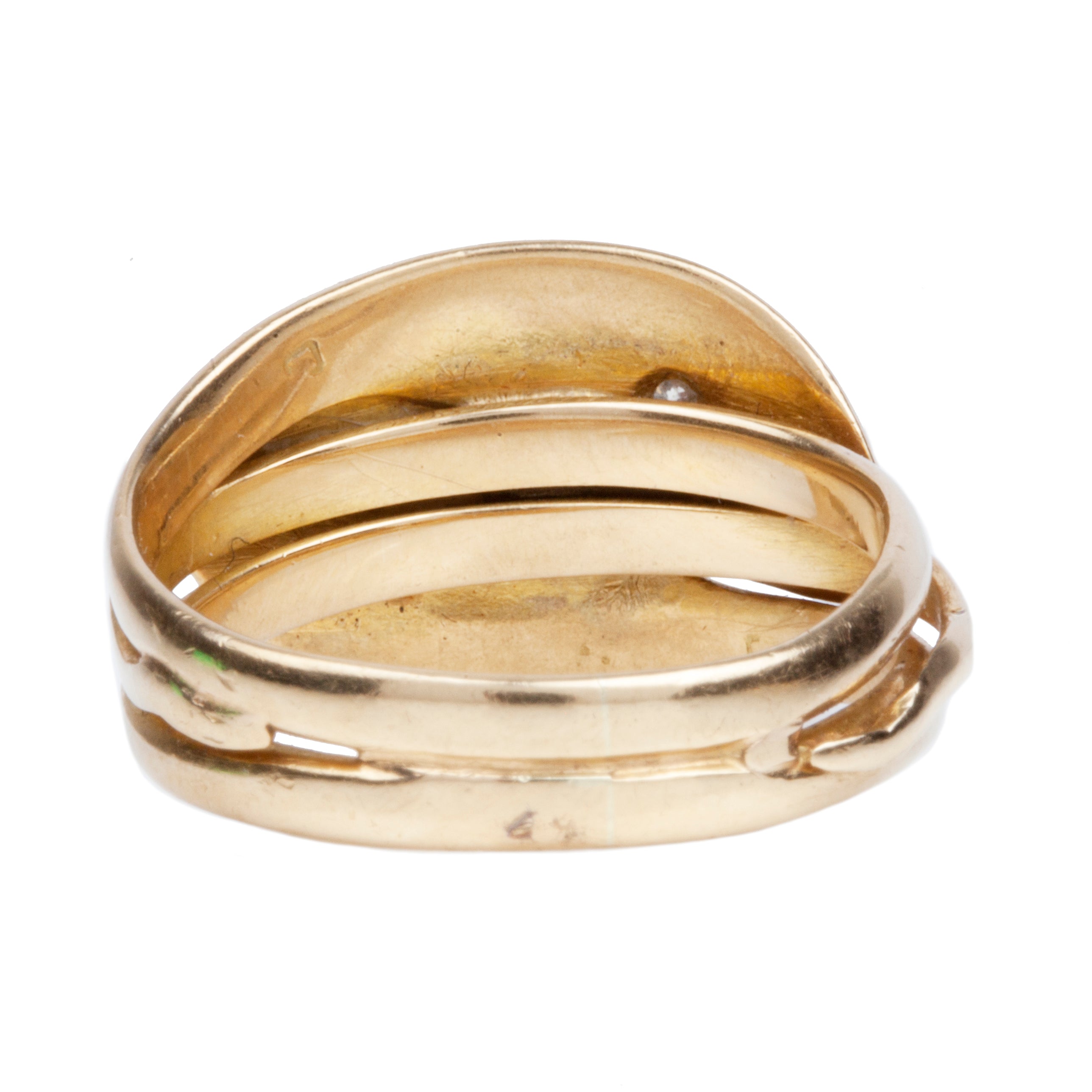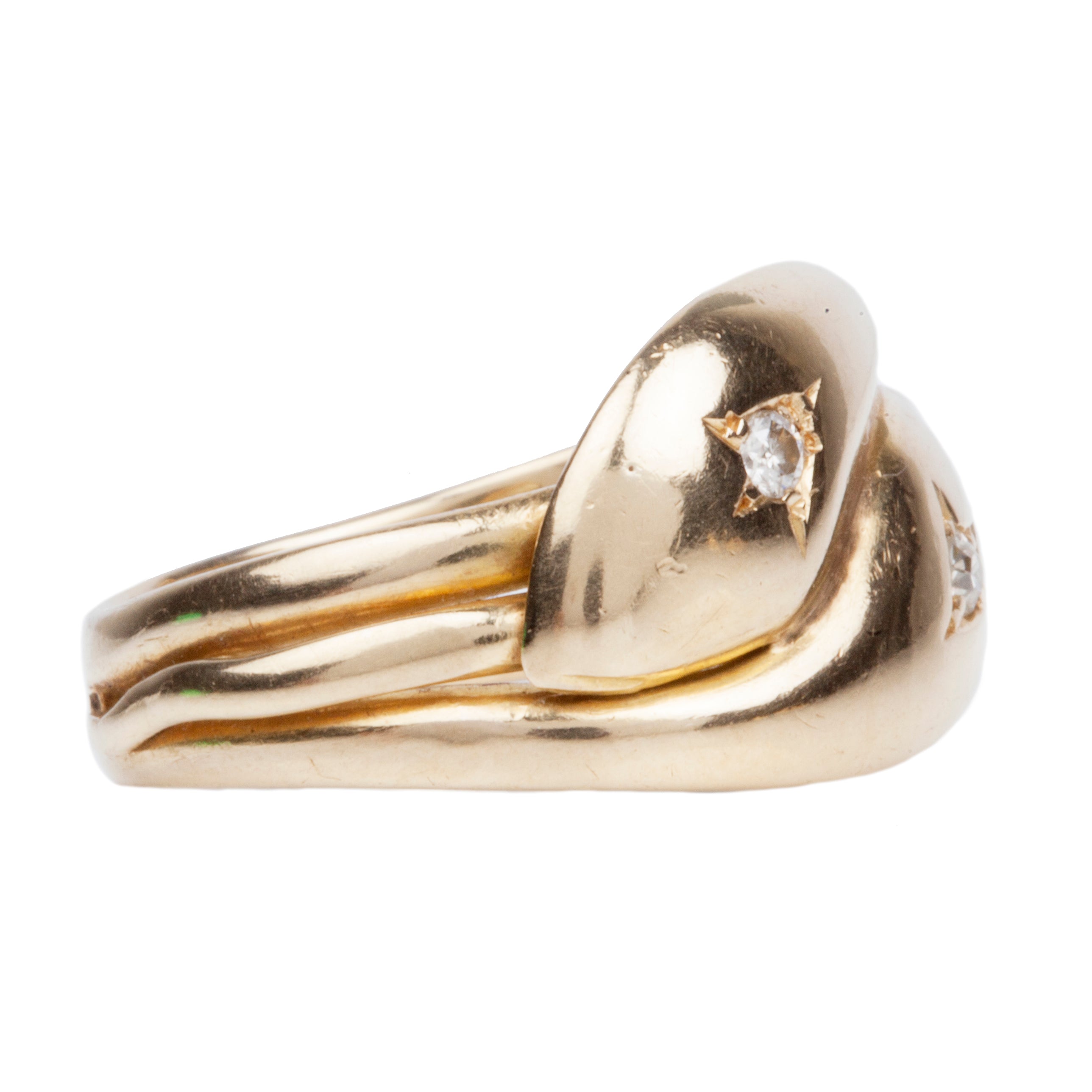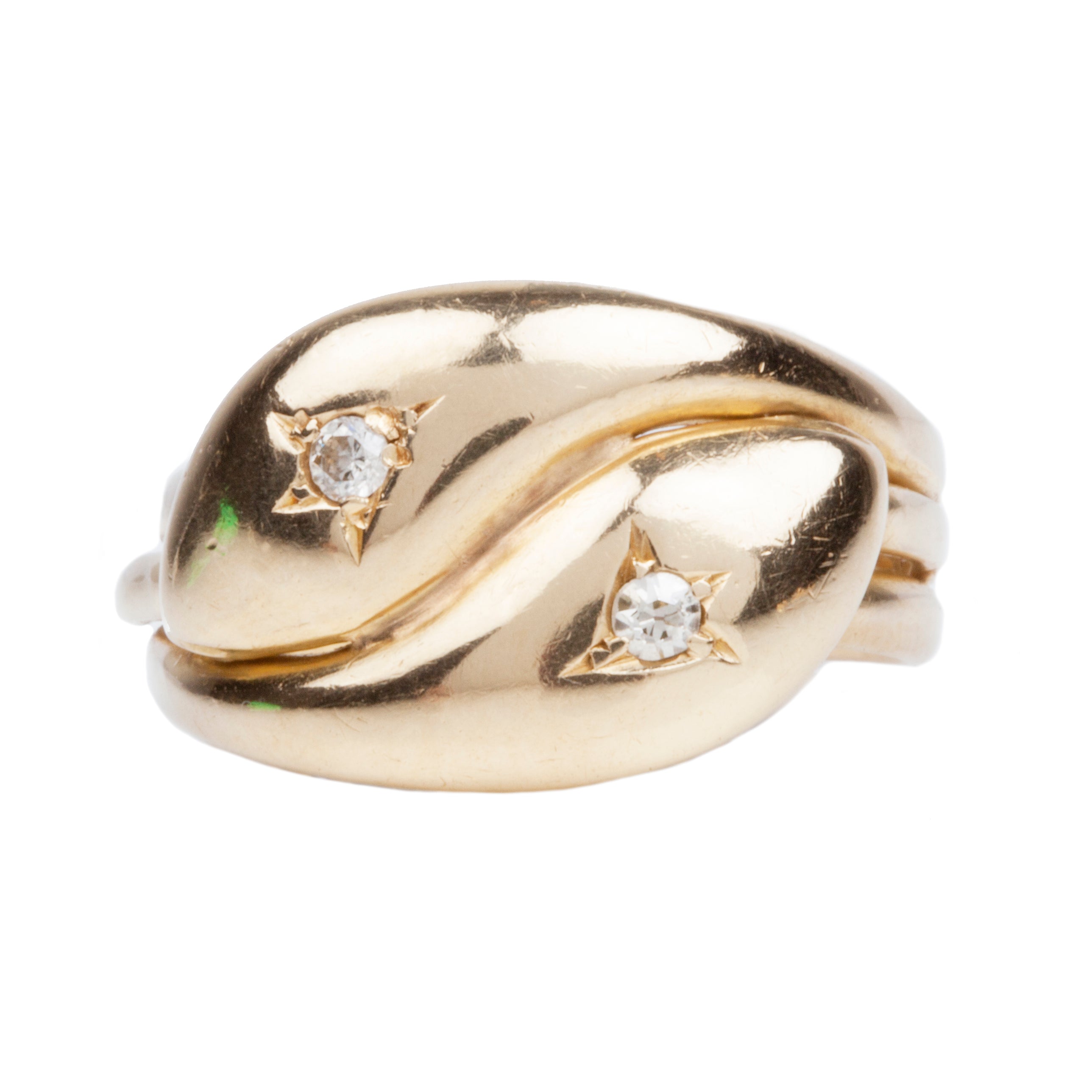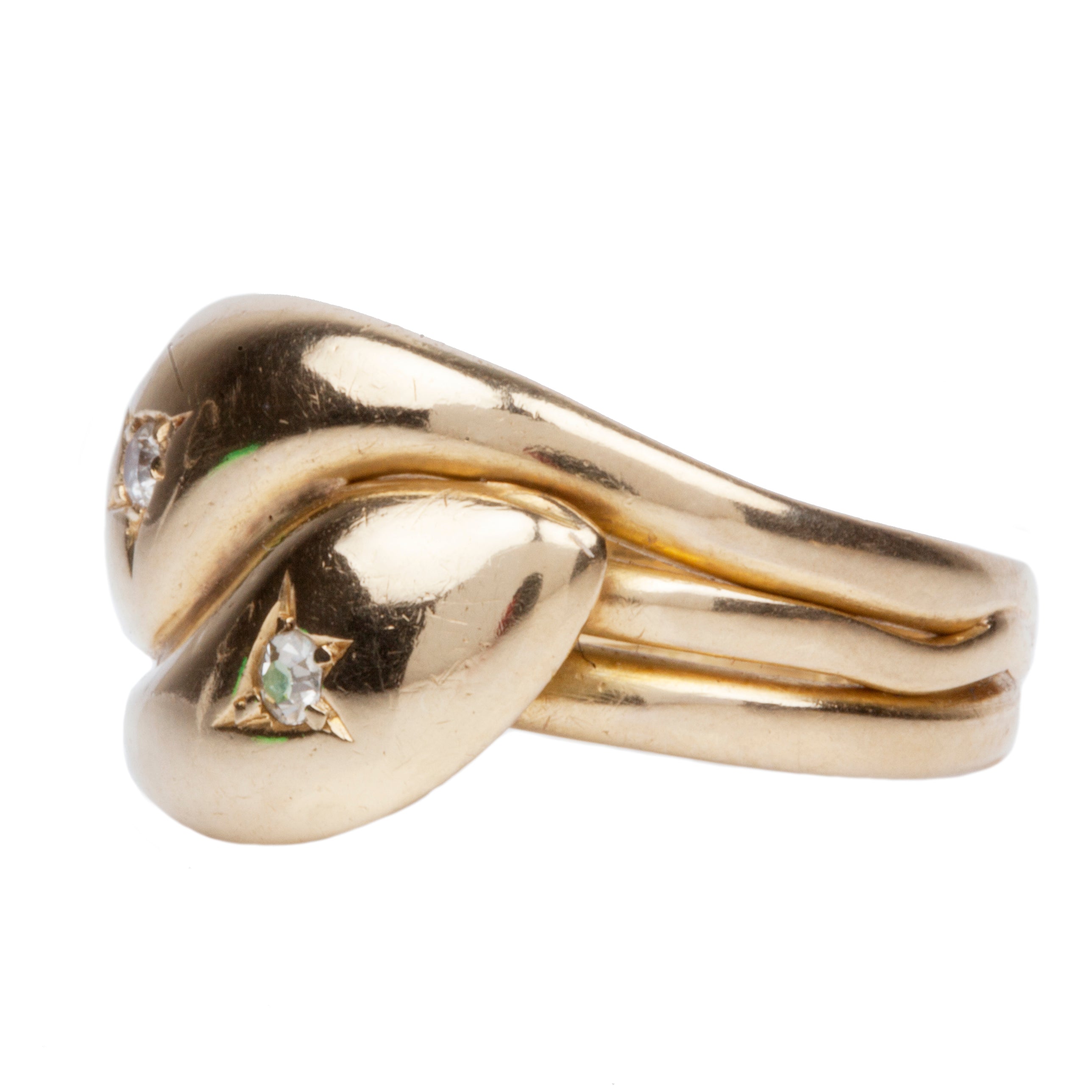 Victorian era twin snake ring with two Old Mine cut diamonds, 18k Gold. The snake was a popular 19th century symbol for eternal love. English in Origin. Circa 1890.