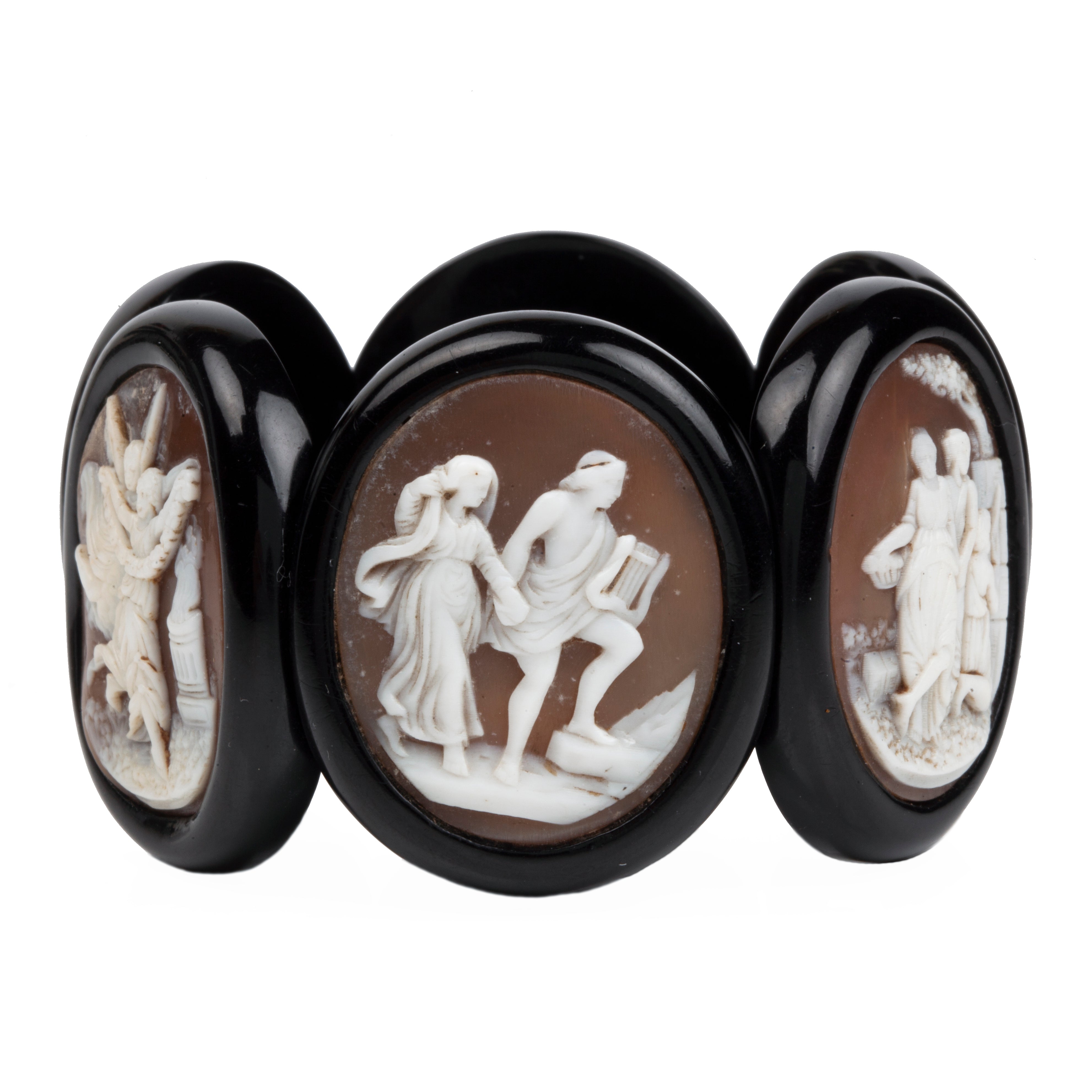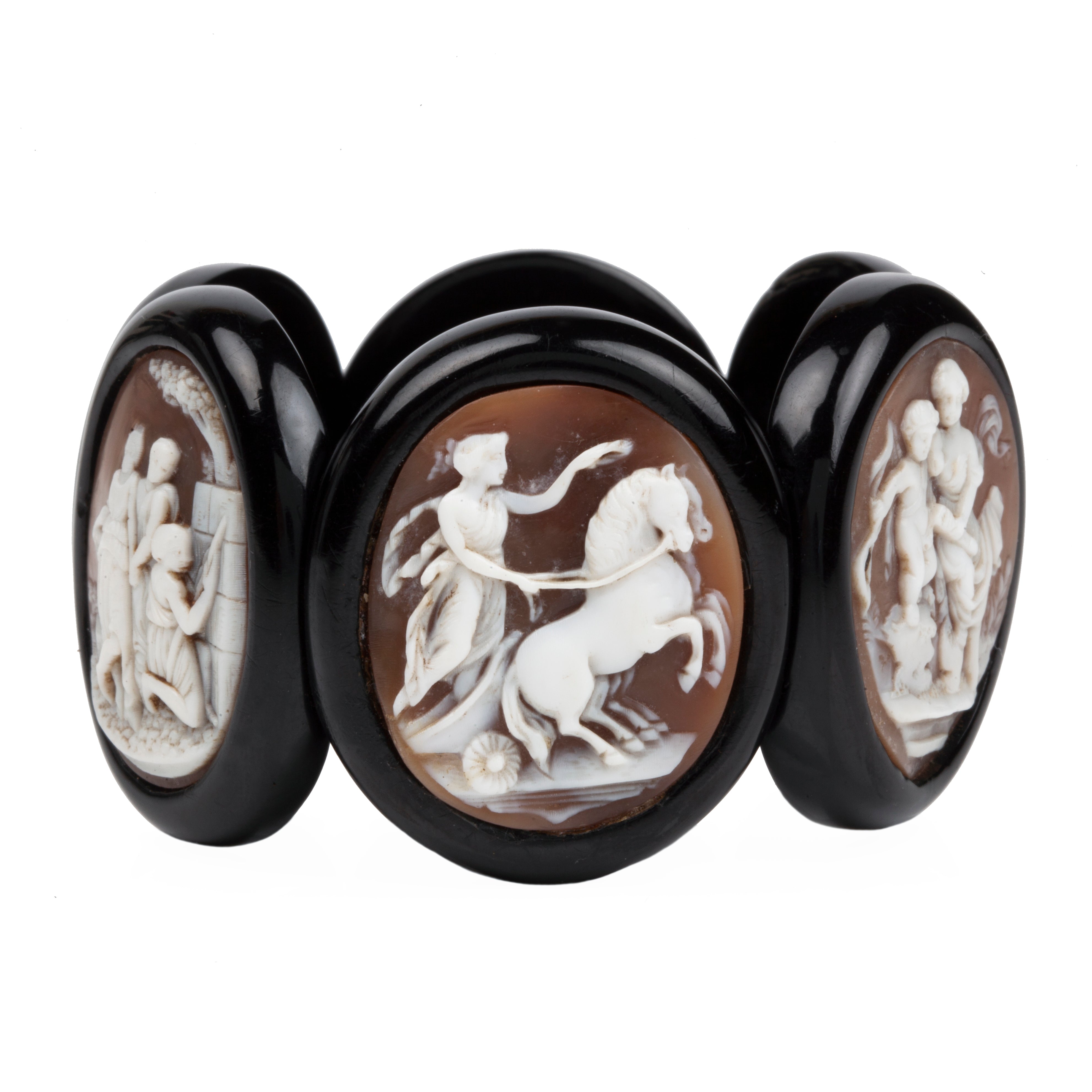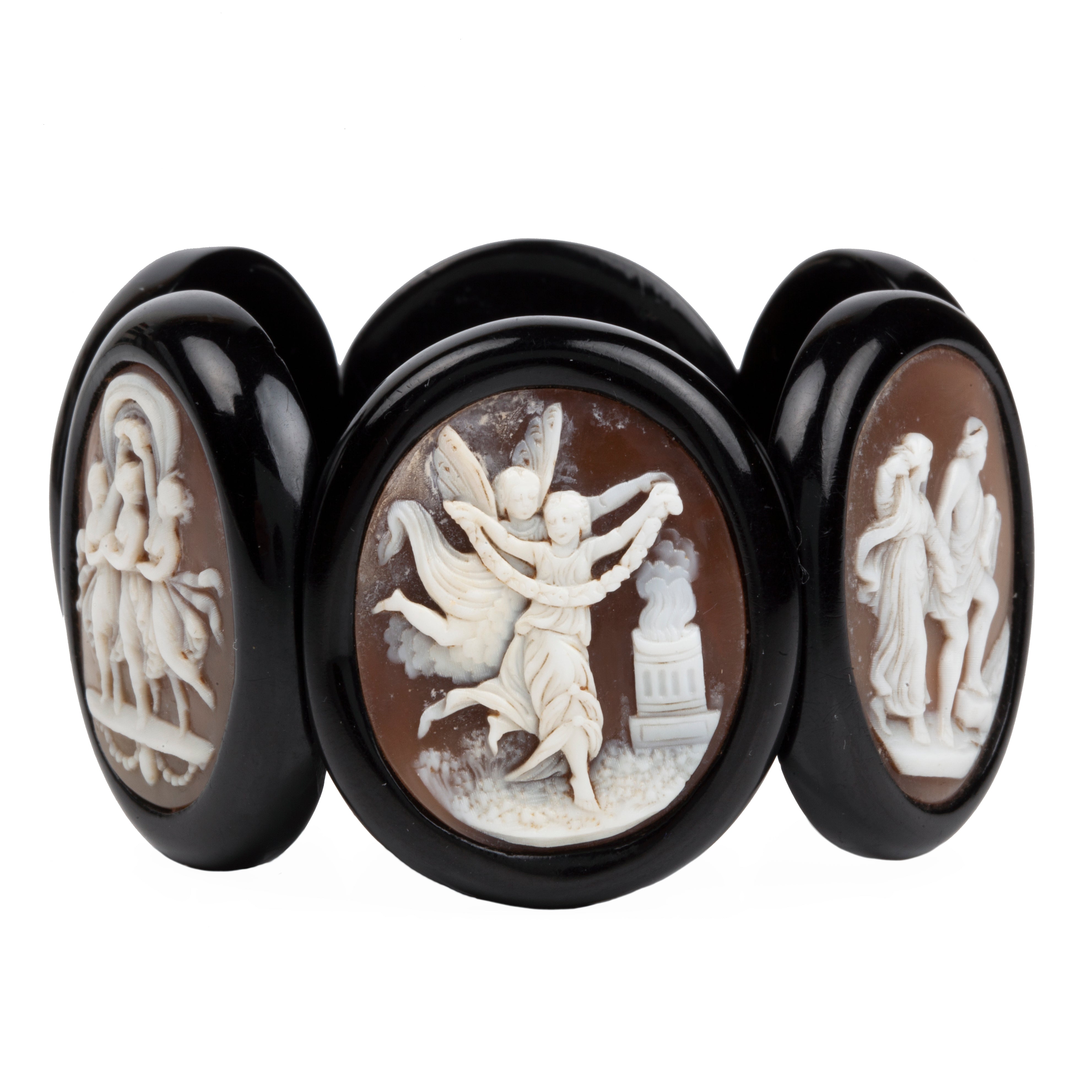 Rare Victorian era Whitby jet cameo bracelet. Each panel has individual carved hard shell cameo plaques. Carved panels are strung on stretch cord which was its original form. The best carvers in Whitby were sent to Naples, to train in the tradition of cameo carving. English in origin. Circa 1870.