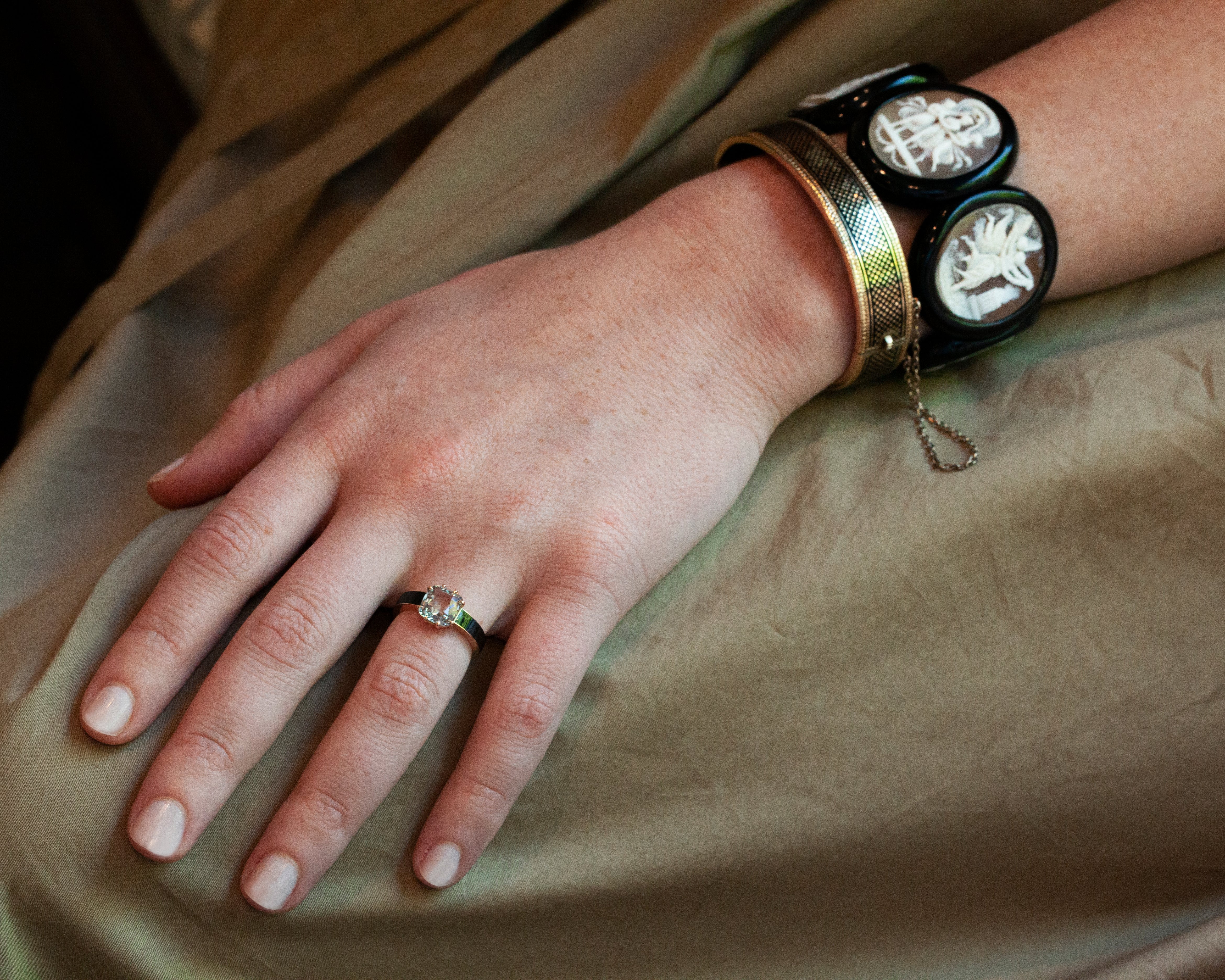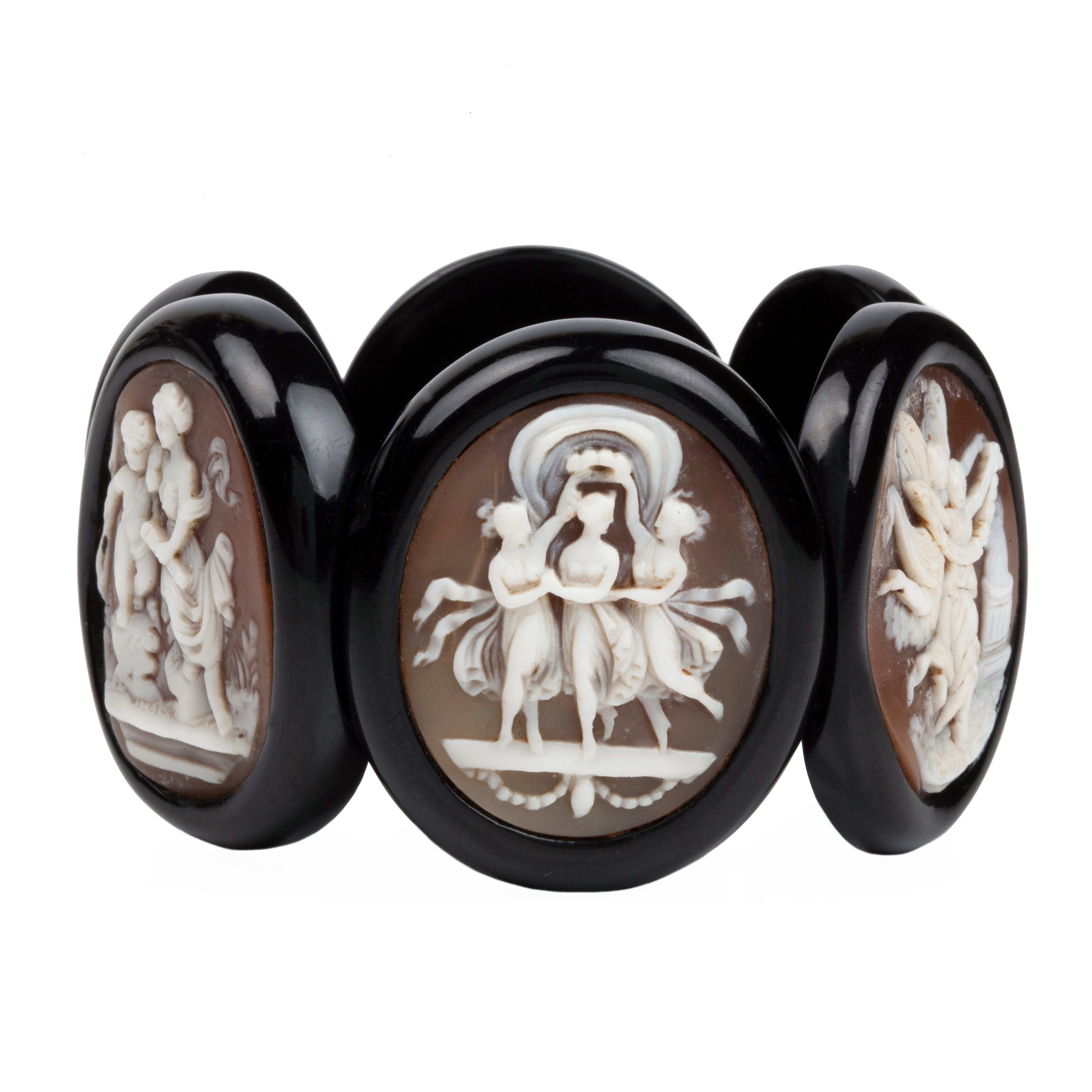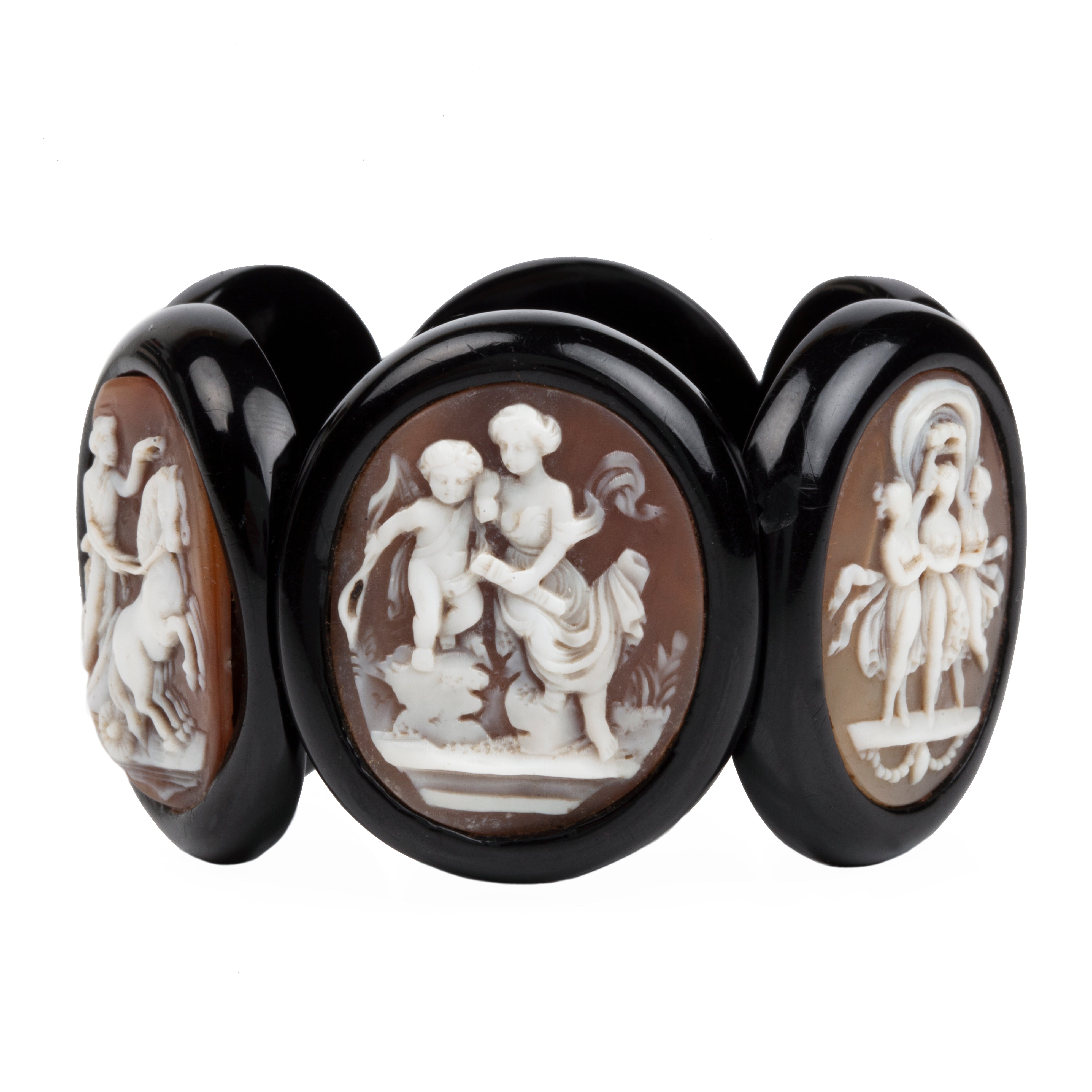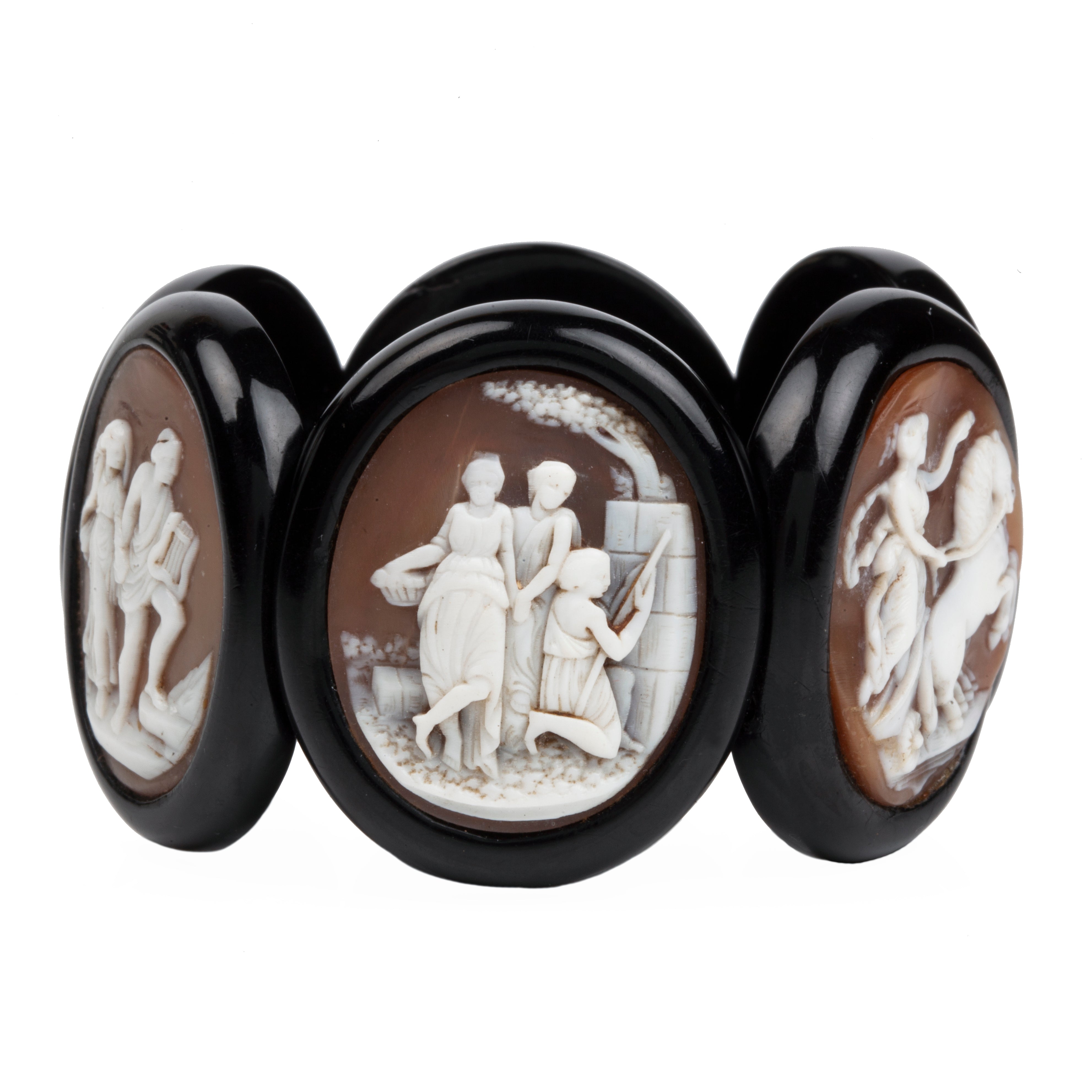 Rare Victorian era Whitby jet cameo bracelet. Each panel has individual carved hard shell cameo plaques. Carved panels are strung on stretch cord which was its original form. The best carvers in Whitby were sent to Naples, to train in the tradition of cameo carving. English in origin. Circa 1870.