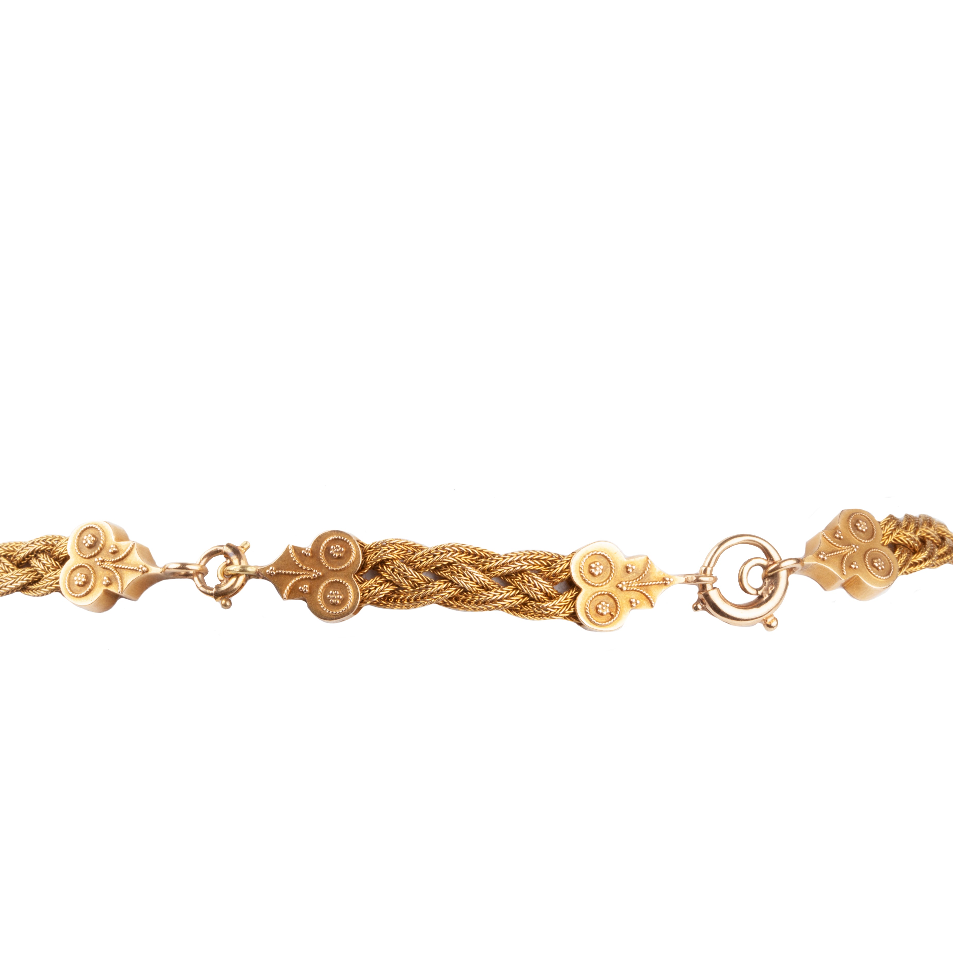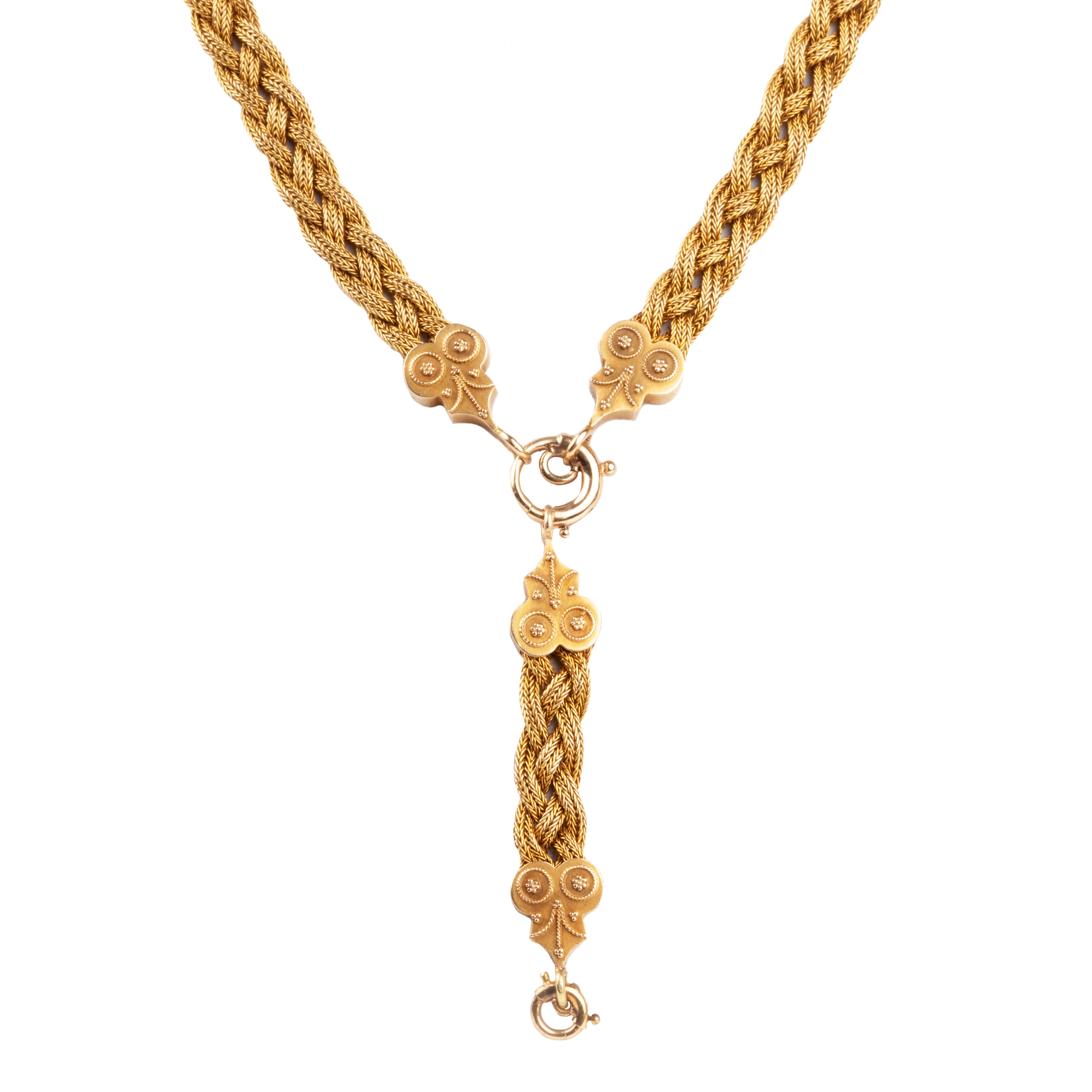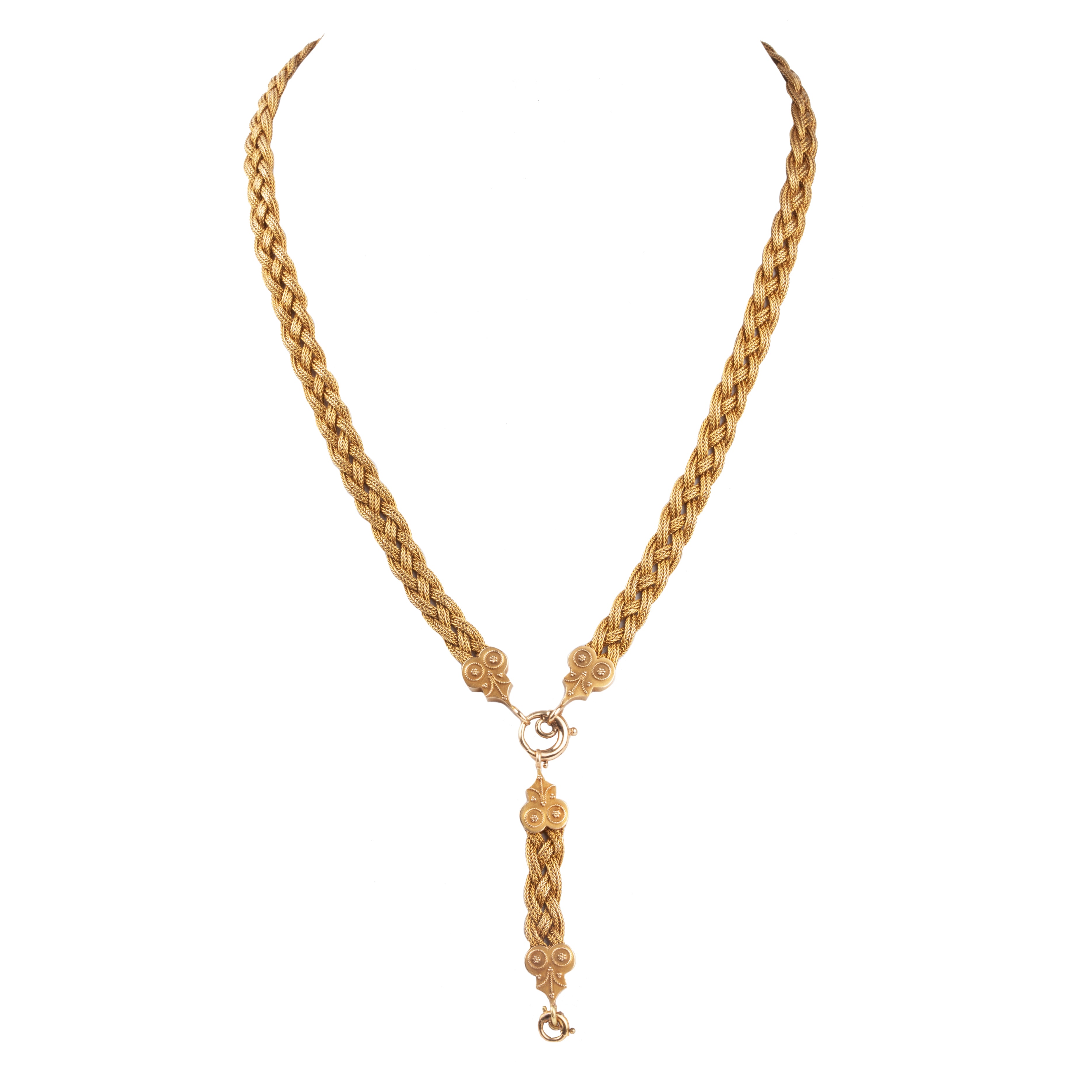 Victorian era woven chain, in 14k gold. Etruscan revival find details, with y drop extension. Necklace can be worn two different orientations. English in origin. Circa 1880.