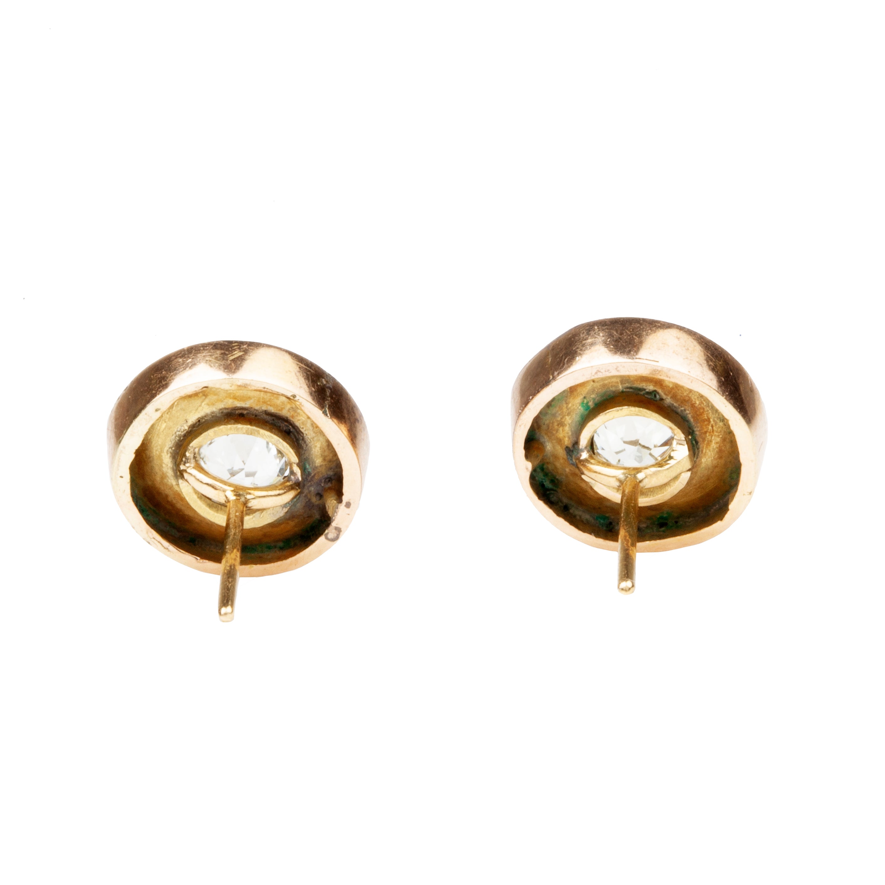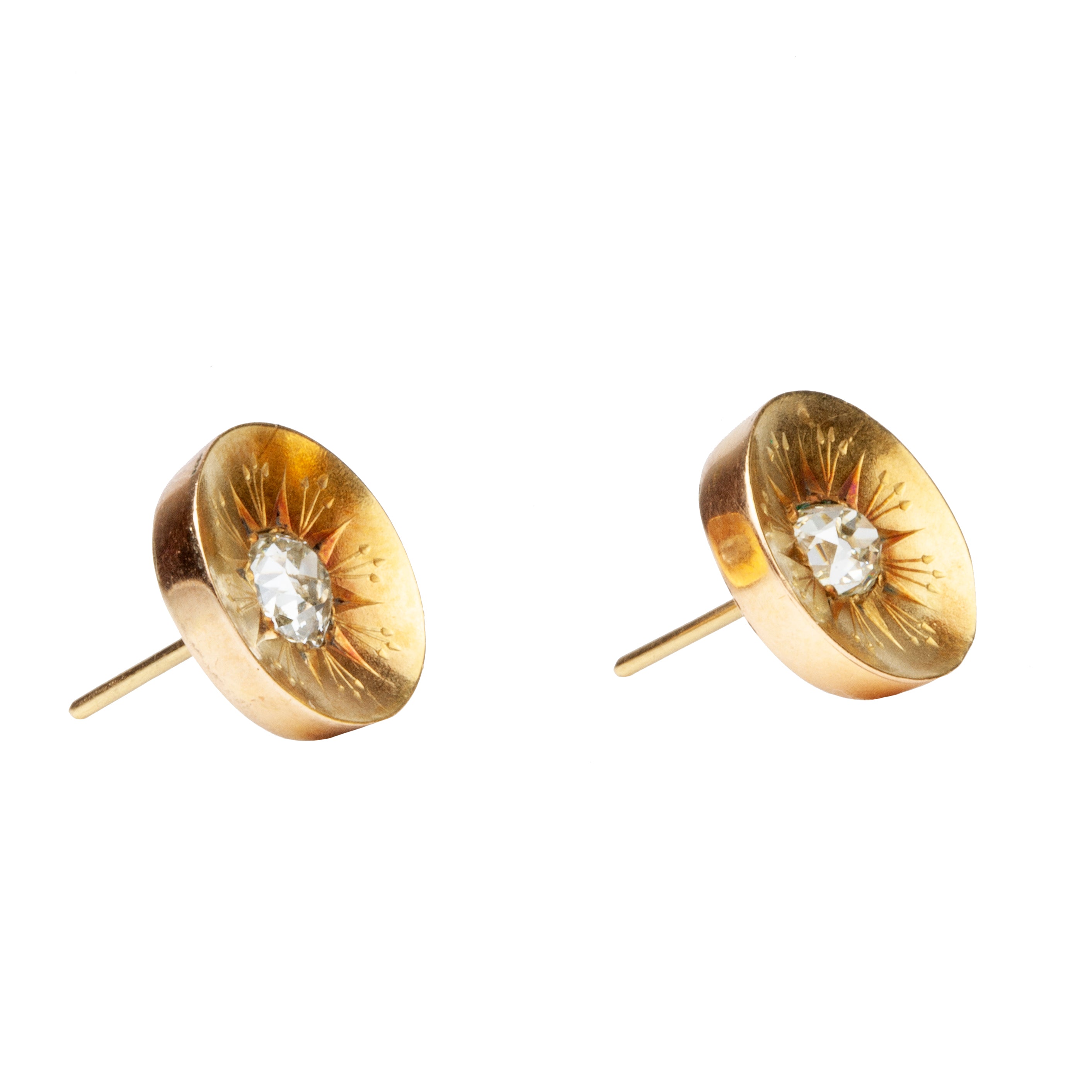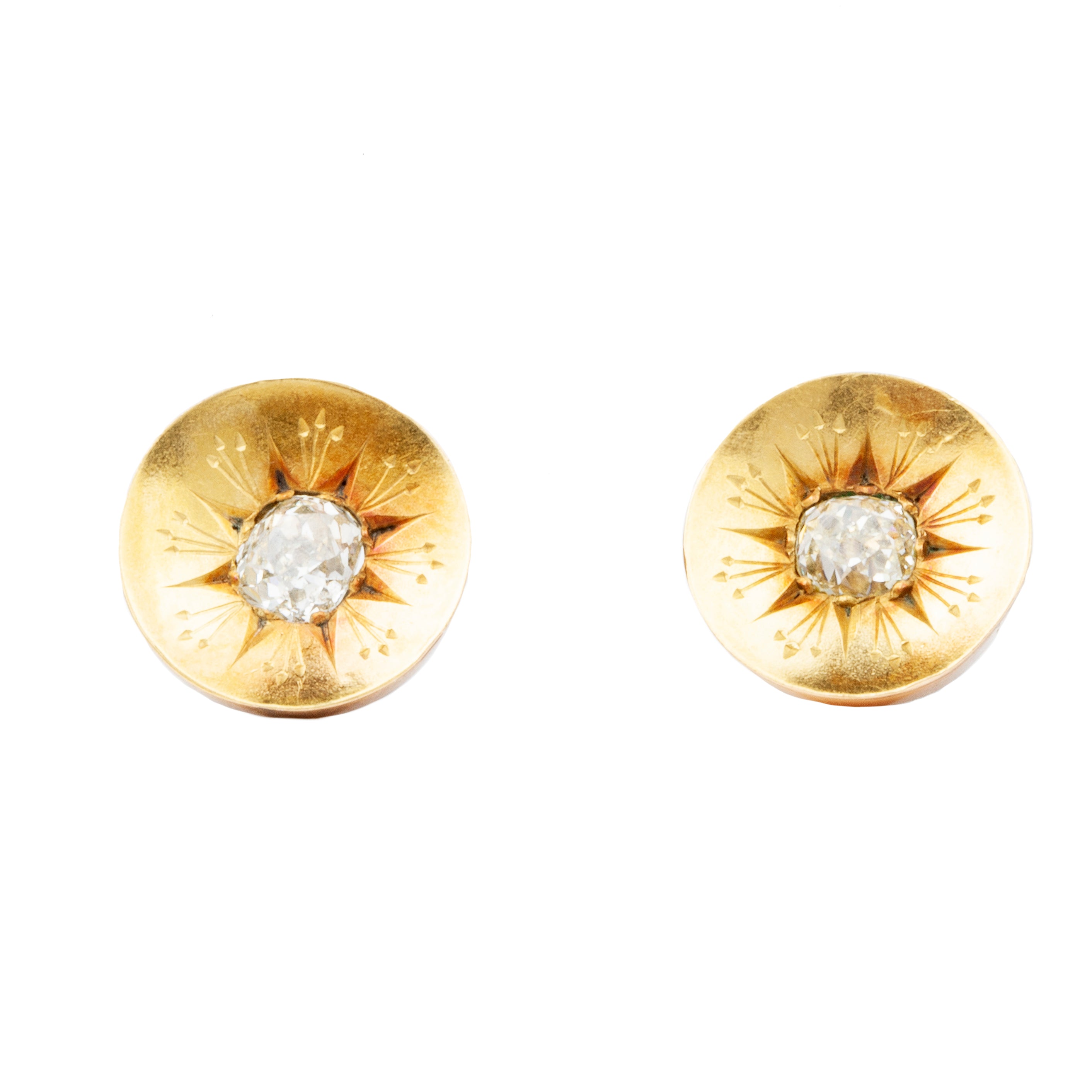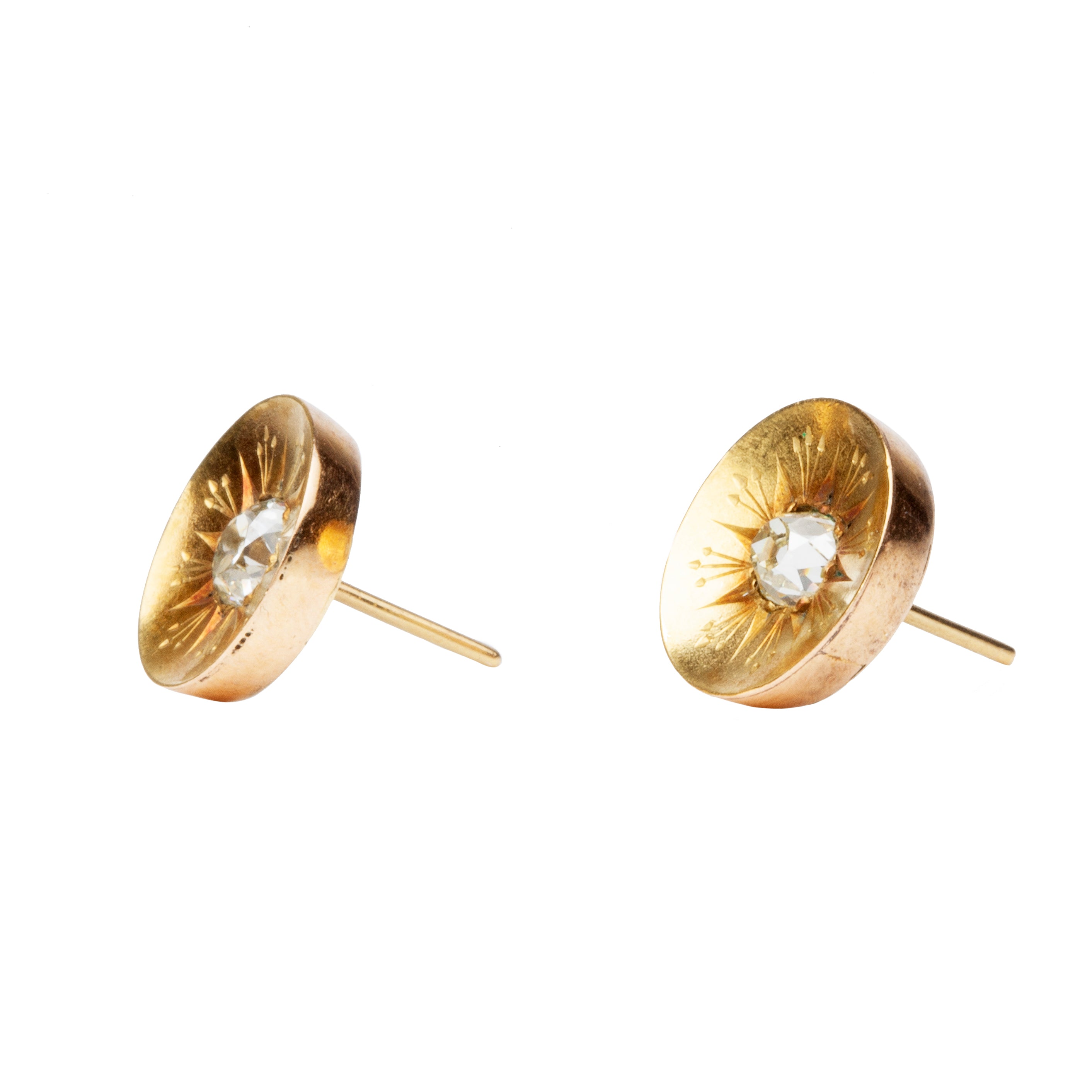Victorian era yellow old mine cut diamond earrings, in 18k gold. Approximately .25 carats each. Engraved starburst design. English in origin. Circa 1880.