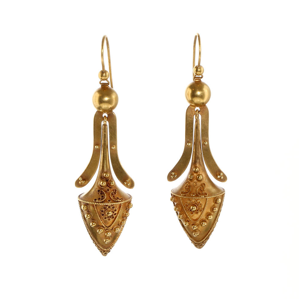 Victorian era 18k gold earrings in a classical urn form with great etruscan granulation details. The earrings are in their original form with a beautiful original bloomed patina. Circa 1870. English in Origin.