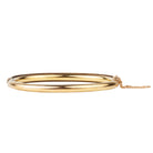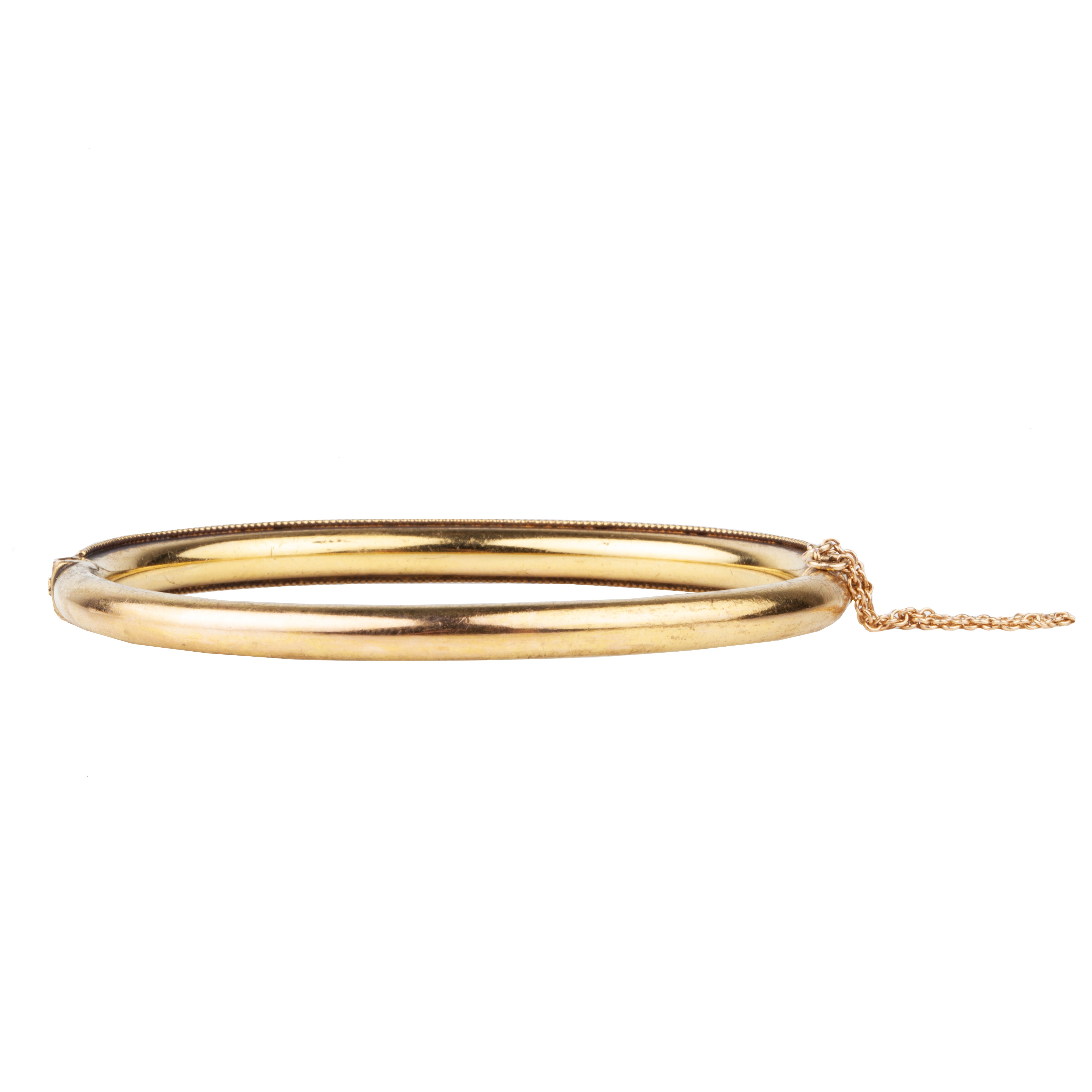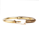Hinged at side with push button closure. .50" in width at the widest point with an inner circumference of approximately 6.25".